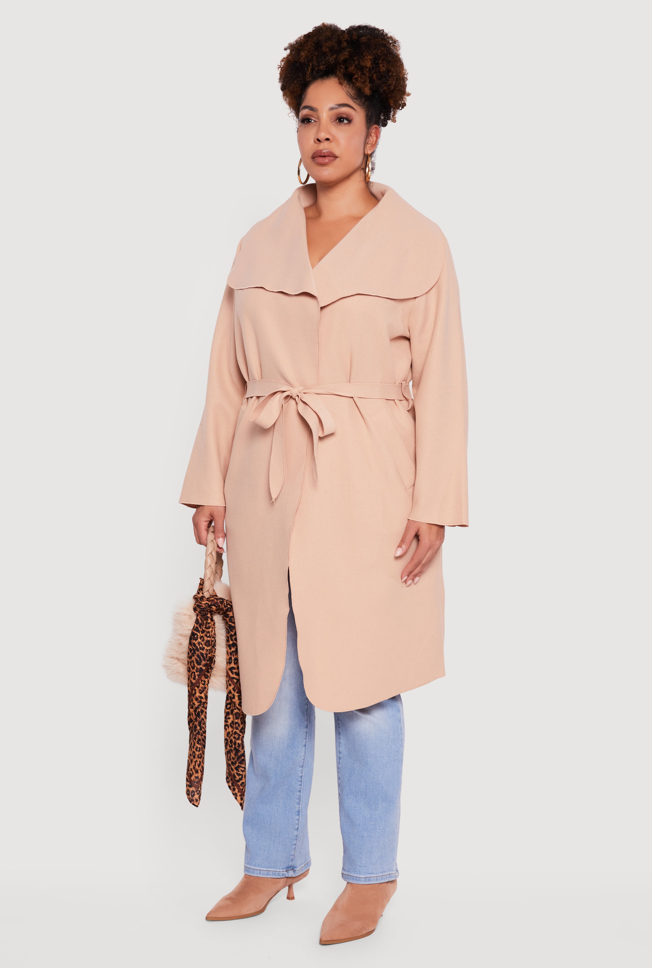 - Flattering plus size fit with a tie waist belt for shape and style