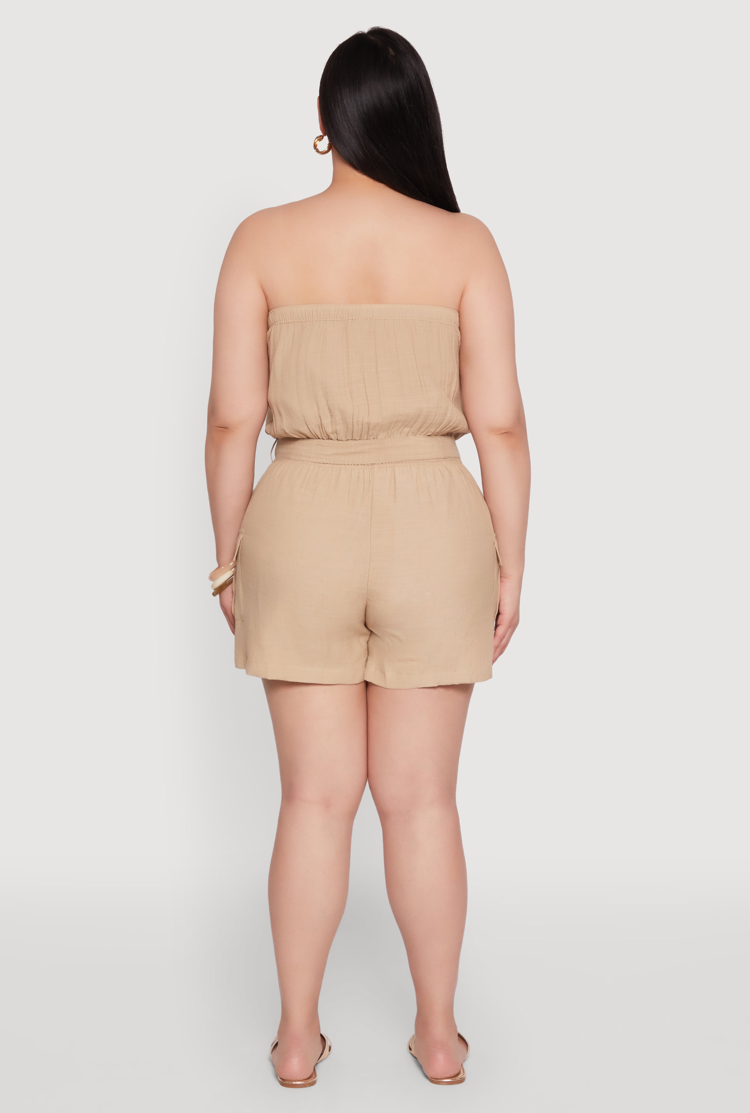 Looking for a chic, effortless look that turns heads? Our Plus Size Strapless Tie Waist Belted Romper with Faux Buttons is your new go-to for sunny days, casual outings, or just feeling fabulous. Crafted from breezy Gauze Knit, this romper combines comfort with style, featuring a strapless neckline and a flattering tie waist to accentuate your curves. The faux buttons add a touch of playful sophistication, while the cargo pockets bring a practical edge. Perfect for those who want to stay cool and look hot—this romper is your wardrobe's best-kept secret.