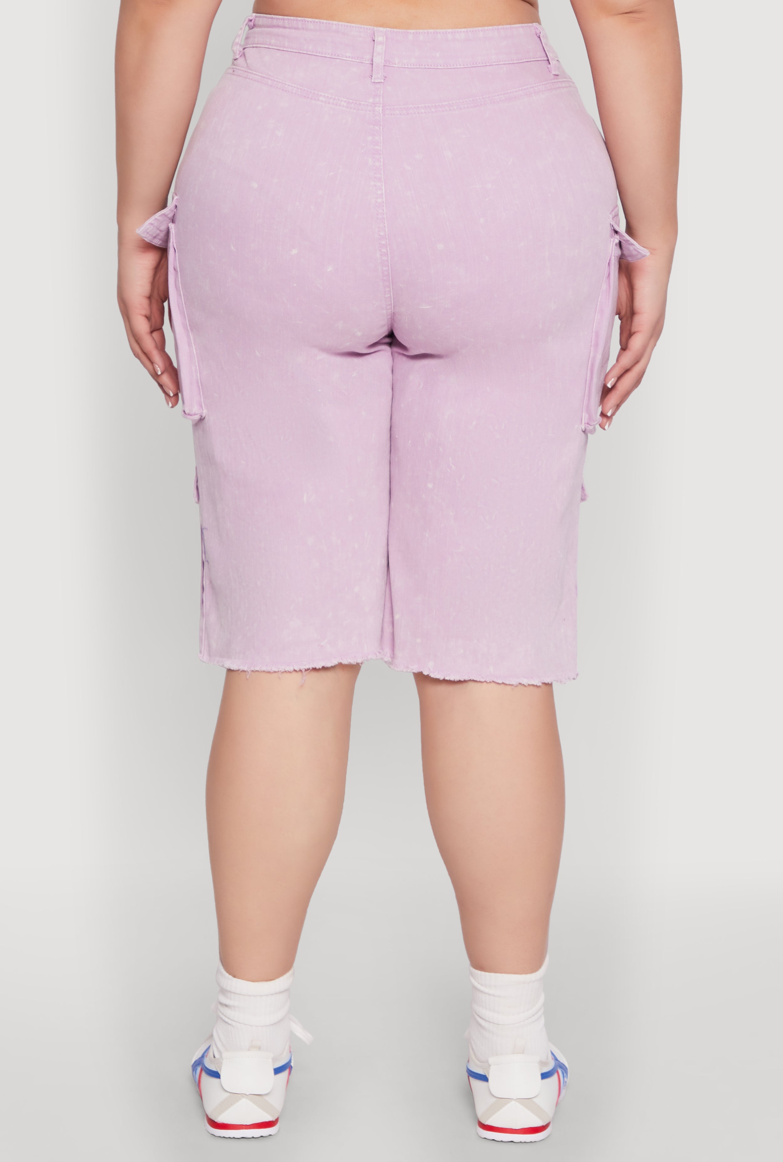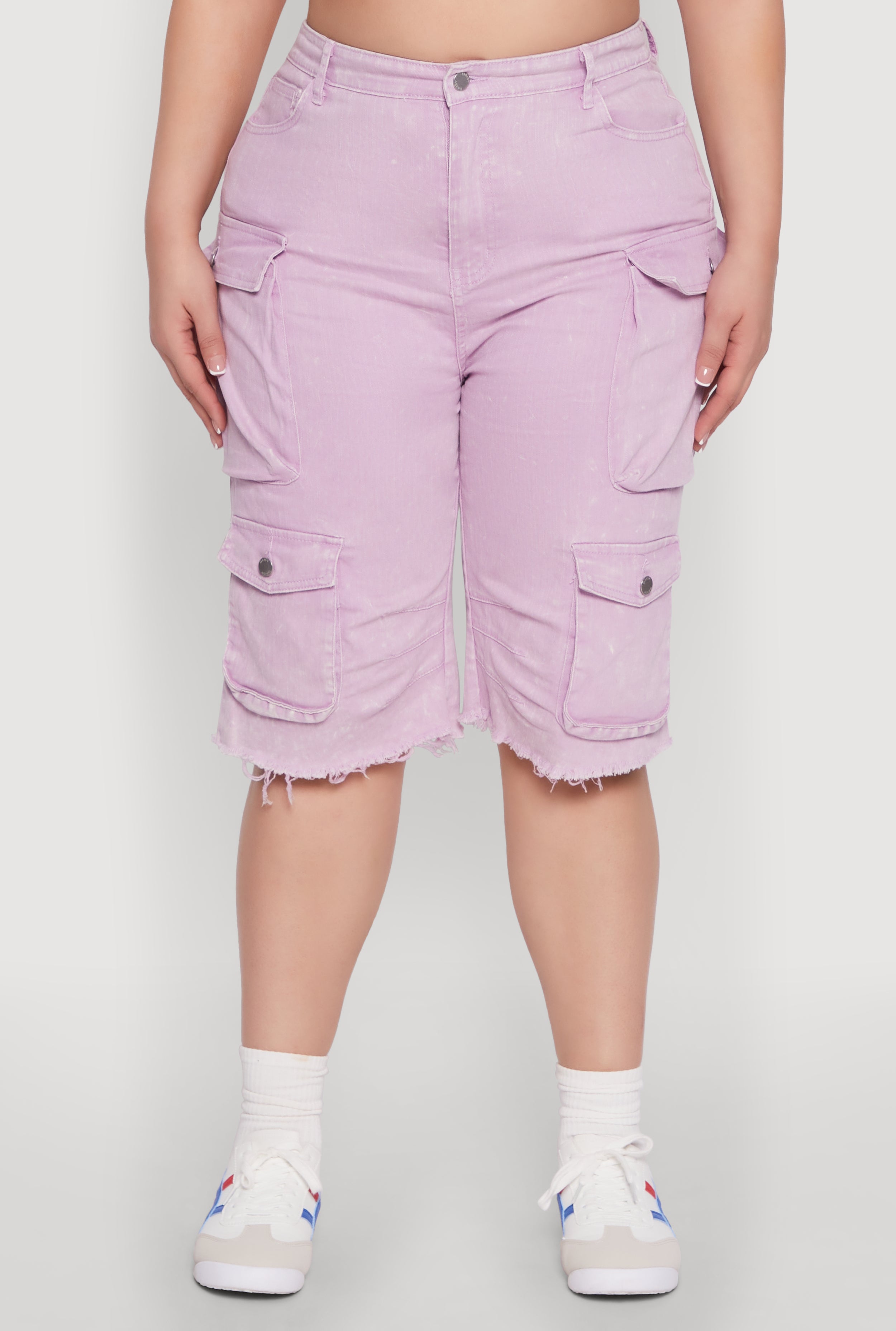 Step into effortless style with our Plus Size Daisy Acid Wash Cargo Bermuda Shorts. Designed for comfort and coolness, these high-waisted denim shorts feature a trendy acid wash finish and a raw hem that adds just the right edge. Perfect for sunny days or casual outings, they combine practicality with a touch of fun. Whether you're out shopping or hanging with friends, these shorts are your new go-to for laid-back, confident looks.