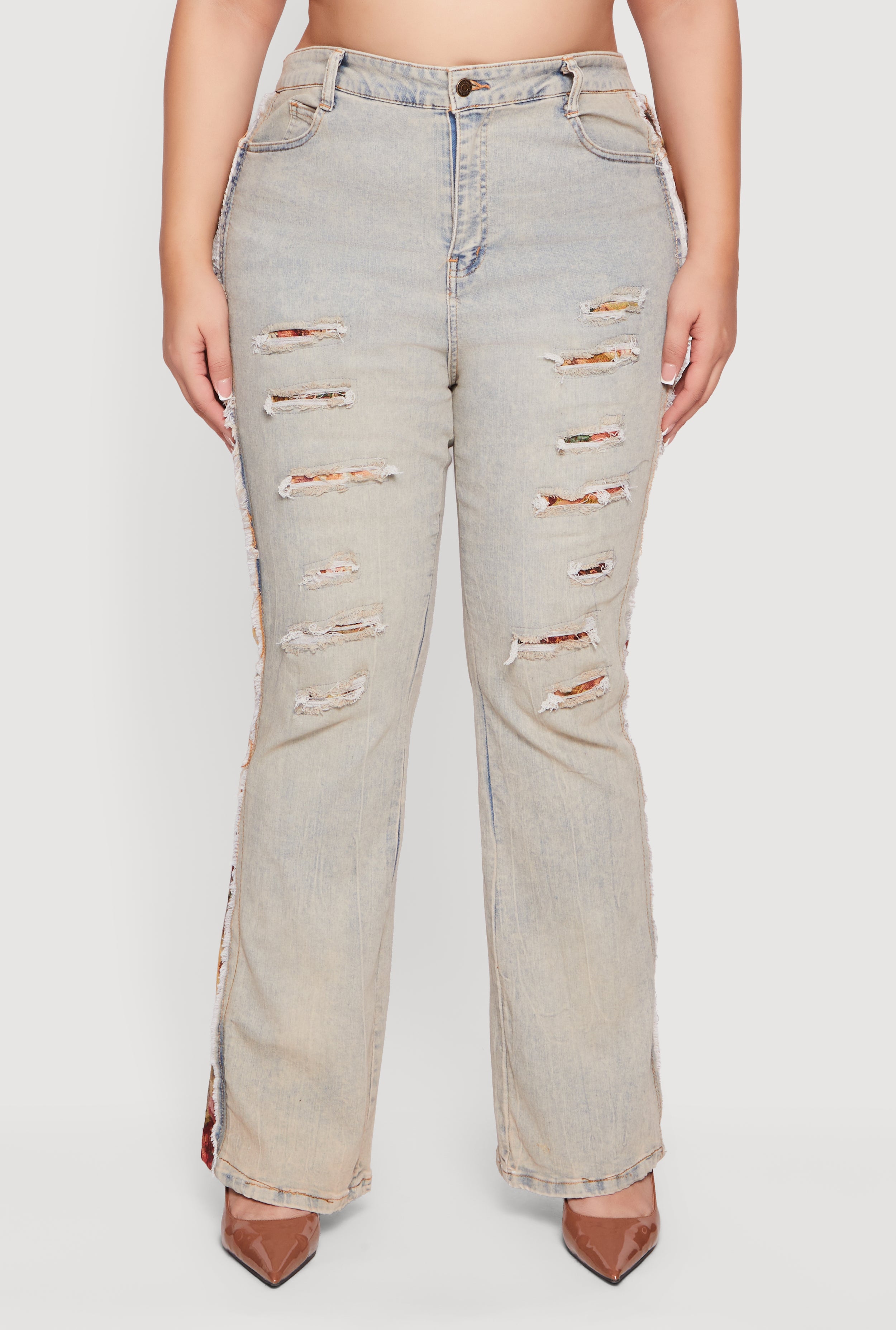 Step up your denim game with these Plus Size High Waisted Acid Wash Patch and Repair Jeans. Designed to flatter your curves with a classic fit and a trendy flare-leg silhouette, these jeans bring a fresh twist to your casual wardrobe. The high waist cinches your waist for a flattering shape, while the acid wash and patch detailing add an edgy, streetwear vibe. Perfect for everyday wear, these jeans combine comfort and style effortlessly.