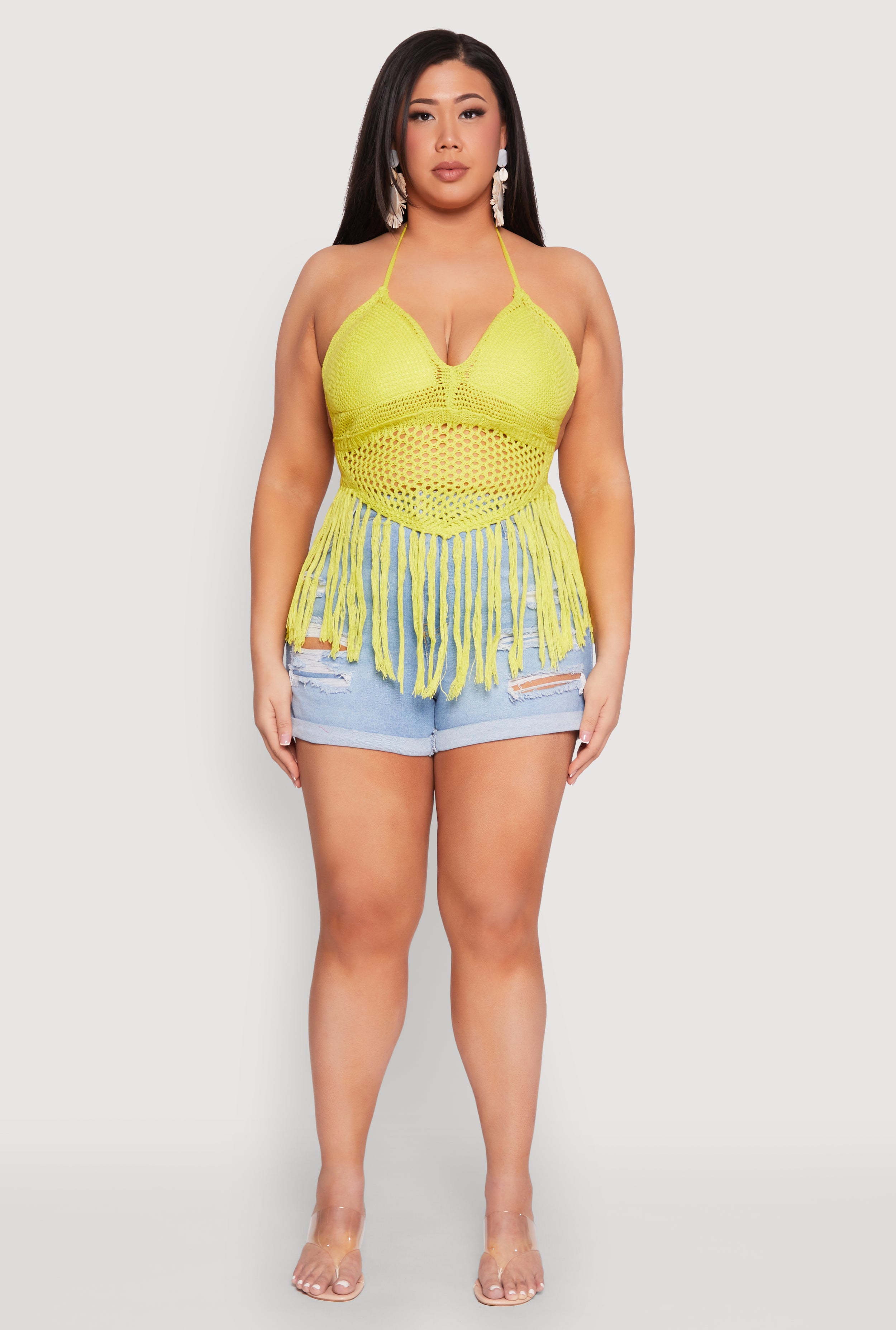 Get ready to turn heads with our Plus Size Tie Back Crochet Fringe Halter Top. Perfect for adding a boho-chic vibe to your wardrobe, this sleeveless top features a classic fit and timeless silhouette that flatters every curve. The crochet material and playful tassels give it a fun, flirty edge, while the cropped hem makes it ideal for pairing with high-waisted jeans or skirts. Whether you're hitting a festival or just want to feel effortlessly stylish, this top is your new go-to for a laid-back yet trendy look.