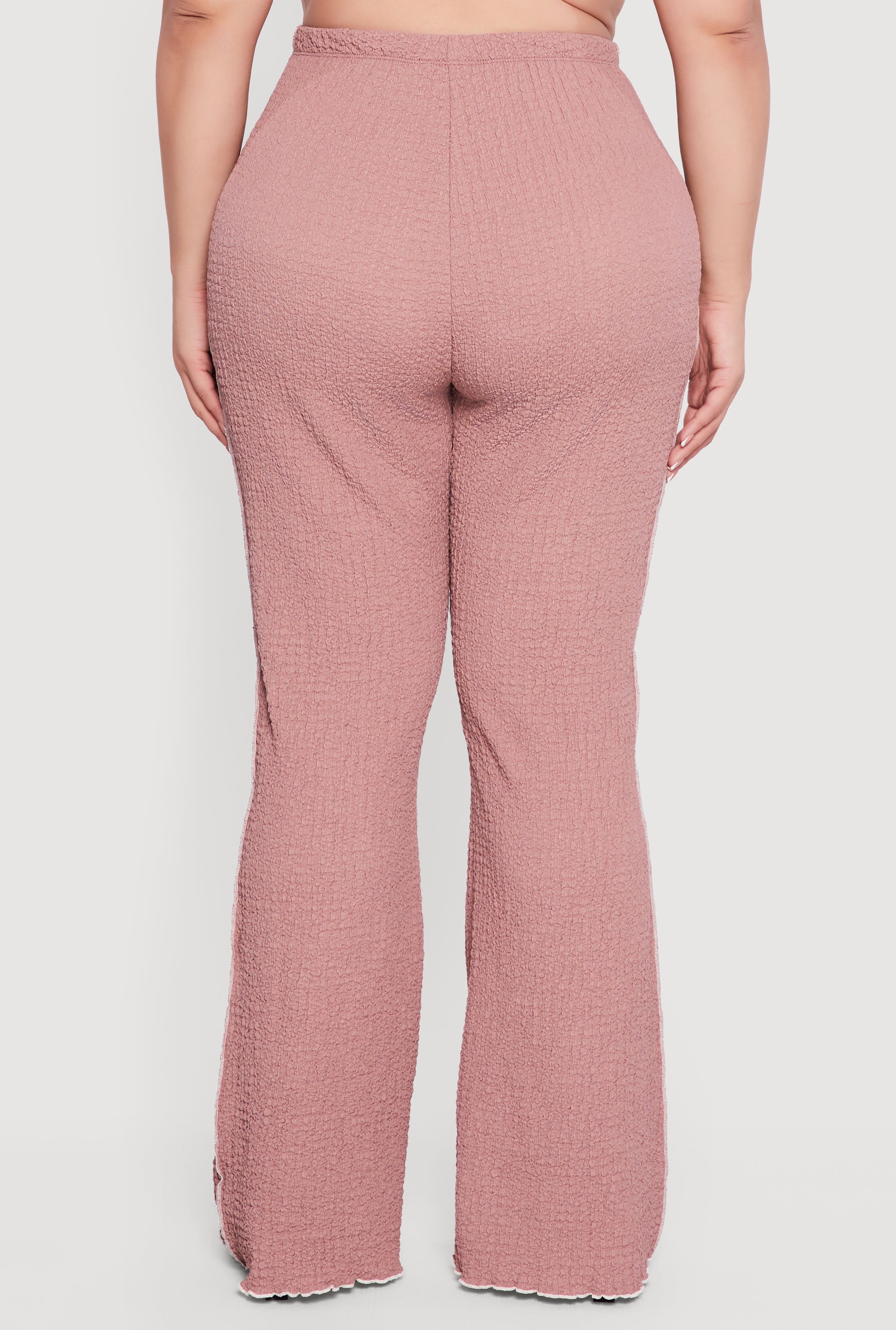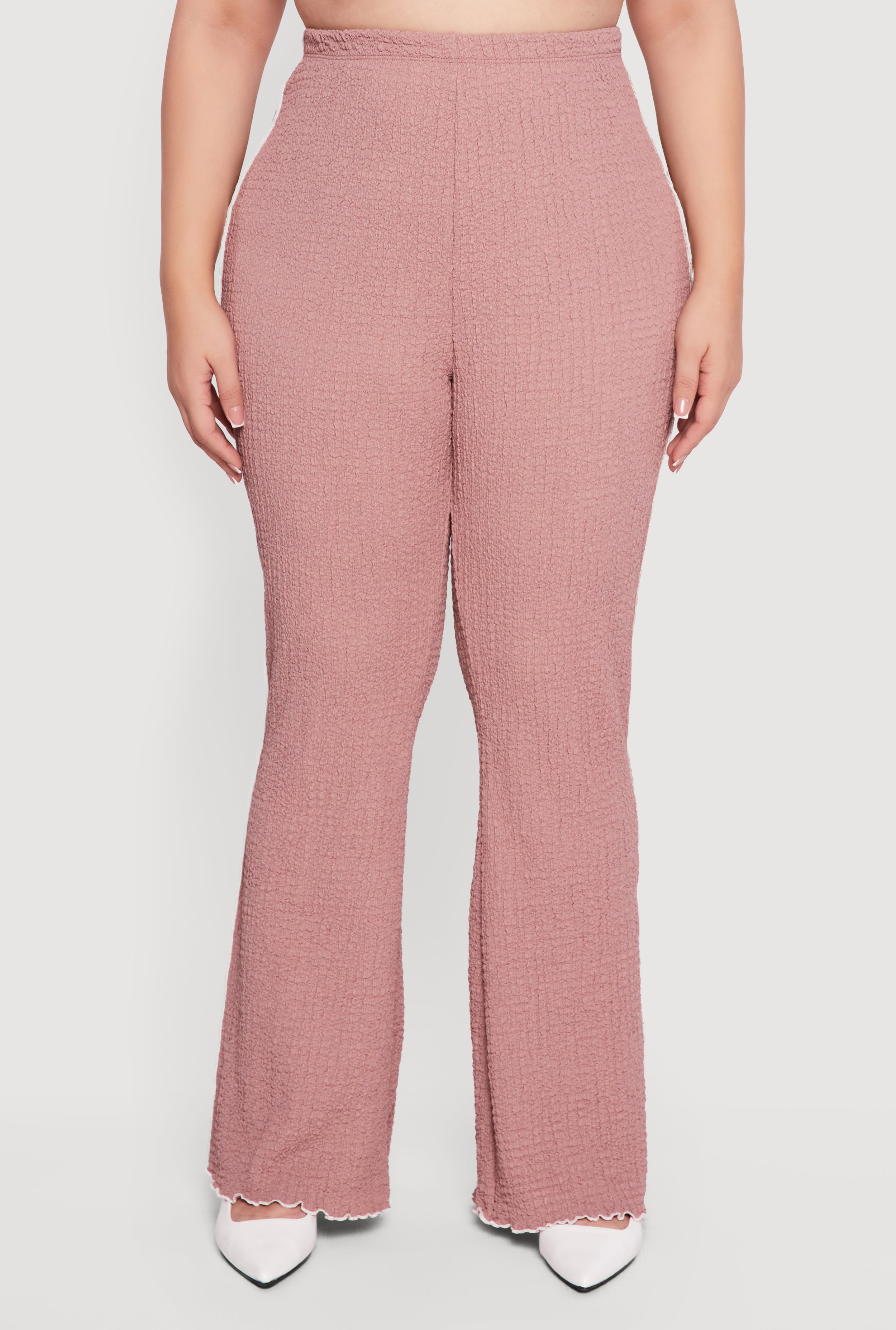 Step up your casual game with these Plus Size Textured Knit Contrast Trim High Waisted Pants. Designed to flatter your curves with a classic fit and high waist, these pants feature a trendy flare-leg silhouette and textured knit fabric for all-day comfort. The playful contrast trim and delicate lettuce edge add a fun, feminine touch that makes these pants a standout piece in your wardrobe. Perfect for effortless style that transitions from day to night with ease.