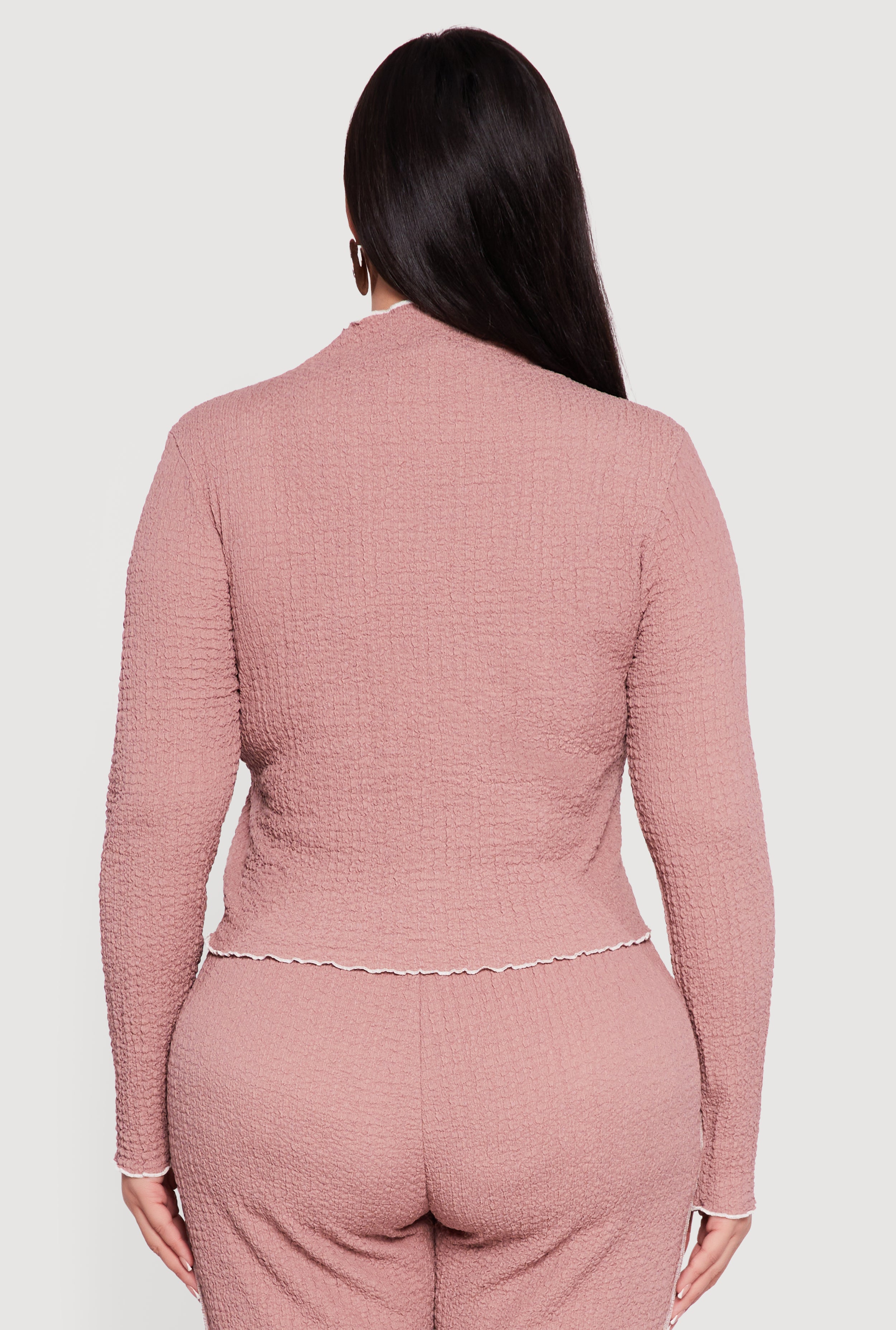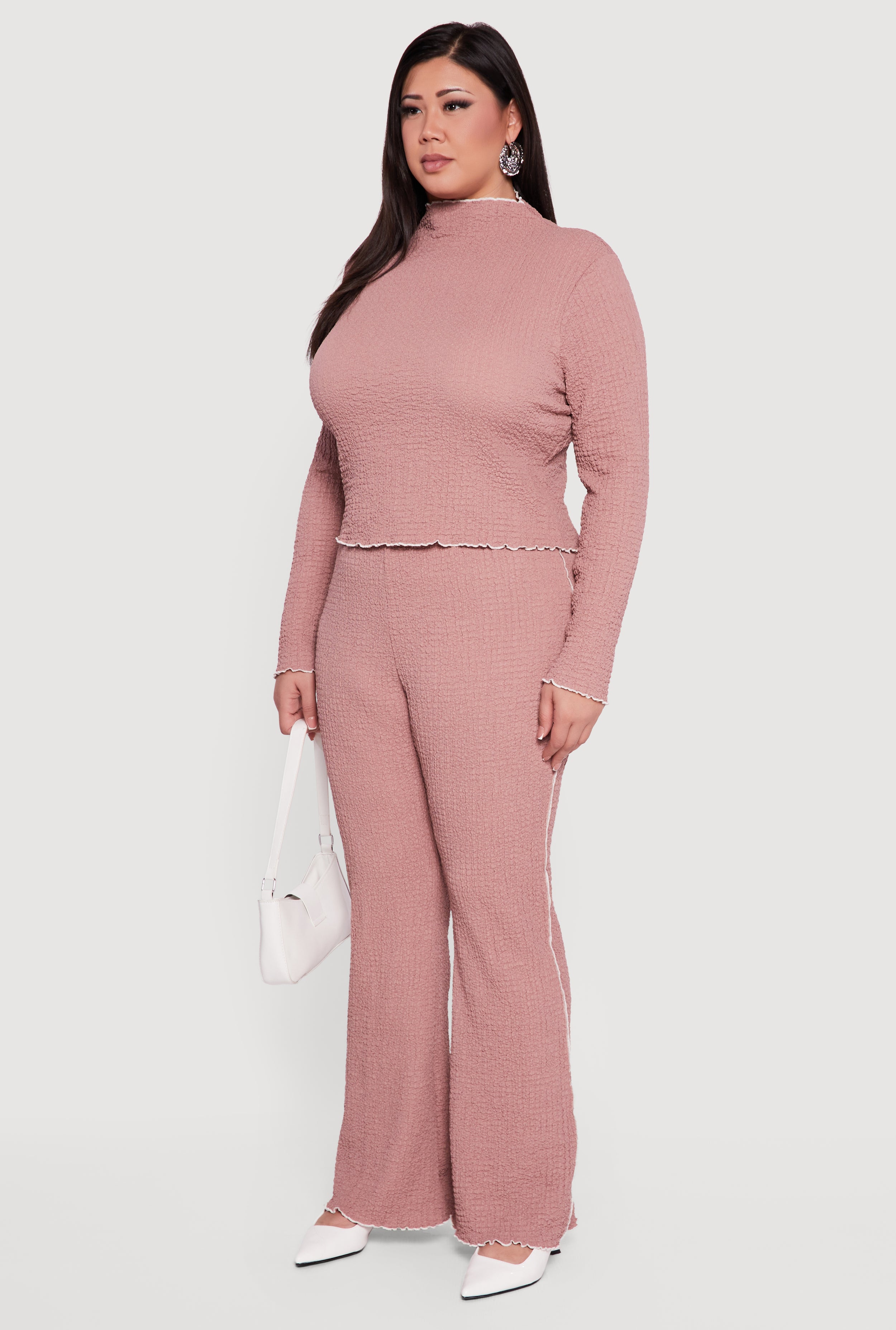 Elevate your everyday look with this Plus Size Textured Knit Contrast Trim Mock Neck Top. Designed with a classic fit and long sleeves, it offers a timeless silhouette that’s perfect for both casual days and officewear vibes. The textured knit fabric feels cozy and stylish, while the contrast trim and decorative stitching add a subtle pop of personality. The mock neck brings a chic touch without sacrificing comfort, making it an easy go-to for layering or wearing solo.