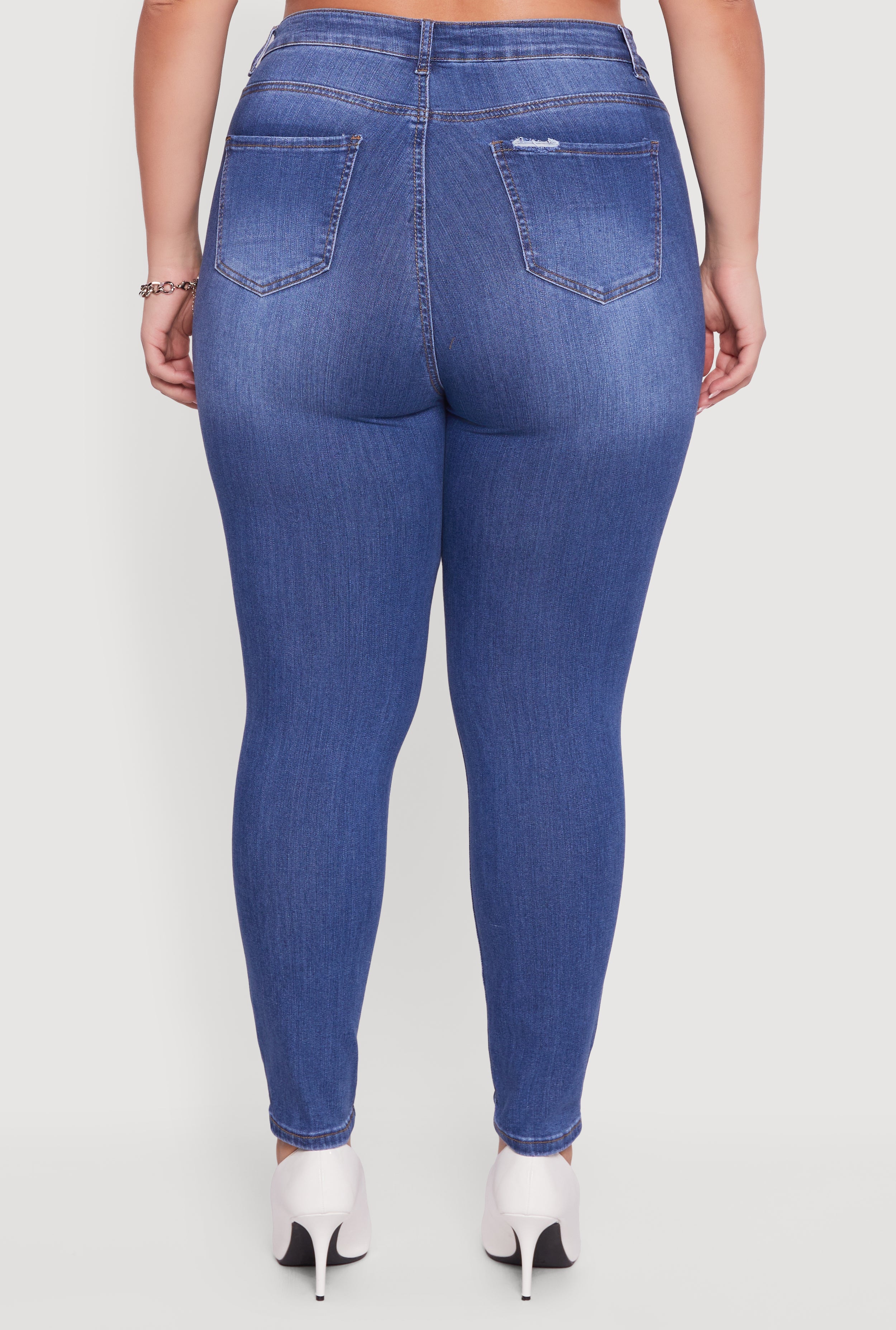 Step up your street style game with these Plus Size High Waisted Distressed Stretchy Skinny Jeans. Designed to hug your curves in all the right places, these ankle-length jeans blend comfort and edge with their stretchy denim fabric and trendy distressed details. The high waist not only flatters your silhouette but also pairs perfectly with crop tops and tucked-in tees for effortless casual vibes. Whether you're out with friends or running errands, these jeans are your new go-to for laid-back cool.