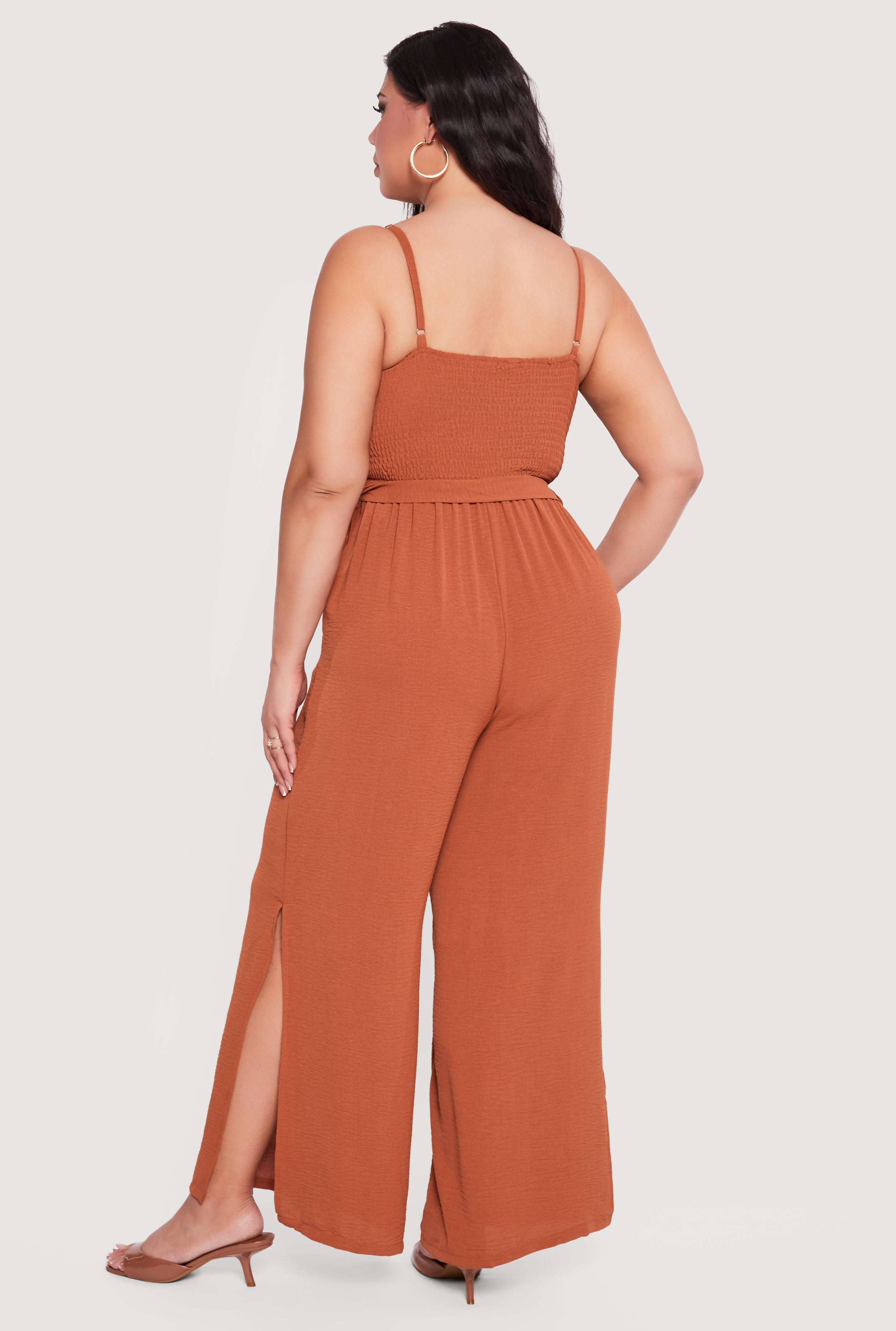 This jumpsuit features a scoop neckline with adjustable spaghetti straps and a smocked back for a flexible fit. The wide-leg pants flow to full length with side slits adding movement and style. A tie waist belt defines the silhouette, while padded cups provide subtle shaping in a soft crepe knit fabric.