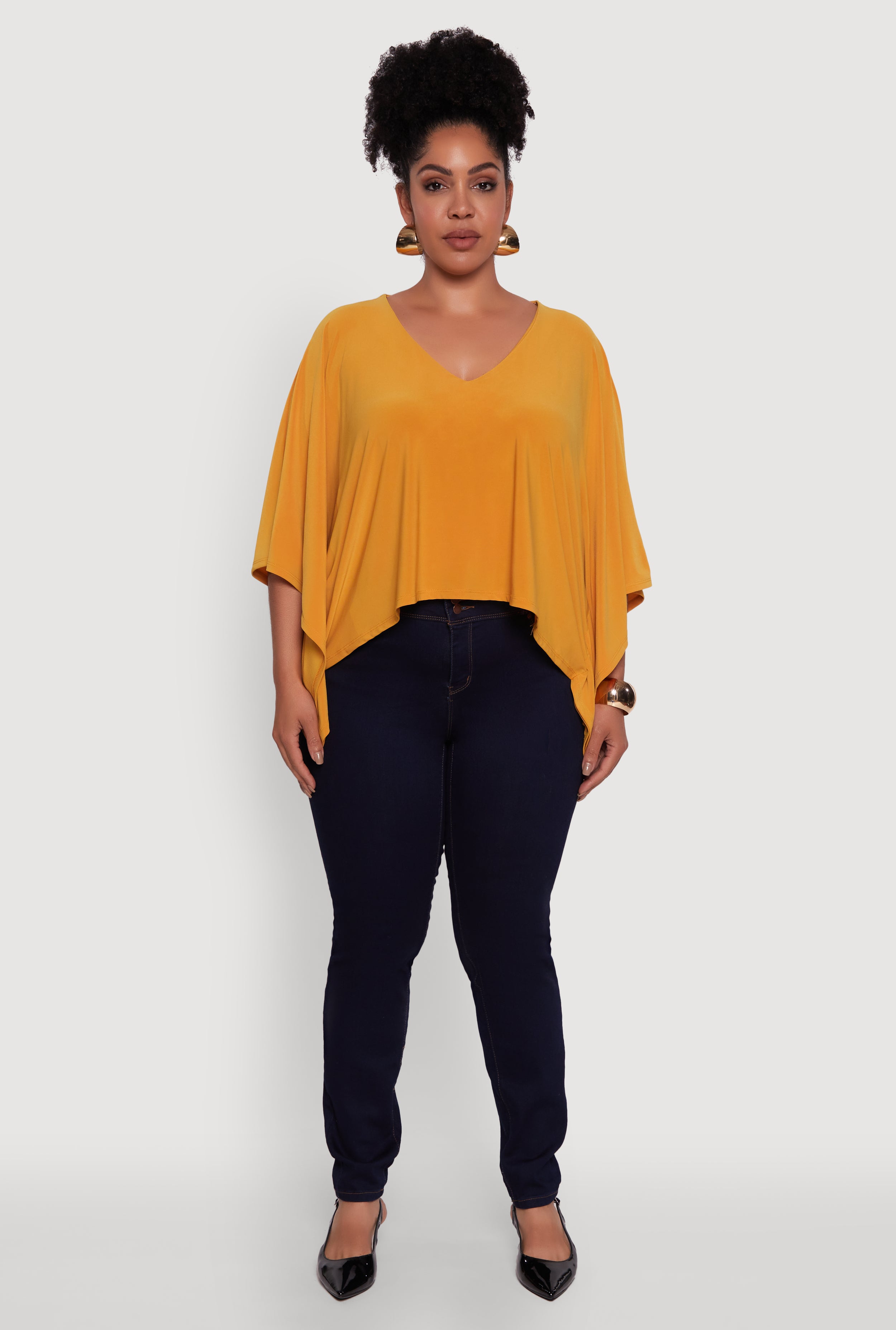 Step up your style game with this Plus Size Crepe Knit V Neck Crop Blouse, designed to bring effortless chic to your wardrobe. The classic fit flatters every curve while the 3/4 dolman sleeves add a trendy twist that keeps things fun and flirty. Perfect for dressing up or down, this blouse is your go-to for those days when you want to look polished without trying too hard. The soft crepe knit fabric feels as good as it looks, making comfort a top priority. Ready to turn heads? This crop blouse is here to make it happen.