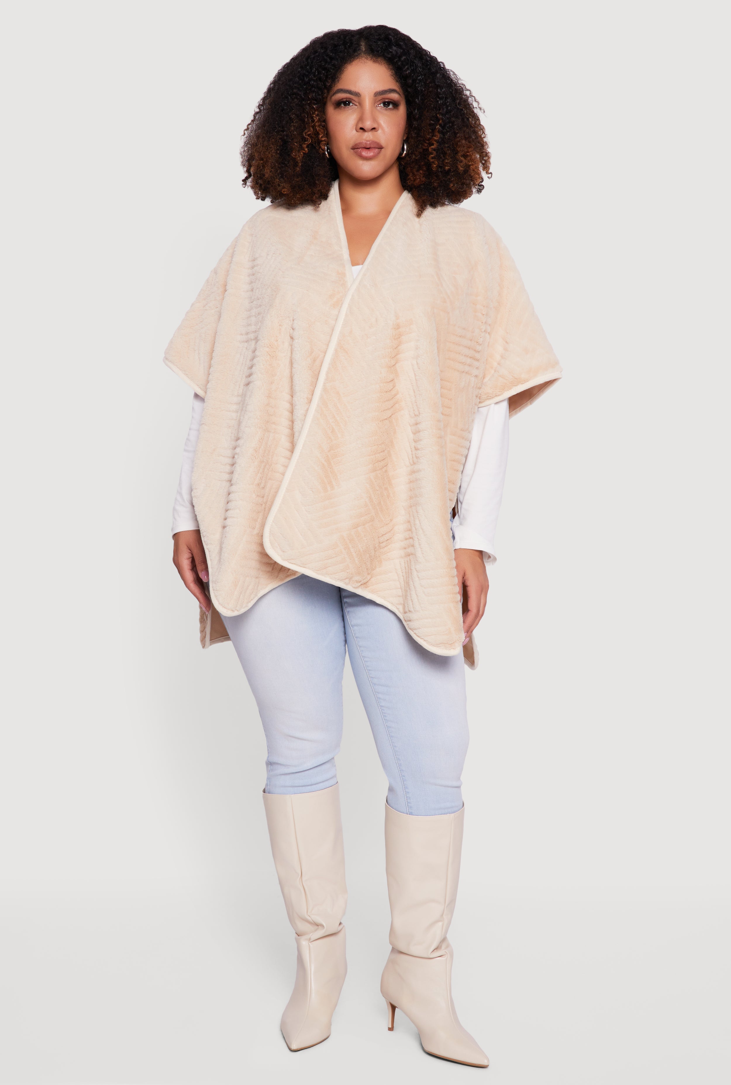 Wrap yourself in cozy luxury with this Faux Fur Open Front Poncho designed for effortless style and comfort. Featuring a relaxed fit that flatters every curve and a collarless design for a sleek, modern look, this poncho is your go-to layering piece for casual days. The soft faux fur fabric adds warmth and a touch of glam, while the open front makes it easy to throw on and go. Available in one size that fits XS to 4X, it’s perfect for embracing your unique shape with confidence.