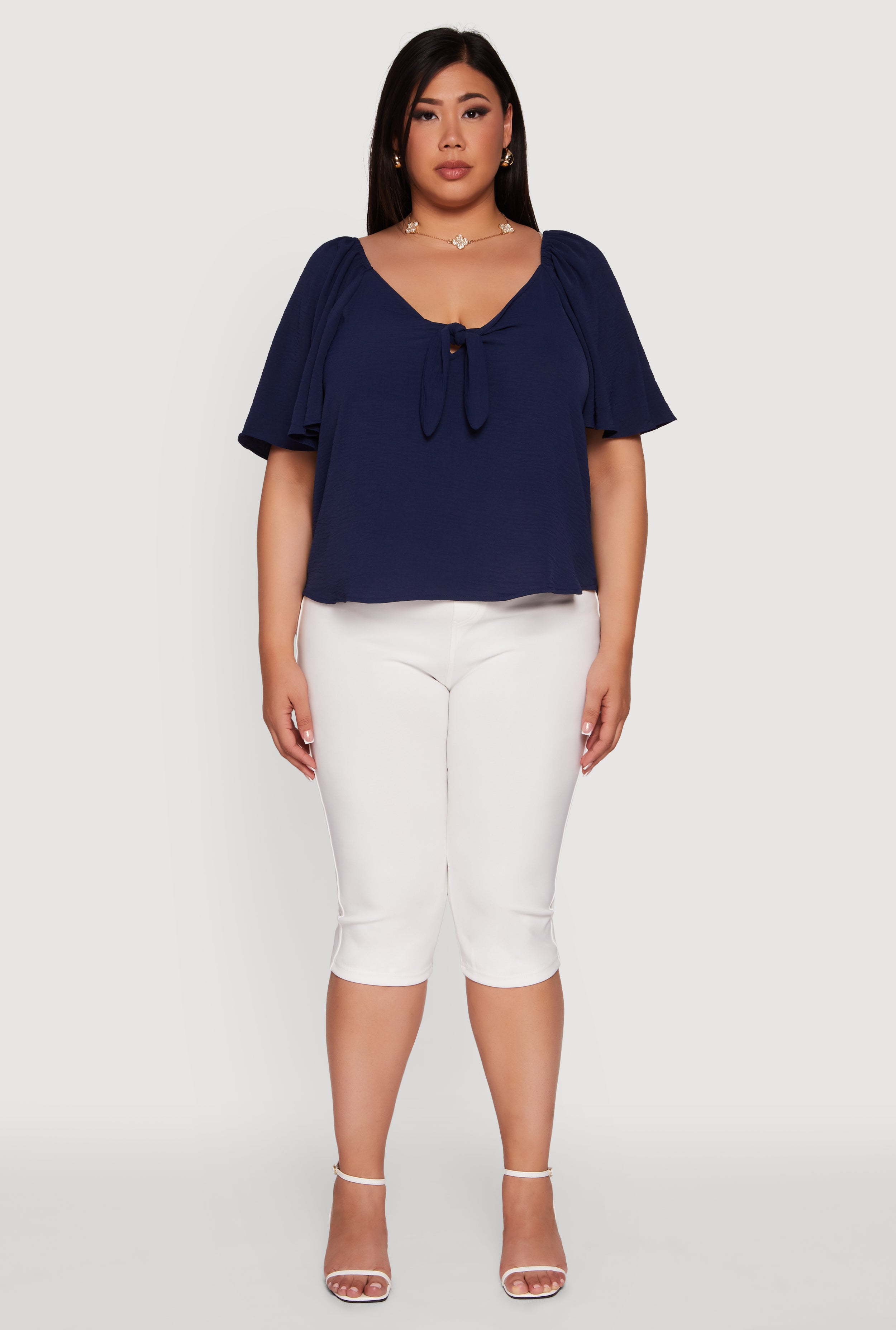 Step into effortless style with this Plus Size Tie Front V Neck Flutter Sleeve Blouse. Designed to flatter every curve, its classic fit and playful tie front create a timeless silhouette that feels as good as it looks. Whether you're heading to the office or packing for a casual getaway, this blouse brings a fresh, breezy vibe to your wardrobe. The flutter sleeves add a fun, flirty touch while the V-neckline keeps things cool and chic. Ready to turn heads without trying too hard? This is your new go-to top.