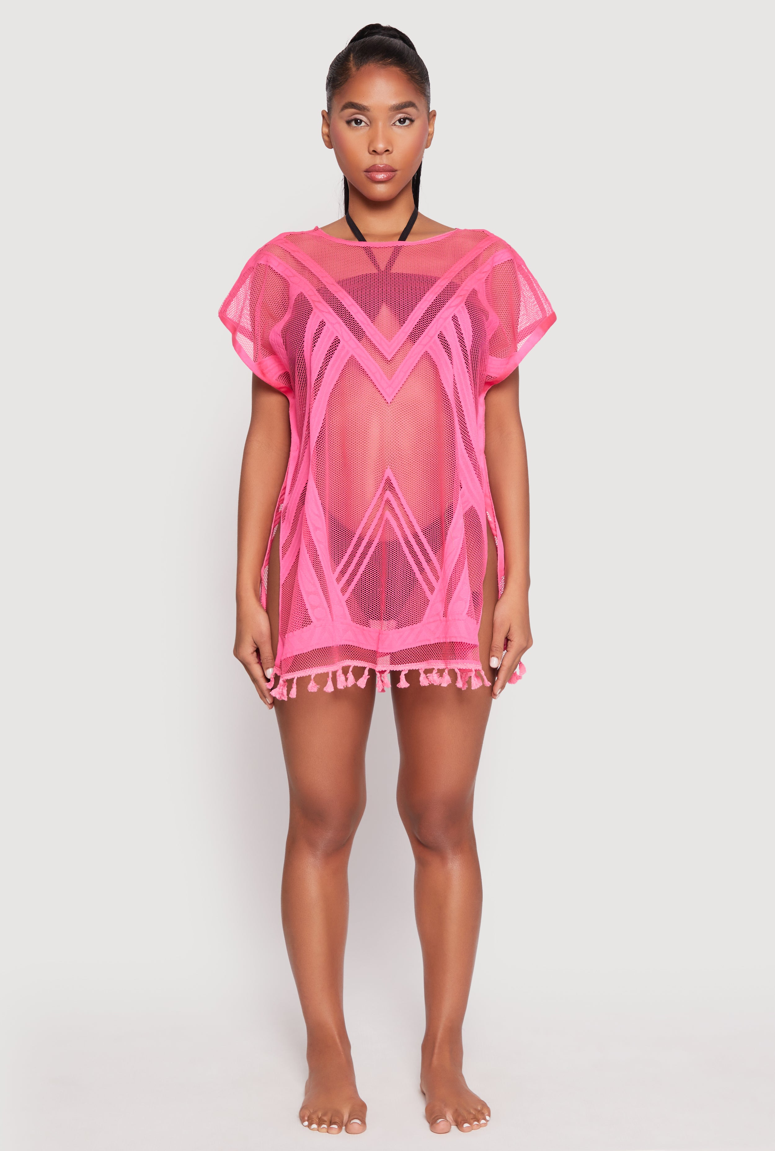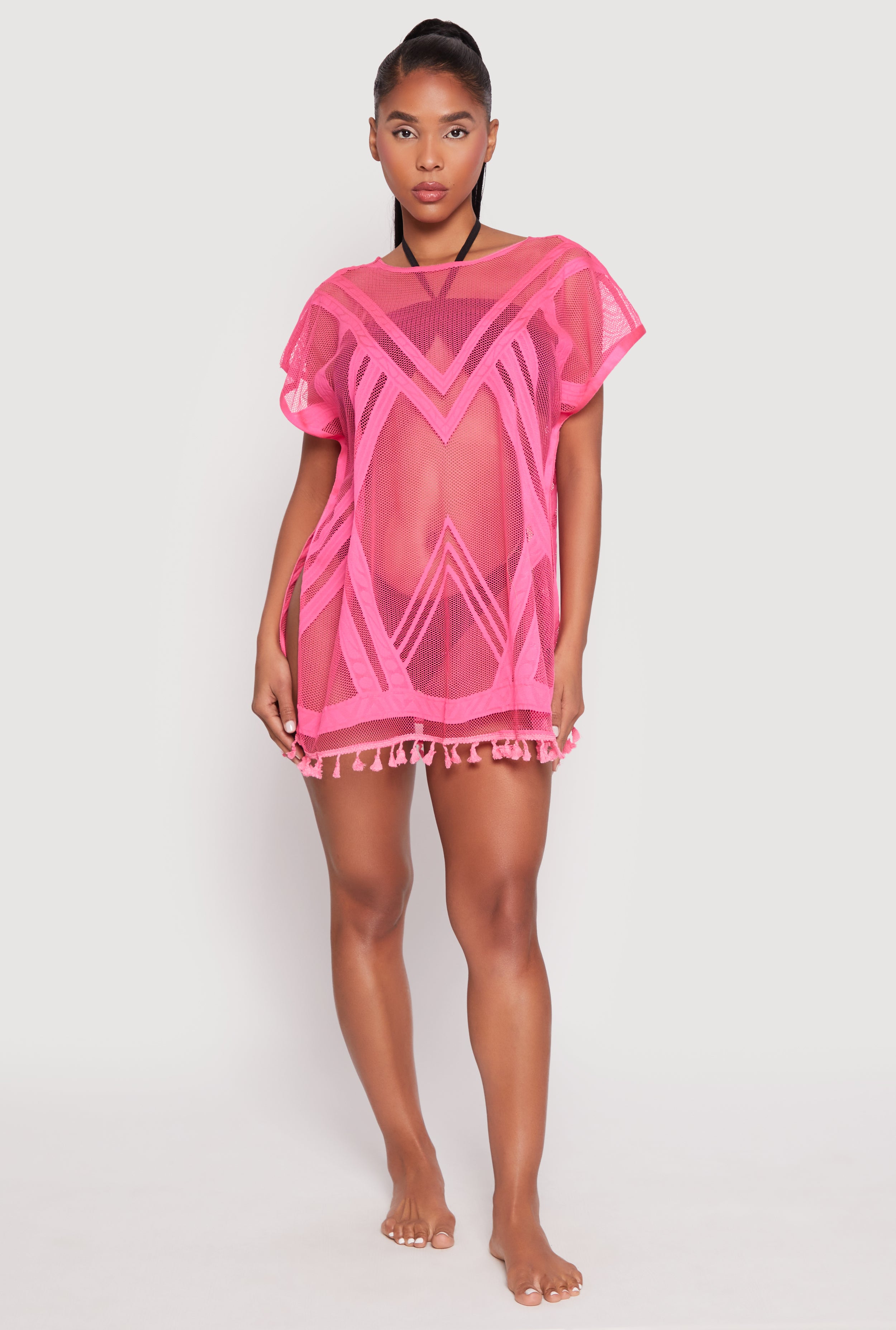 Get ready to turn heads at the pool or beach with our Fishnet Tassel Fringe Swim Cover Up. This stylish piece combines playful tassels and a trendy fishnet design, making it perfect for adding a touch of glamour to your swimwear look. Its relaxed fit and short dolman sleeves ensure you stay comfortable while looking effortlessly chic. Whether you're lounging or taking a stroll along the shoreline, this cover up is your new go-to for summer fun.