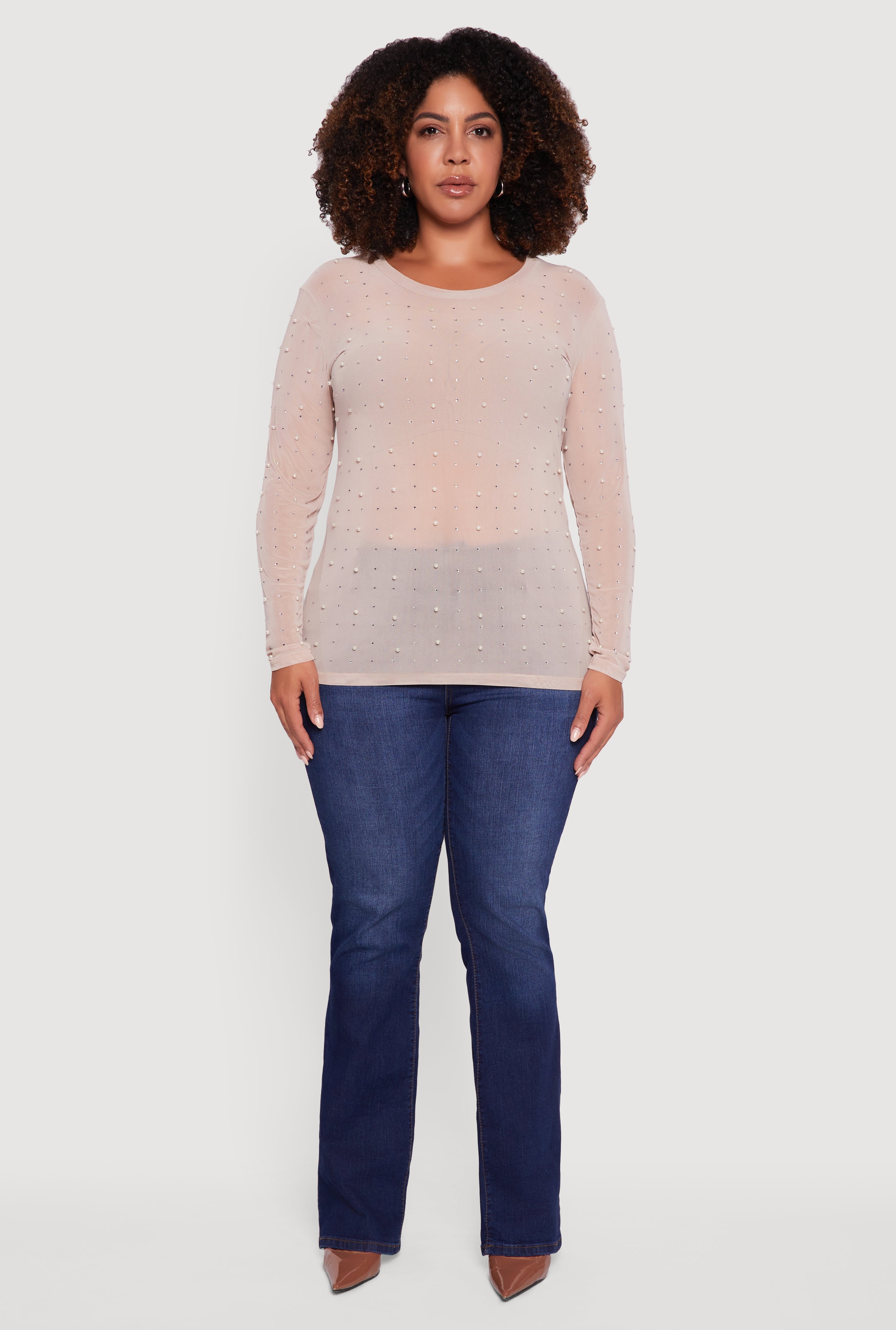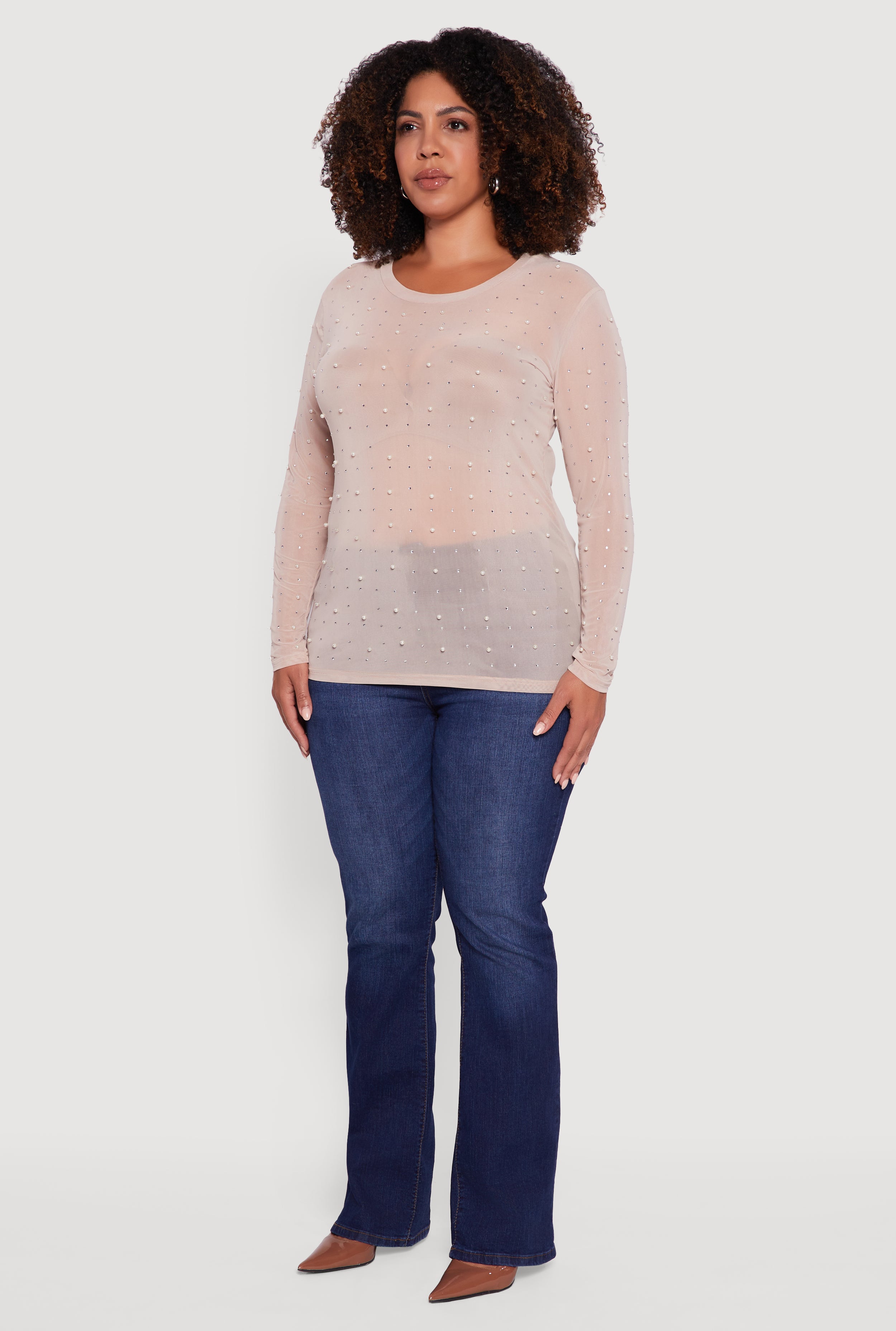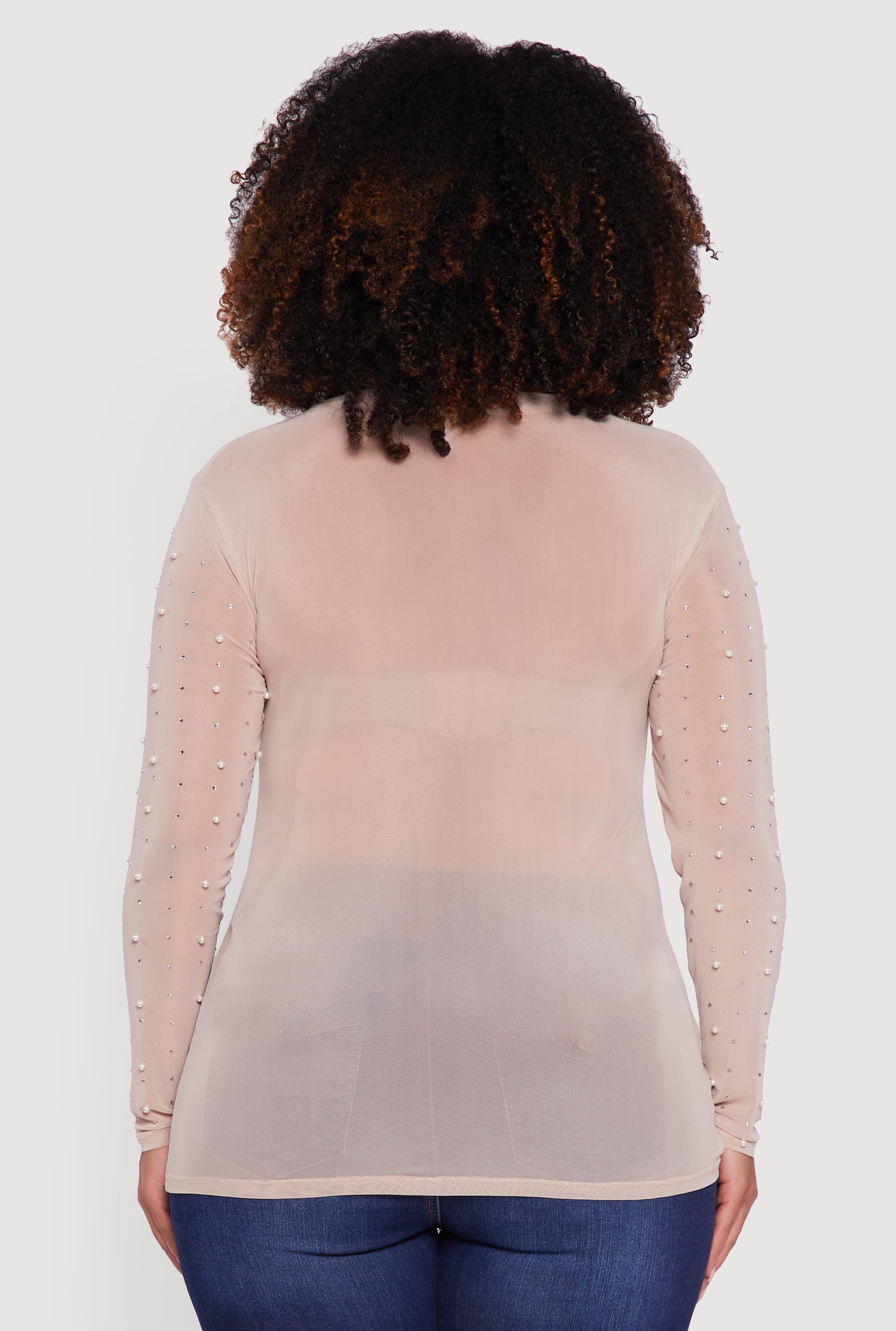 Plus Size Sheer Mesh Top with Faux Pearls and Rhinestones