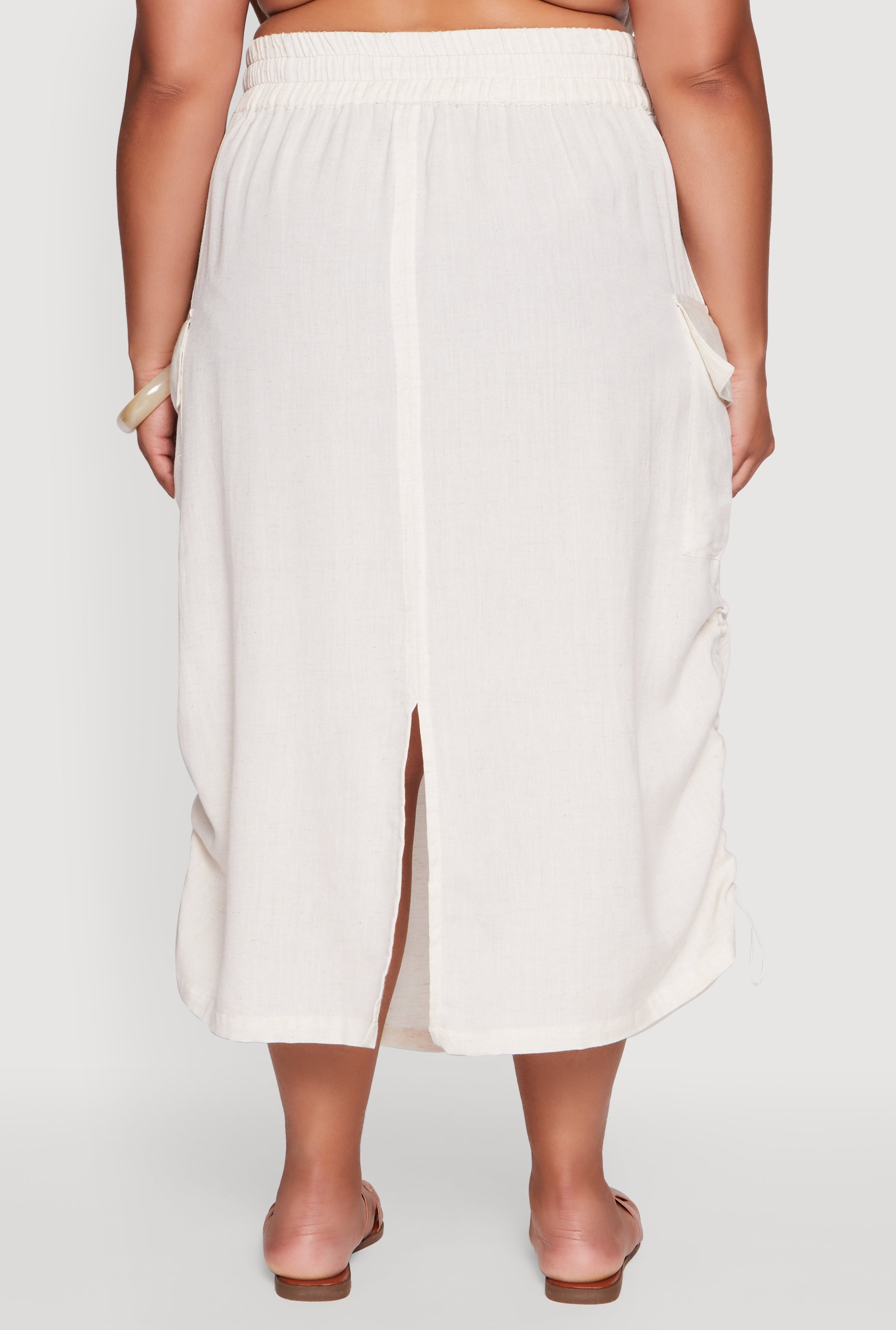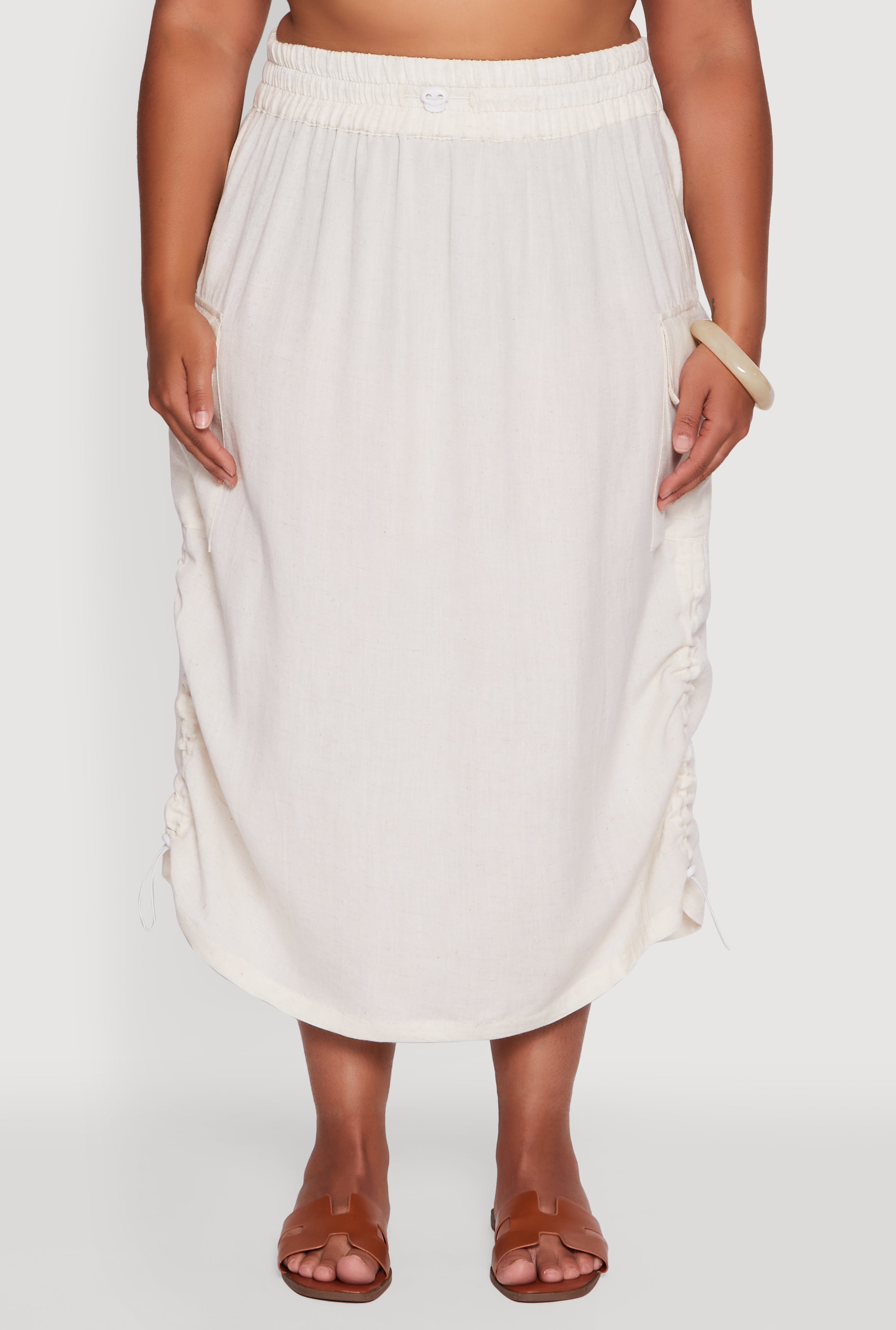 Step into effortless style with this Plus Size High Waisted Toggle Drawstring Hem Linen Skirt. Designed to flatter your curves and keep you comfy all day, its breezy linen fabric and mid-length cut make it your new go-to for casual vibes. The ruching adds a playful touch, while the adjustable drawstring hem lets you customize your look from relaxed to chic in seconds. Perfect for those days when you want to look put-together without trying too hard.