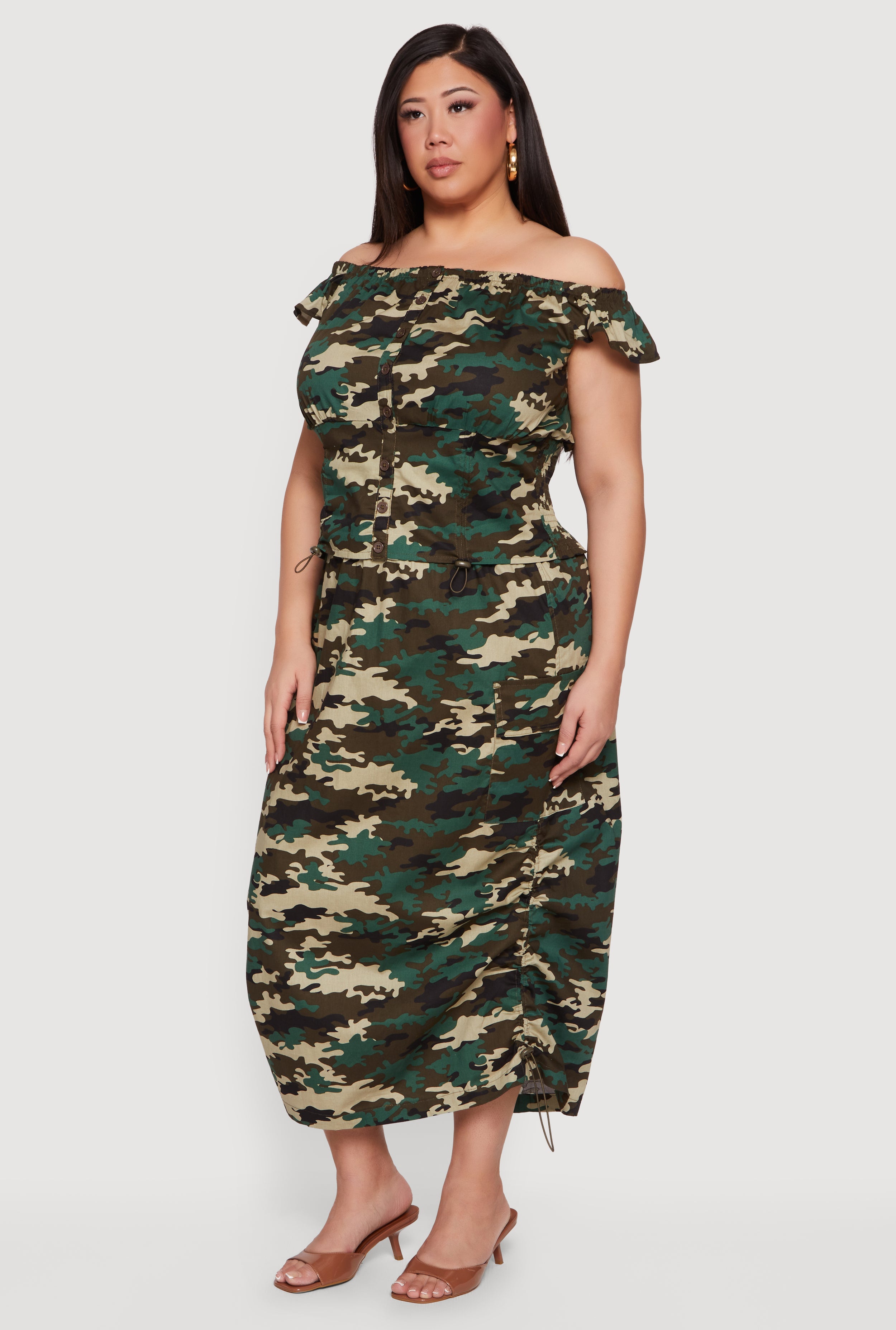 - Off-the-shoulder neckline highlights the shoulders and collarbone
