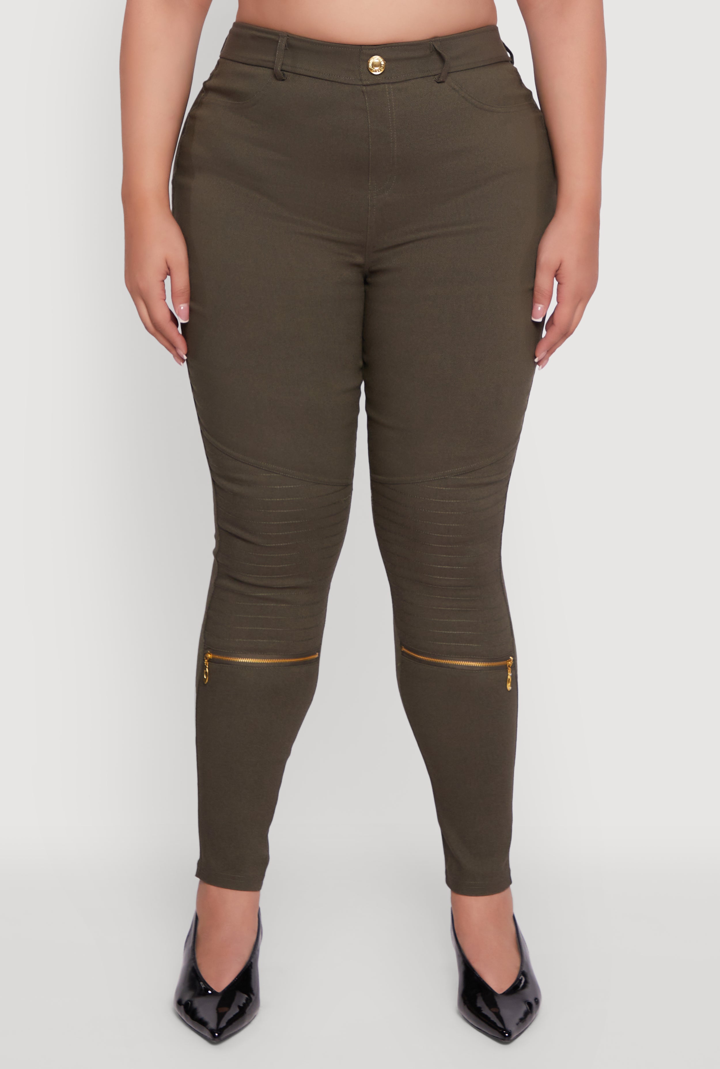 Step out in confidence and style with these Plus Size High Waisted Skinny Moto Pants. Designed to hug your curves and elevate your everyday look, these pants blend edgy moto vibes with a flattering high waist that keeps you comfy all day long. The sleek skinny leg silhouette and faux zipper details add just the right amount of attitude, making them your new go-to for casual days or nights out. Slip them on with ease thanks to the pull-on design and enjoy stretch that moves with you—because fashion should never hold you back.
