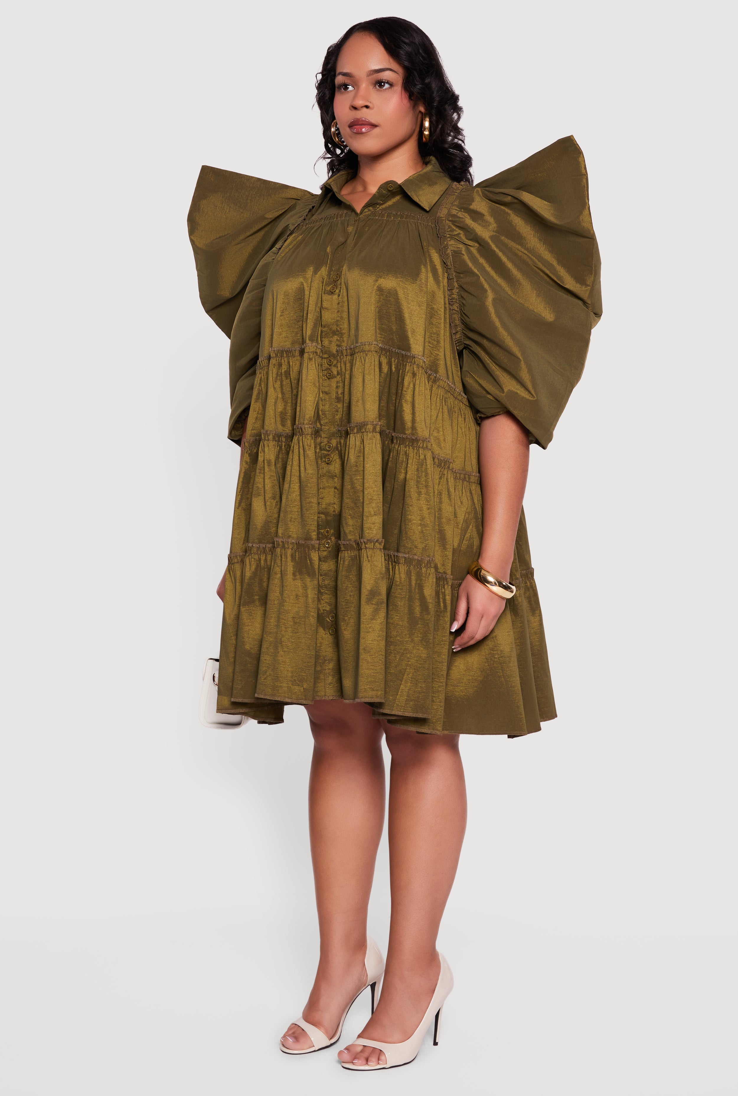 Step out in style with this Plus Size Puff Sleeve Ruffle Tiered Button Front Shirt Dress. Designed for a classic fit that flatters your curves, this mid-length dress features playful puff sleeves and delicate ruffle tiers that add a flirty touch to your look. The button-front detail and shirt collar bring a timeless vibe, making it perfect for parties or casual outings where you want to feel effortlessly chic and comfortable.