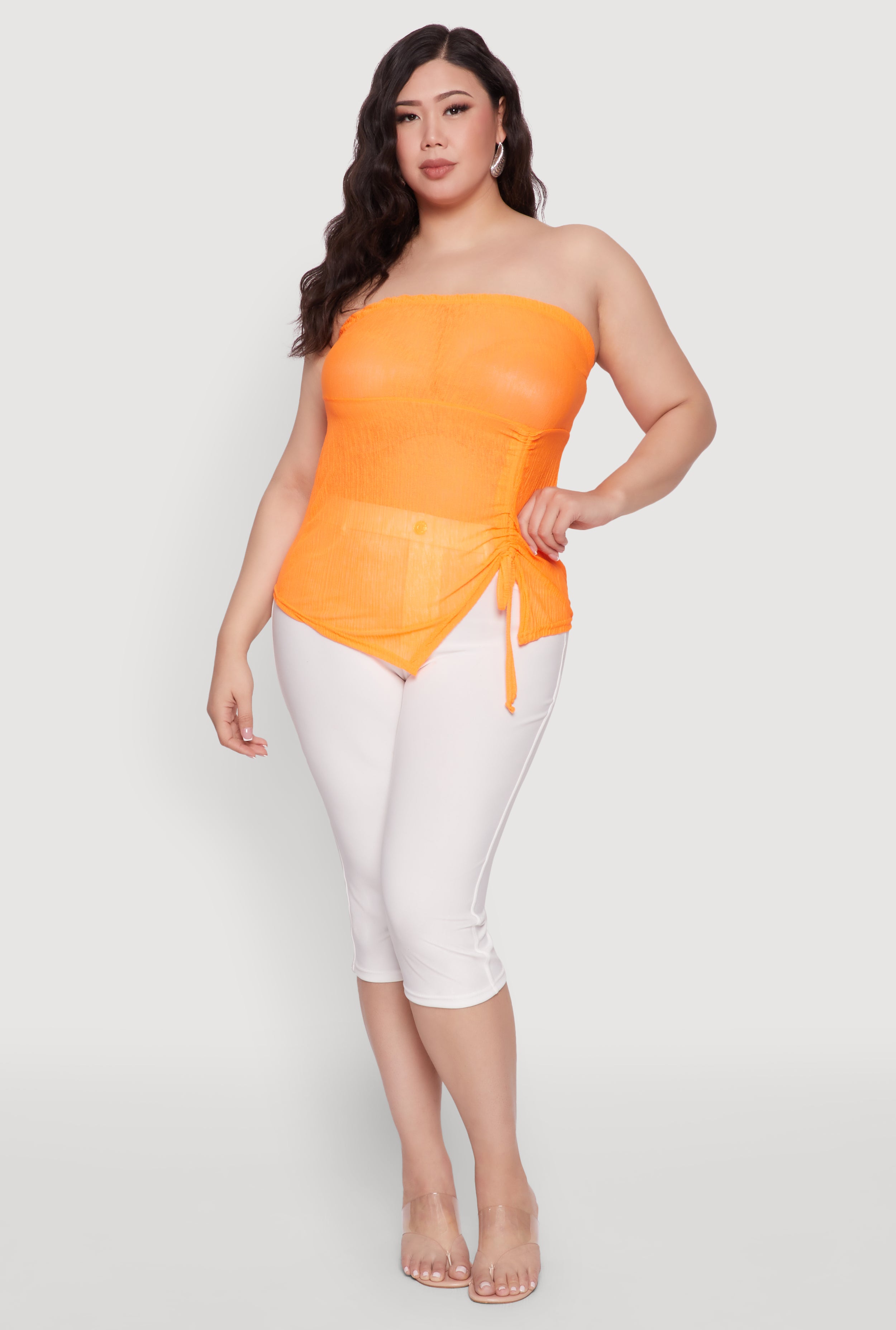 Looking for a trendy top that combines effortless style with a touch of flirtiness? Our Plus Size Sheer Ruched Drawstring Tube Top is your new go-to for turning heads and feeling fabulous. Its classic fit and timeless silhouette make it perfect for dressing up or down, while the sheer fabric and ruched details add a hint of allure. Whether you're heading out with friends or just want to elevate your everyday look, this sleeveless tube top is all about celebrating your curves with confidence and style.