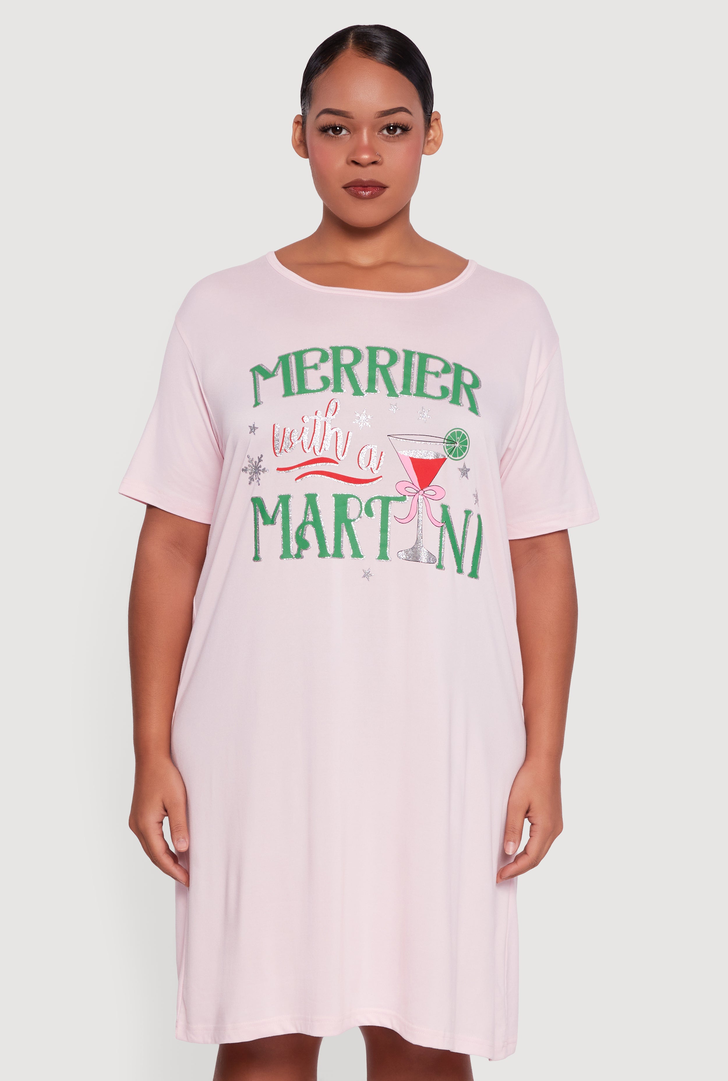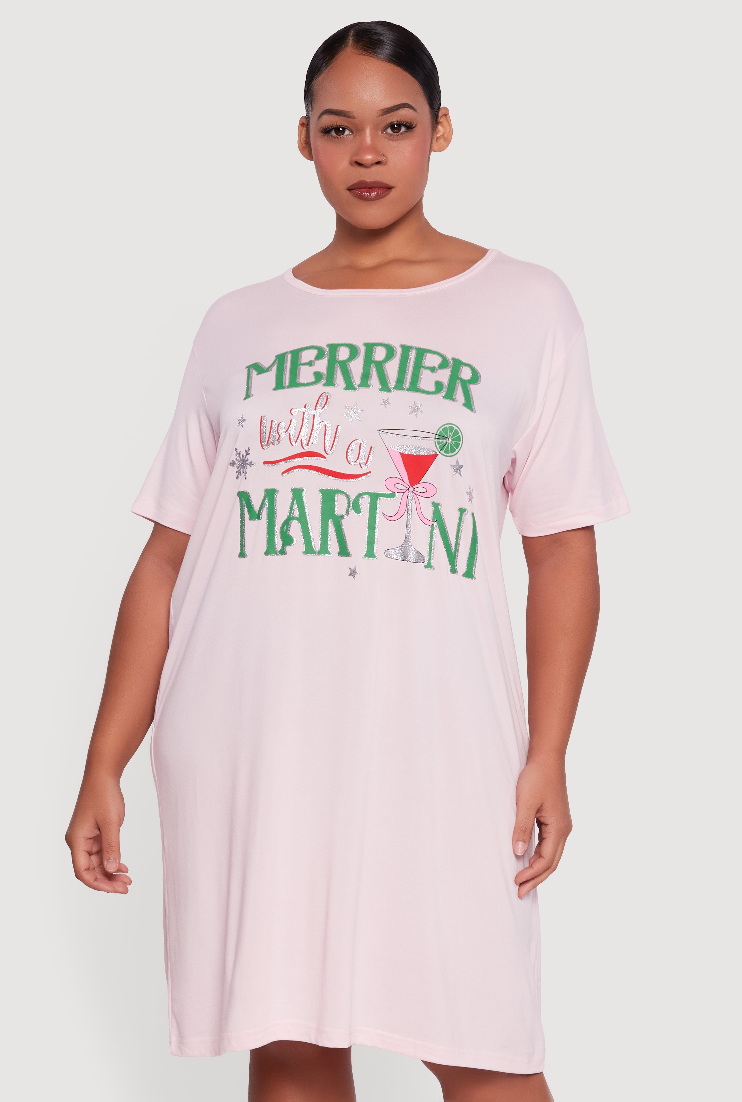 Unwind in style with the Oversized Merrier With A Martini Graphic Sleep Shirt, your new favorite way to lounge and sleep. Featuring a fun and flirty graphic print that says it all, this sleep shirt combines comfort and personality in one relaxed fit design. The scoop neck and short sleeves keep it breezy and easy, perfect for those cozy nights in or lazy weekends. Whether you’re winding down or just chilling, this sleep shirt adds a playful touch to your loungewear collection.