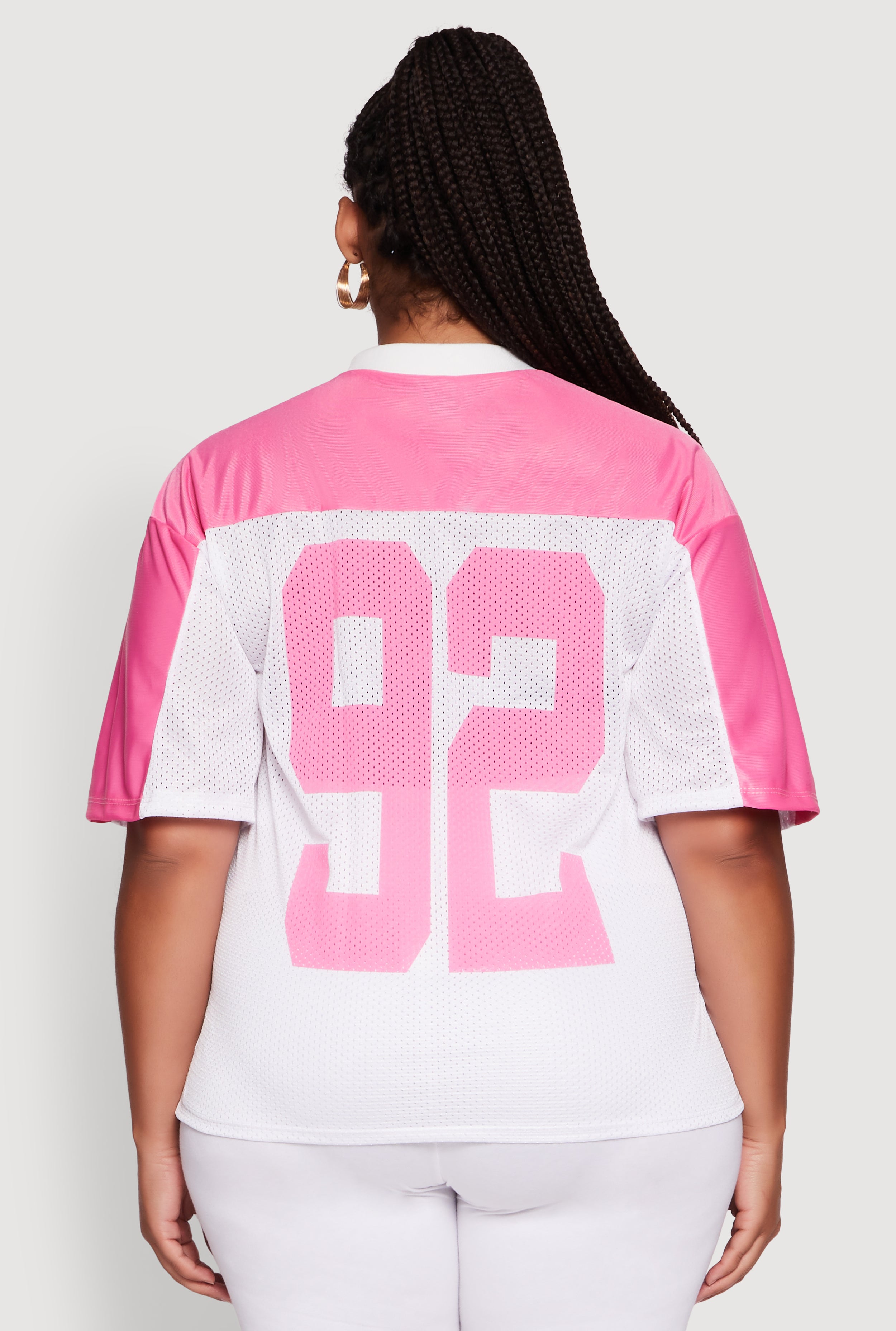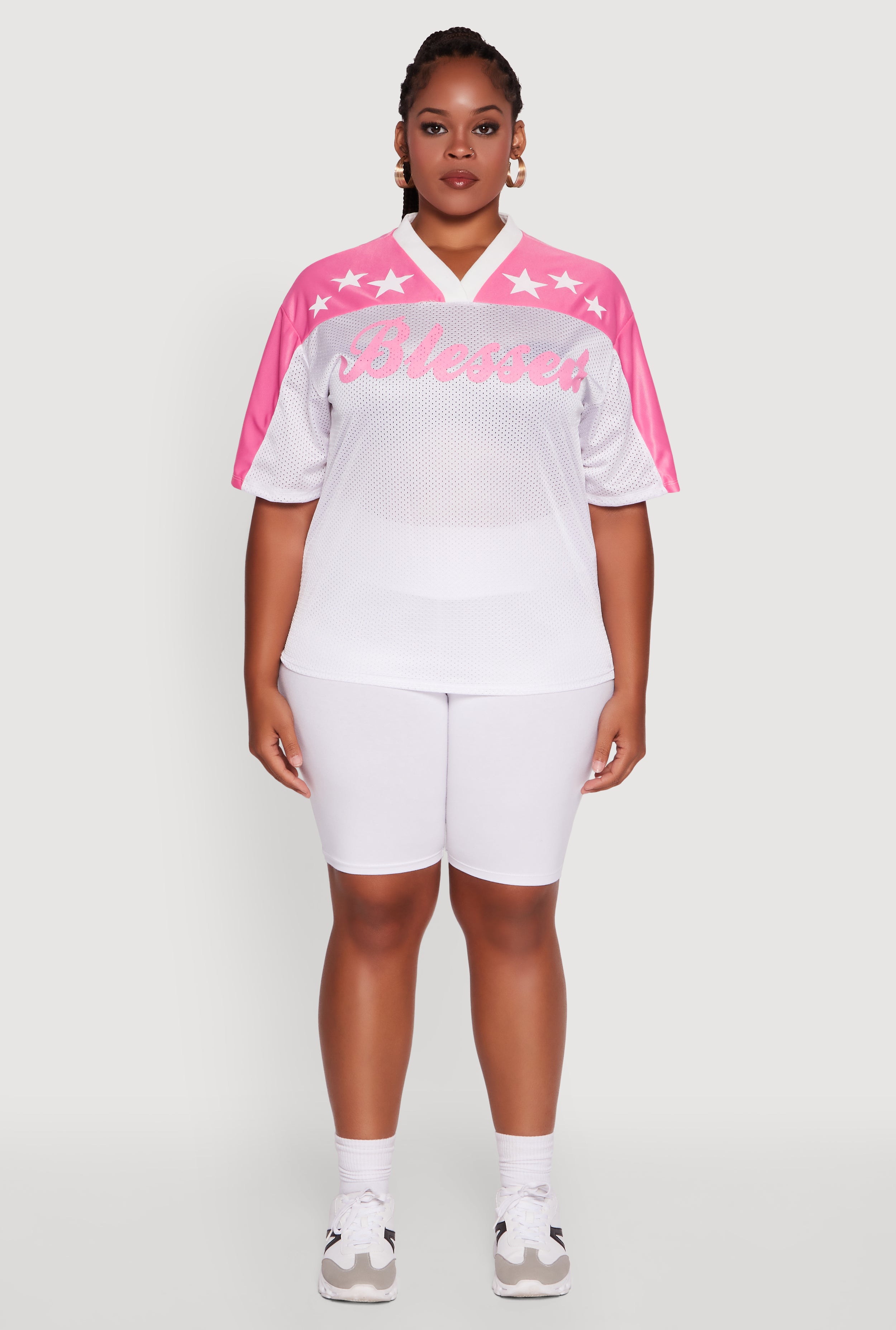 Step out in confidence and comfort with the Plus Size Blessed Graphic V-Neck Jersey. This classic fit tee blends casual vibes with a sporty edge, featuring a bold "Blessed" graphic on the front and a standout "92" on the back. Made from breathable jersey mesh, it’s perfect for chill days or athleisure looks that keep you feeling fresh and looking effortlessly cool. The flattering V-neck and short sleeves make it a go-to for every day, whether you’re hitting the streets or just hanging out.