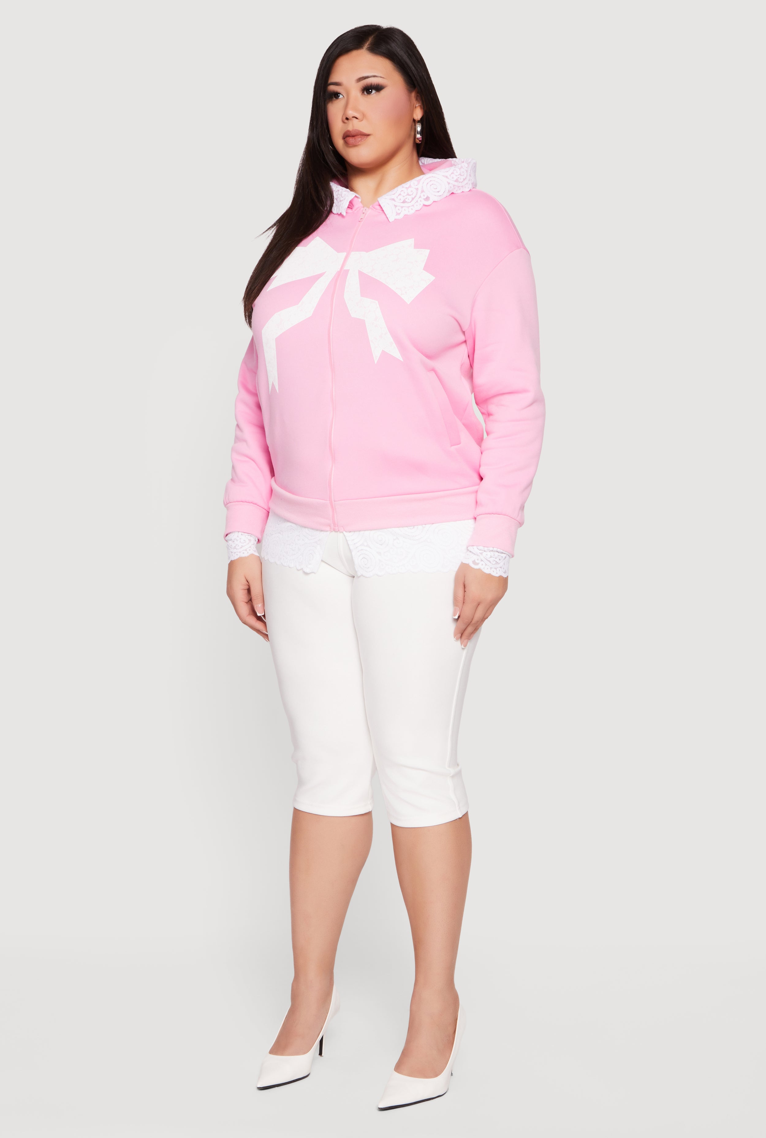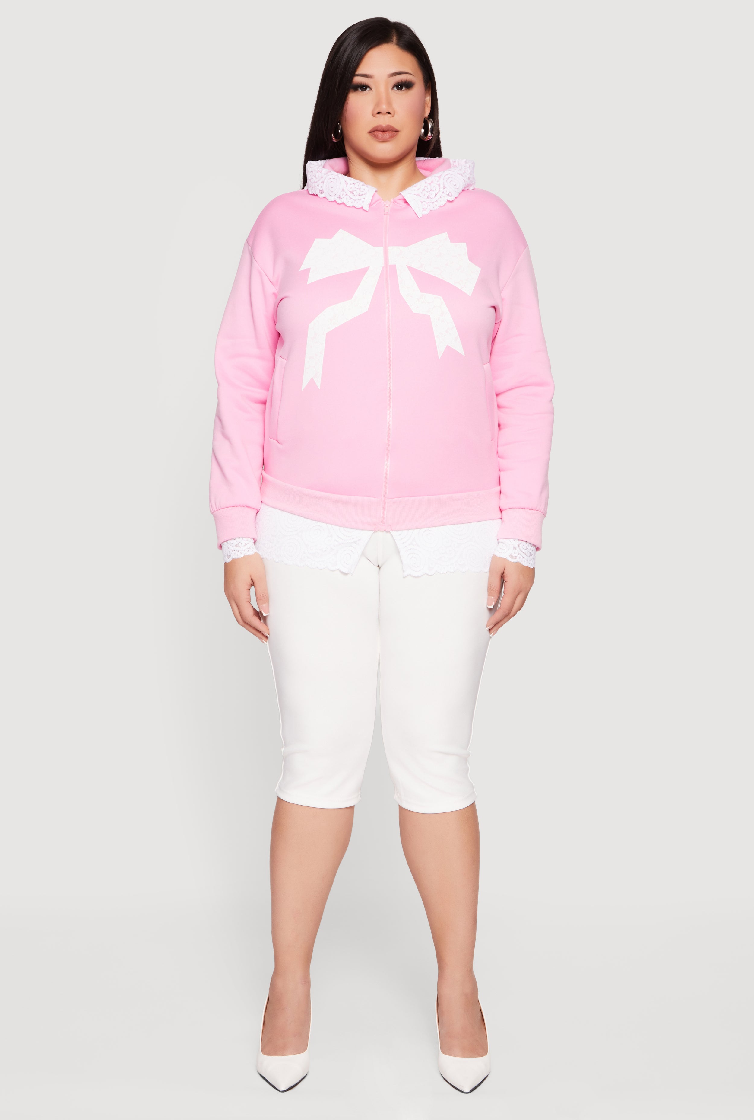 Cozy meets cute in this Plus Size Bow Graphic Lace Trim Hooded Sweatshirt. Designed with a classic fit and made from soft fleece, it’s your new go-to for casual days when you want comfort without sacrificing style. The hood adds a laid-back vibe while the delicate lace trim and bow graphic bring a sweet, feminine touch. Perfect for layering or wearing solo, this sweatshirt combines easygoing charm with a hint of playful detail.