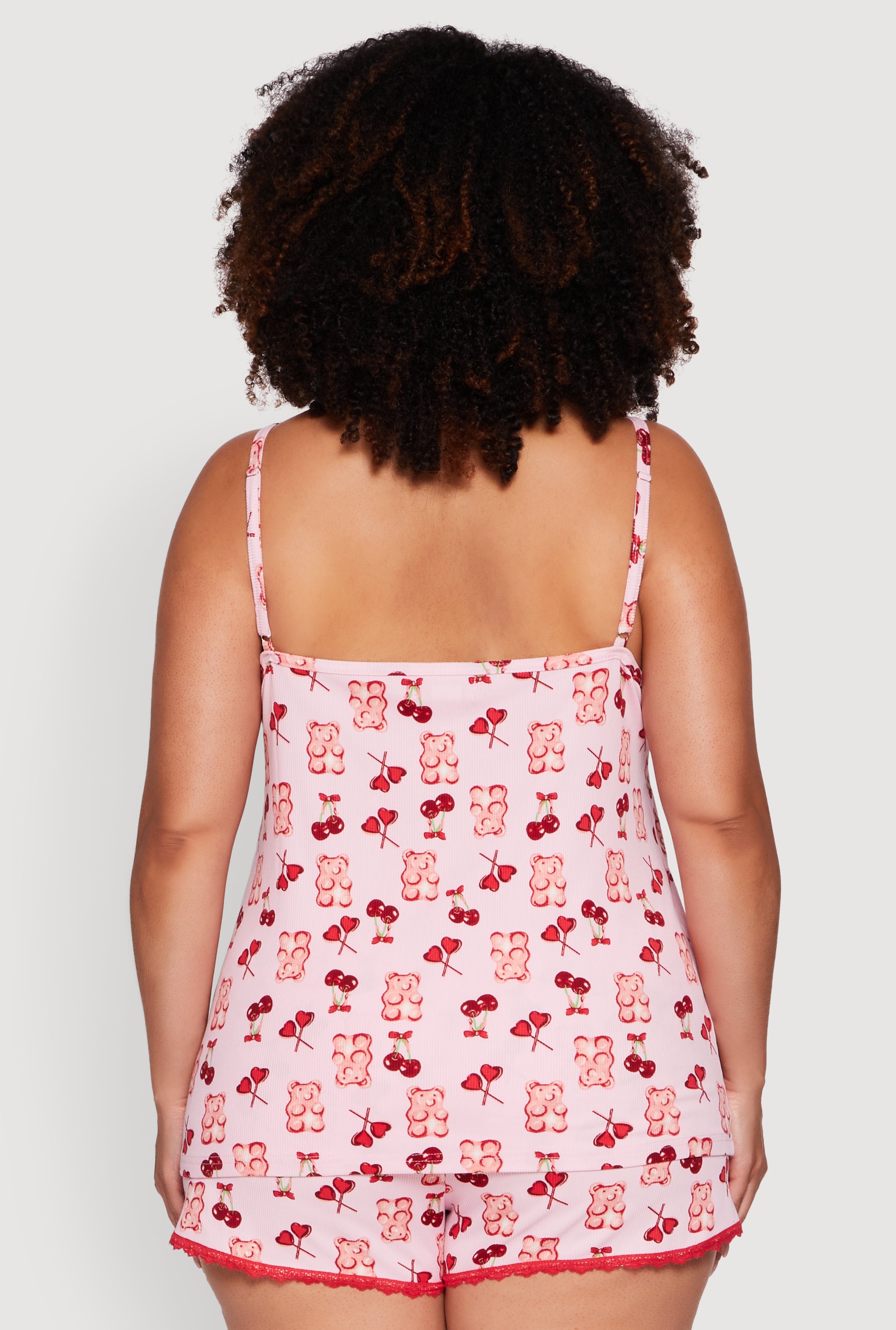 Slip into cozy vibes with the Plus Size Cherry Teddy Print Pajama Cami and Shorts set. Designed with a classic fit and a playful cherry print, this ribbed knit duo is your new go-to for chill nights and lazy mornings. The adjustable spaghetti straps and delicate lace details add a flirty touch while keeping comfort front and center. Whether you're binge-watching your favorite series or catching up on beauty sleep, this mid-rise, open-back set is all about effortless style and ultimate relaxation.