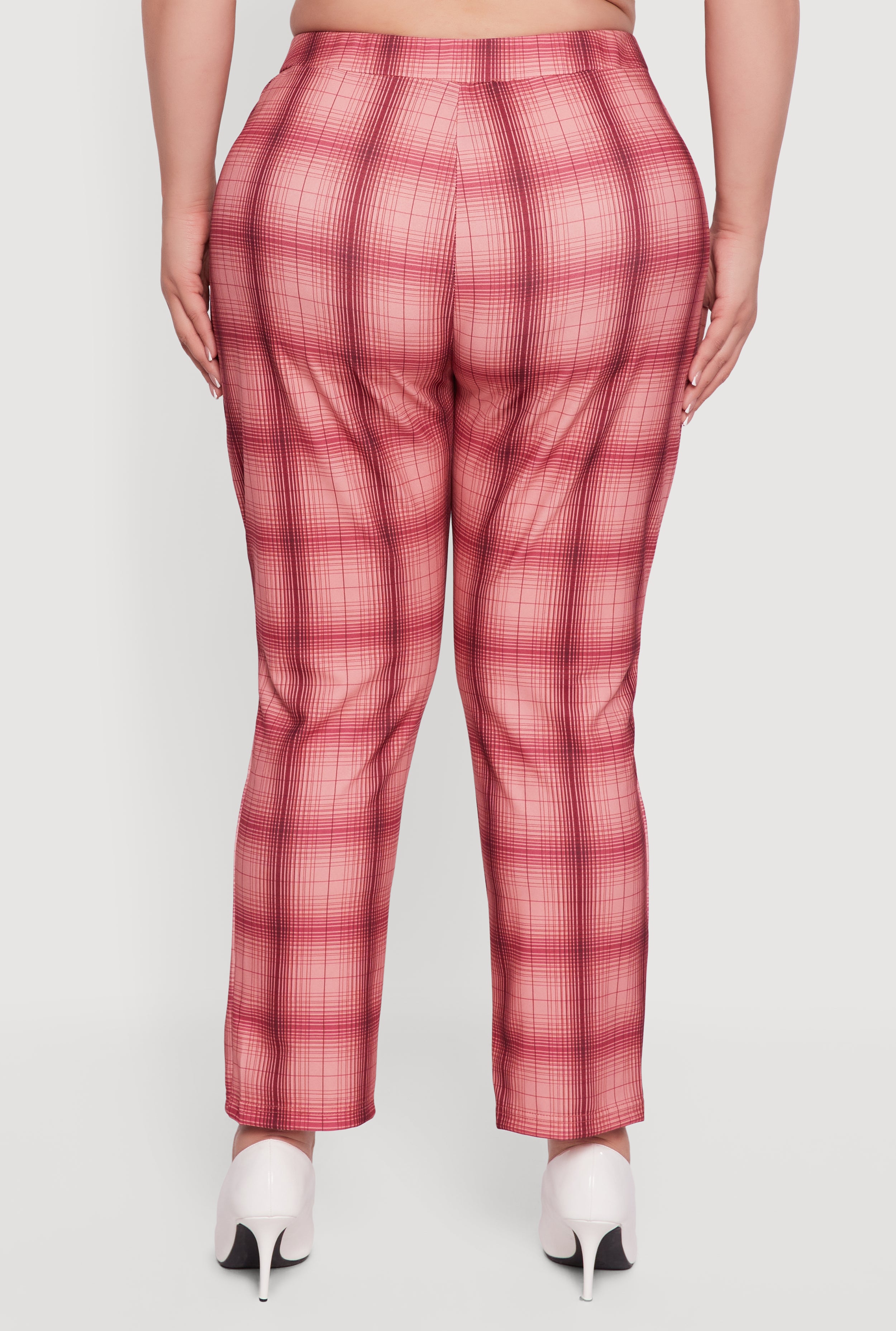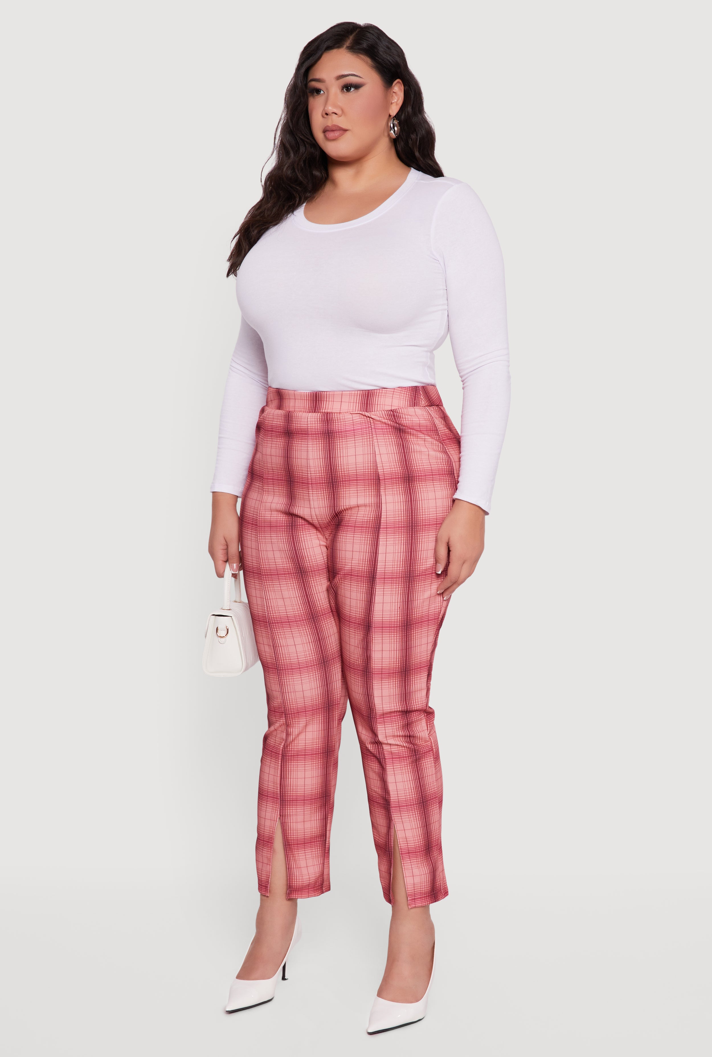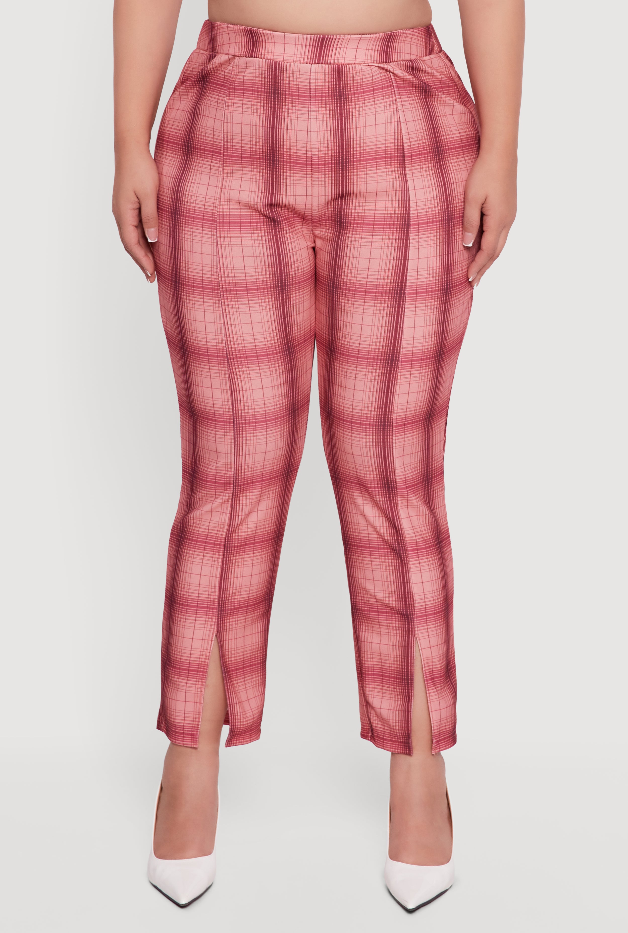 Step up your style game with these Plus Size Plaid Slit Front Pull On Slim Leg Pants. Designed to flatter your curves with a high-waisted, slim fit, these pants combine comfort and trend effortlessly. The pull-on design means no fuss, while the chic plaid pattern and subtle front slit add a fresh twist to your everyday look. Perfect for casual outings or laid-back days when you want to feel confident and stylish without sacrificing comfort.