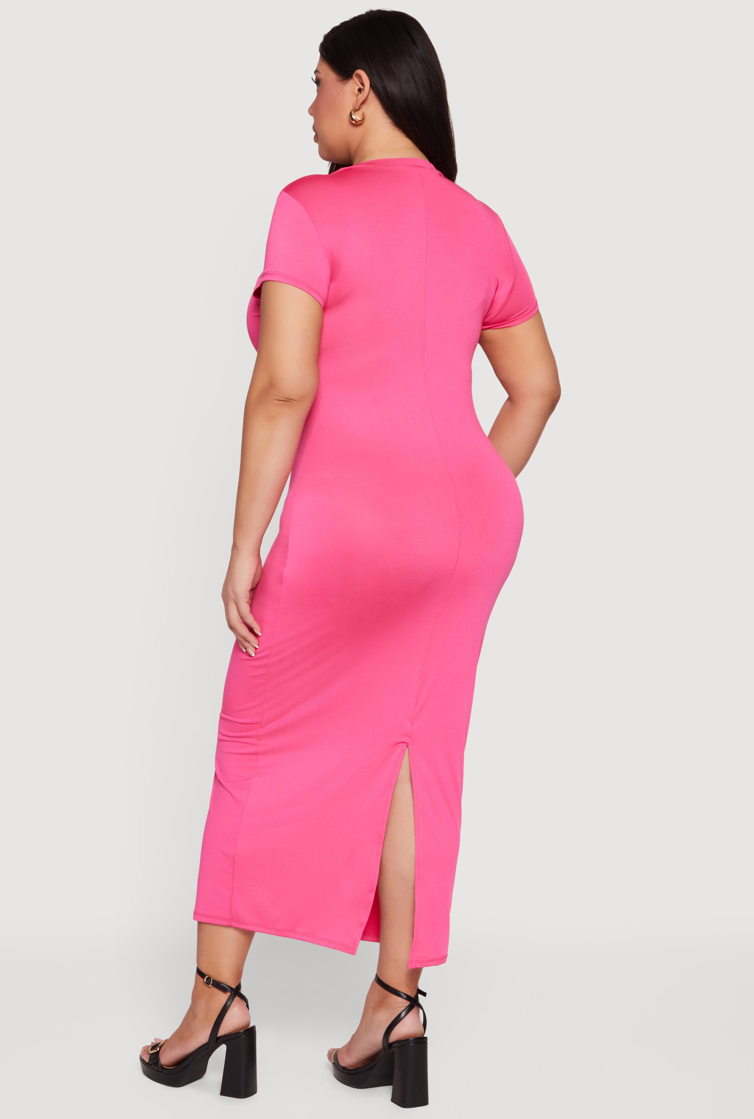 This classic fit midi dress features a crew neckline and short sleeves for easy everyday wear. Its bodycon silhouette is balanced by a back slit hem, adding subtle movement and style. Perfect for casual occasions, it offers a timeless look that transitions effortlessly from day to night.