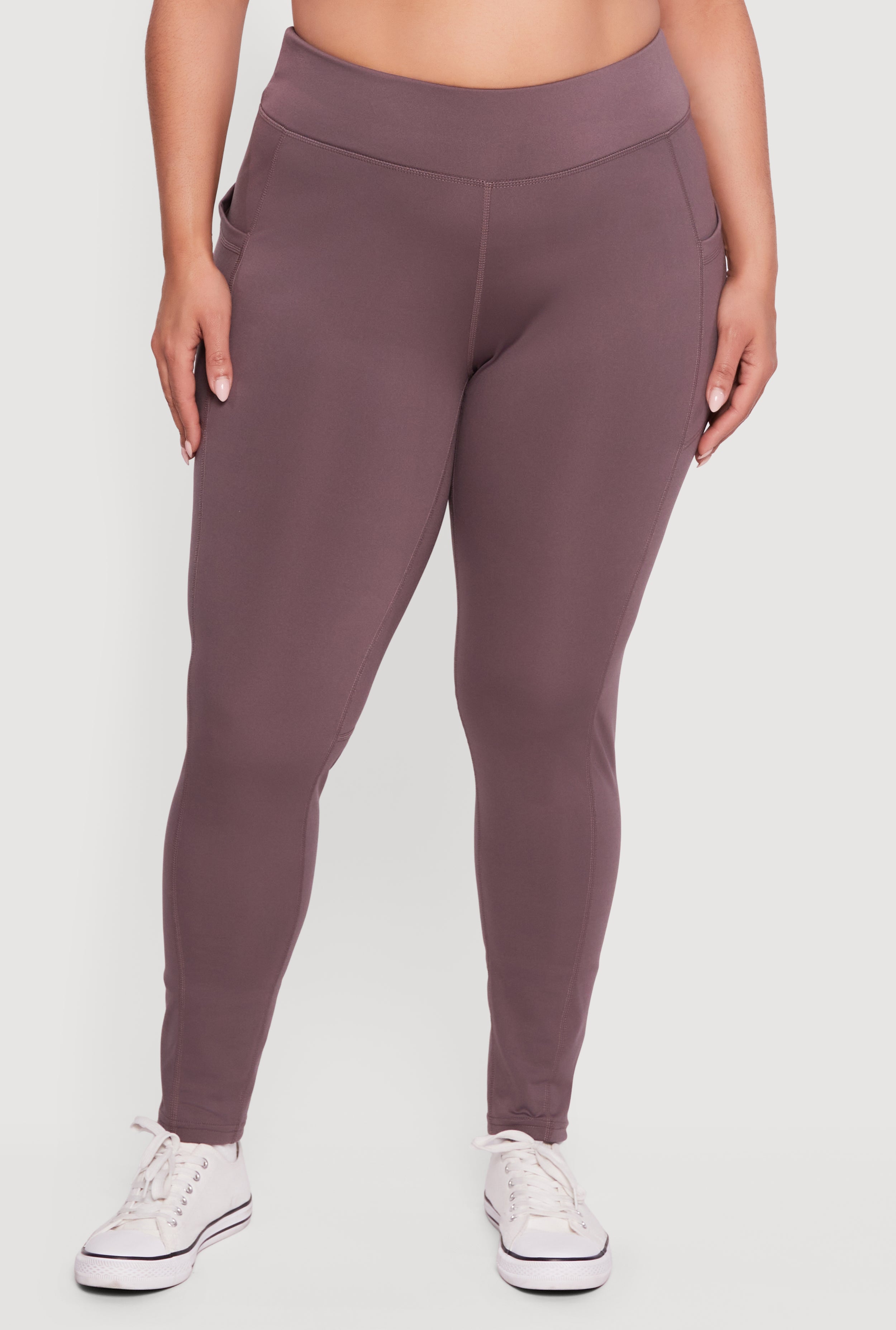 These high-waisted leggings offer a sleek, skinny-leg silhouette that pairs perfectly with casual or athleisure looks. Designed with active fit in mind, they include side pockets for easy storage and a secure, flattering waistband that stays put during movement.