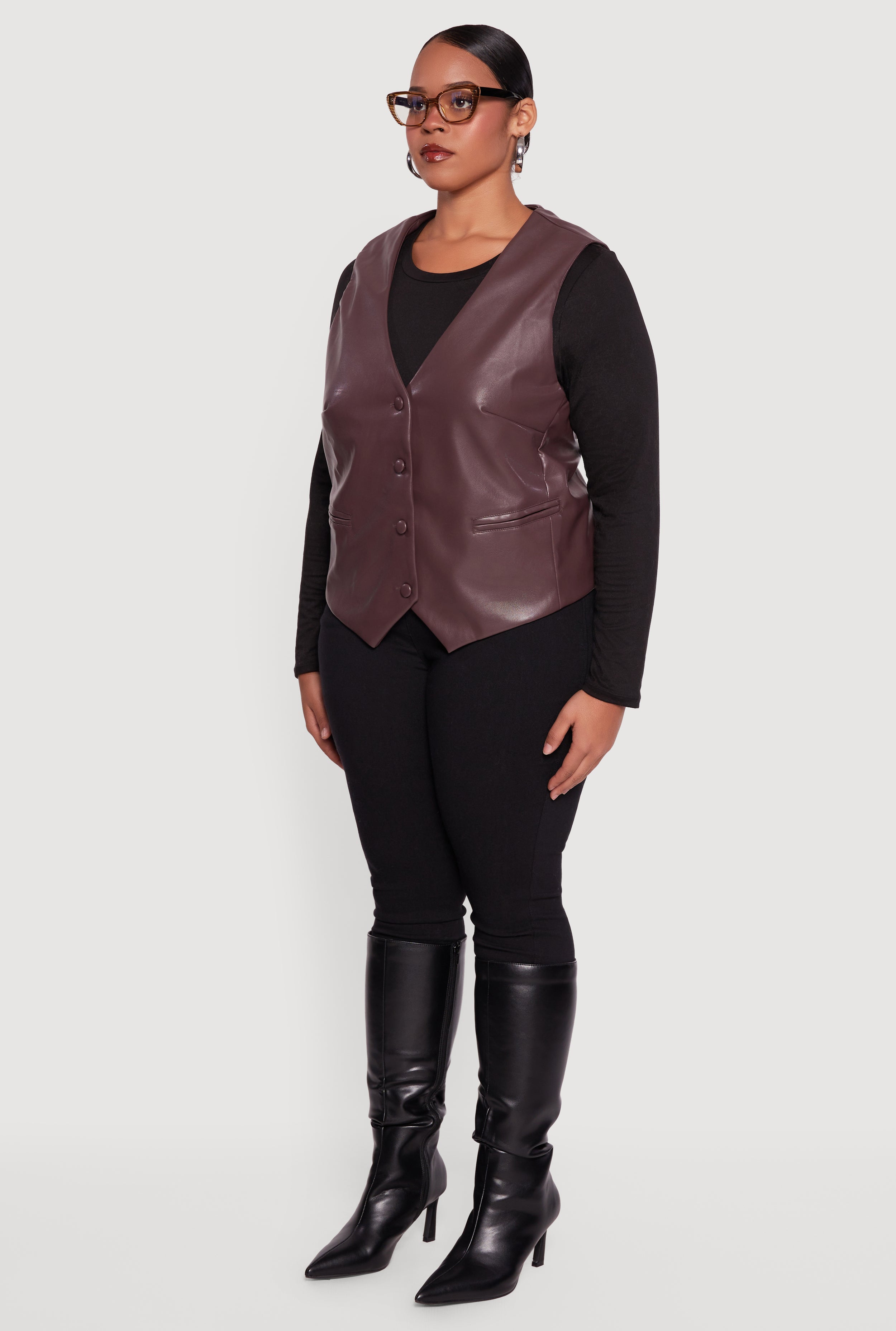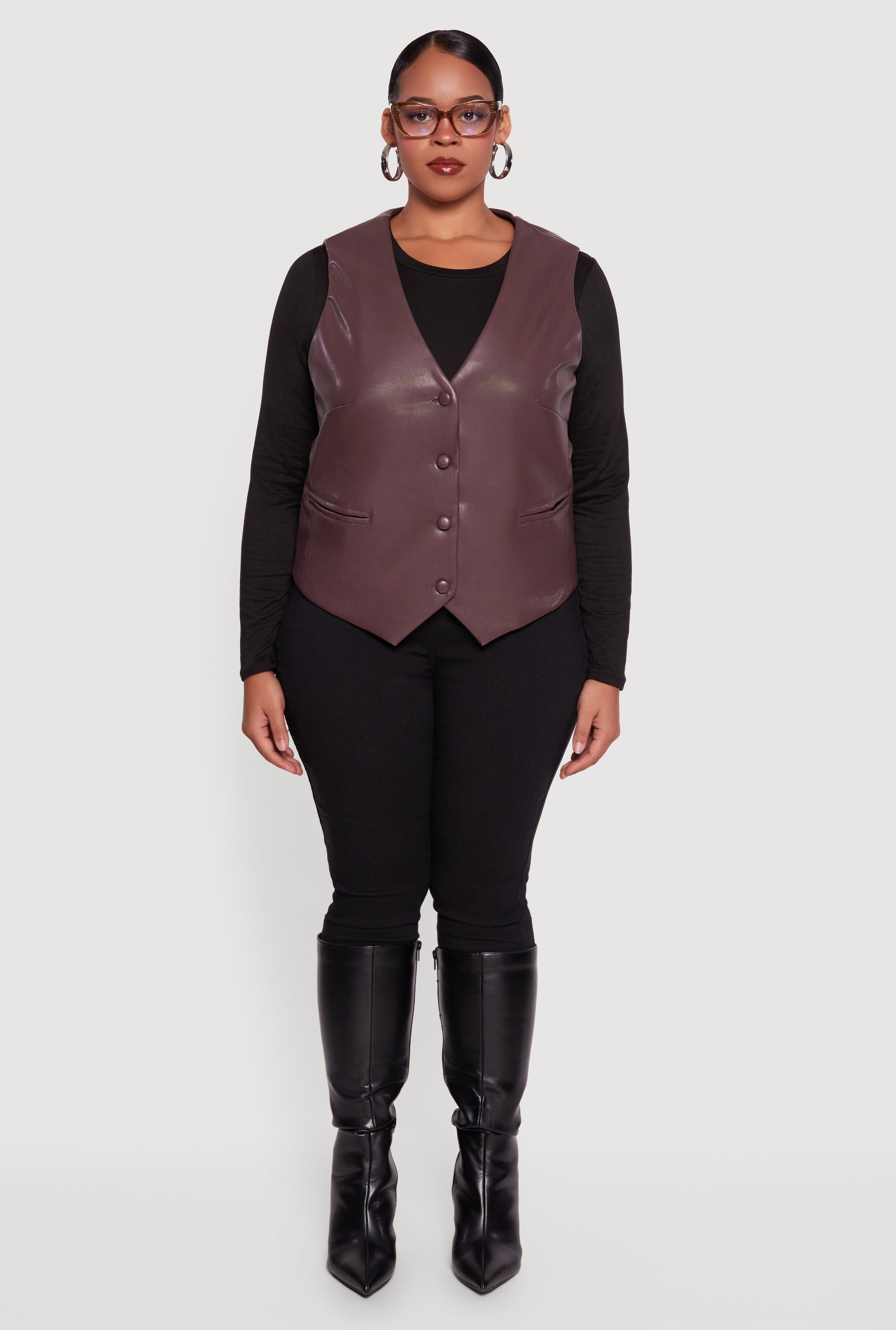Step up your style game with this Plus Size Faux Leather Button Front Vest designed to turn heads wherever you go. Crafted from sleek faux leather, this sleeveless vest features a flattering V-neck and a chic button-front closure that adds just the right amount of edge to your look. Perfect for nights out or parties, it pairs effortlessly with your favorite tops and jeans to create an effortlessly cool vibe. Embrace bold fashion without compromising comfort or fit.