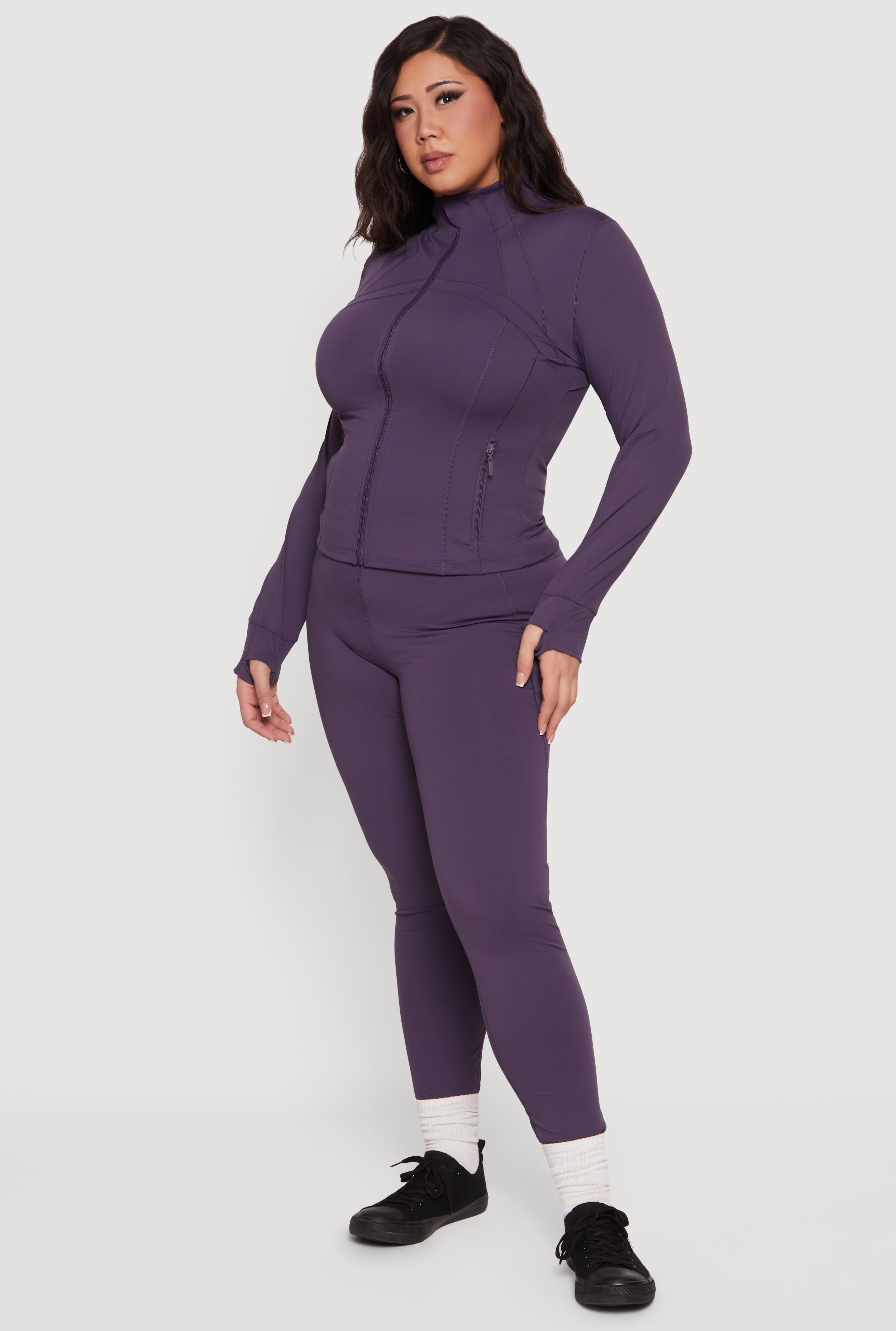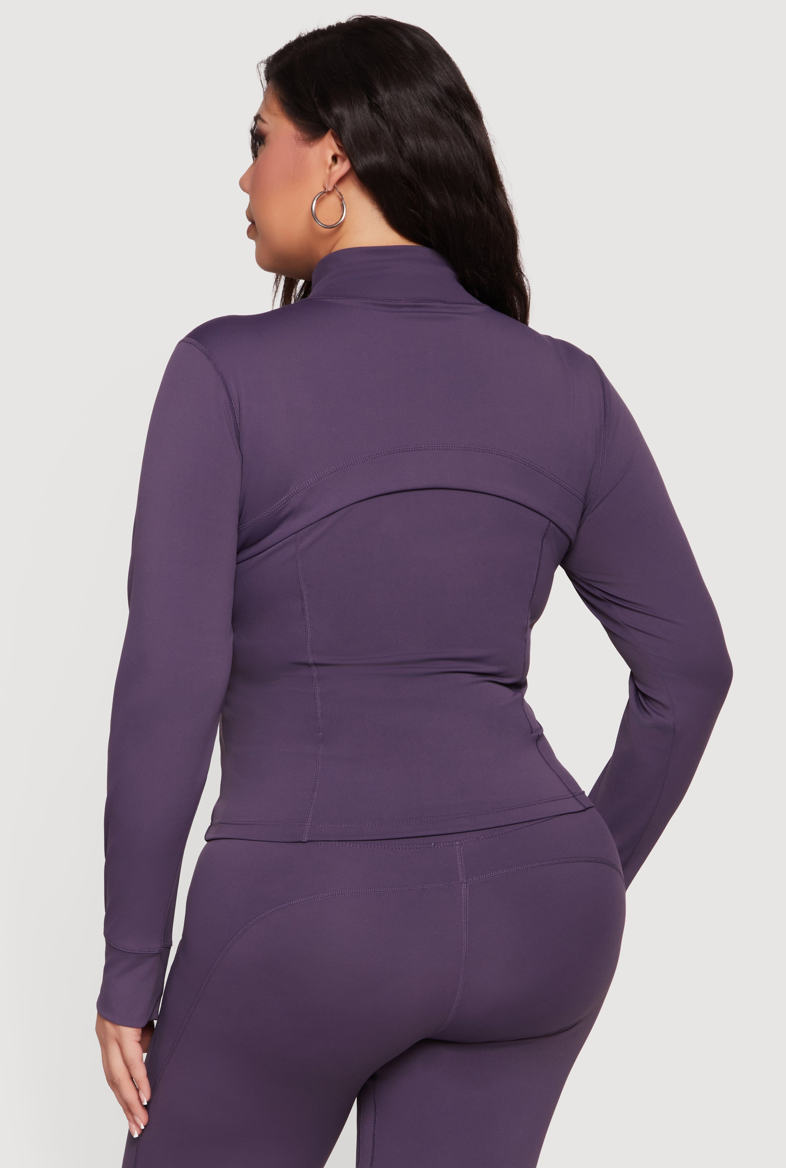 This plus size activewear jacket features a mock neck and long sleeves designed for casual athleisure wear. Equipped with a zip front closure and zip pockets, it combines functionality with style. Thumb holes add an extra touch for ease of movement and layering.