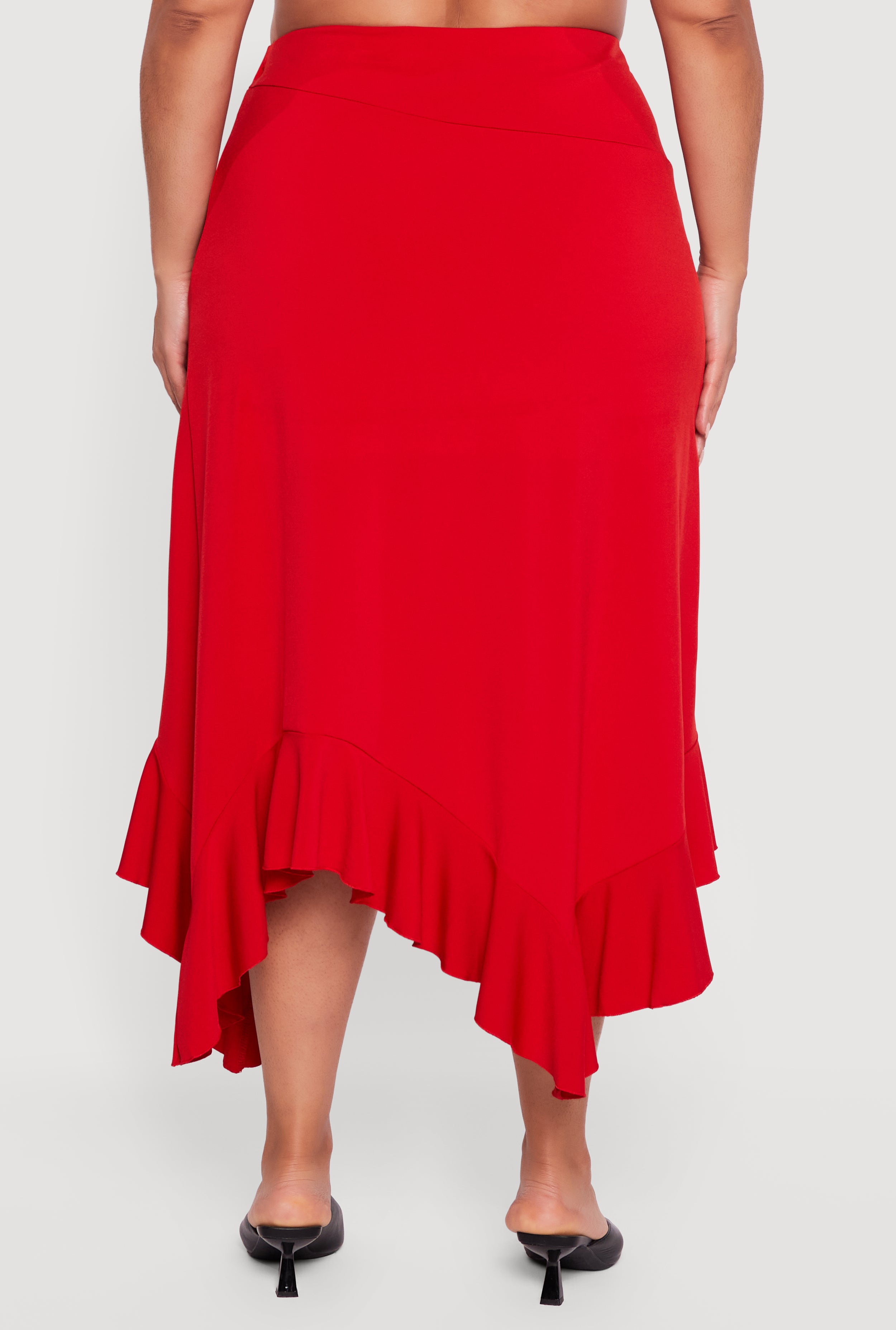Step into the spotlight with this Plus Size Asymmetrical Handkerchief Hem Skirt that effortlessly blends modern style with playful charm. Designed to flatter your curves, this high-waisted mid-length skirt features a unique handkerchief hem that adds a flirty twist to your look. Perfect for evenings, nights out, or parties, its solid color and ruffled details bring a casual yet chic vibe that lets you express your confident, fun-loving side.