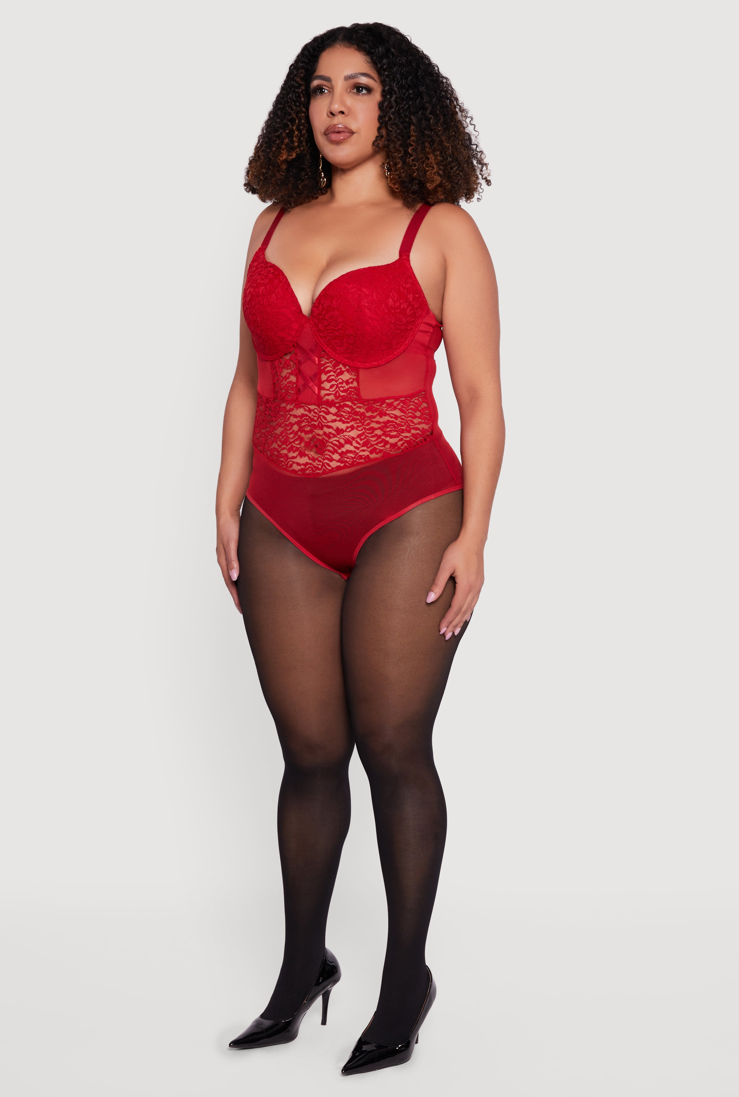 Turn heads and feel unstoppable in this Plus Size Bustier Lace Bodysuit designed to celebrate your curves. With its delicate lace and mesh details, this sleeveless bodysuit features a flattering sweetheart neckline and a curve-hugging silhouette that enhances your natural shape. Padded cups and underwire support give you lift and confidence, while adjustable straps and a snap closure make it easy to wear all night long. Perfect for your next night out or party, this solid black lace beauty is your new go-to for effortless, sexy style.