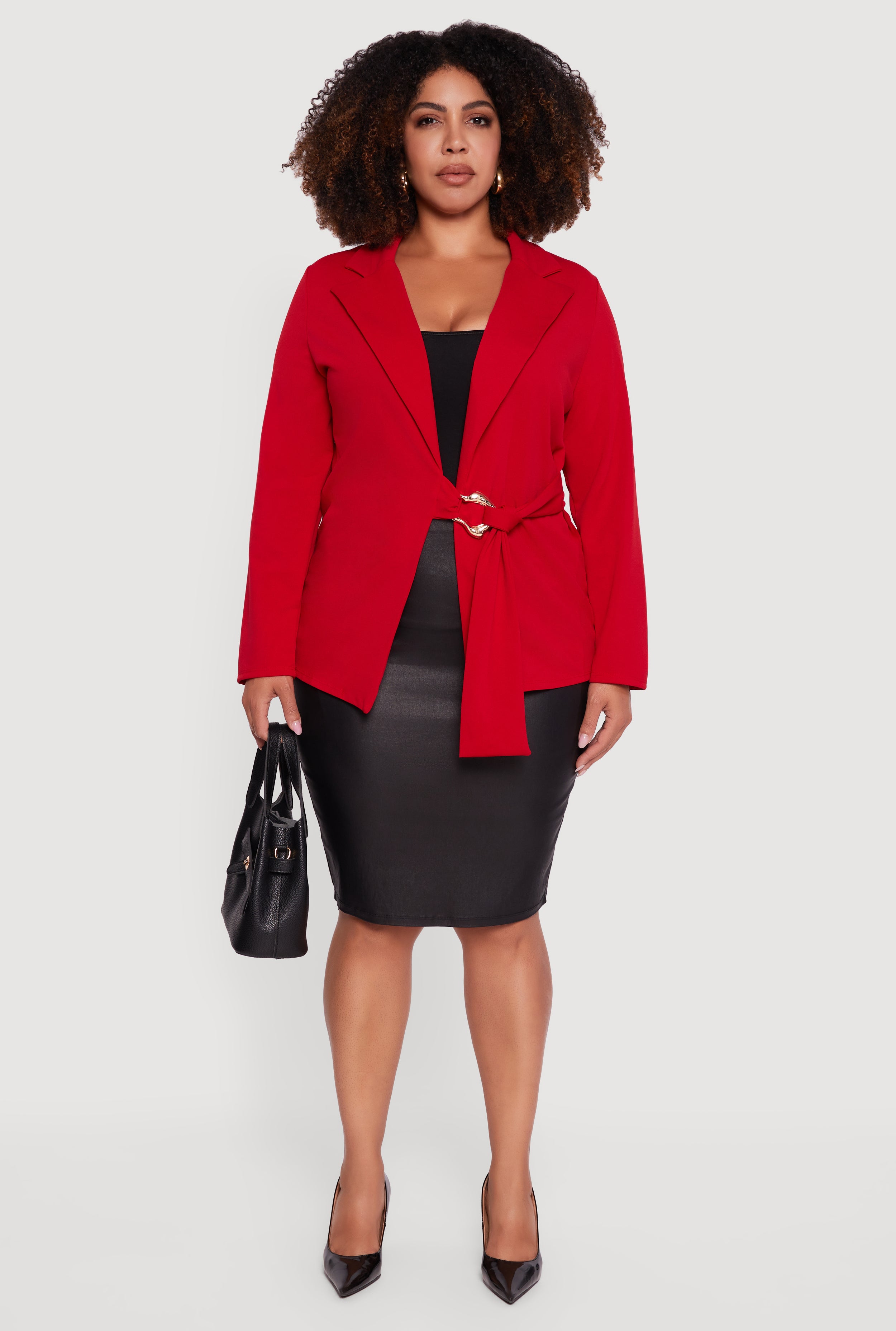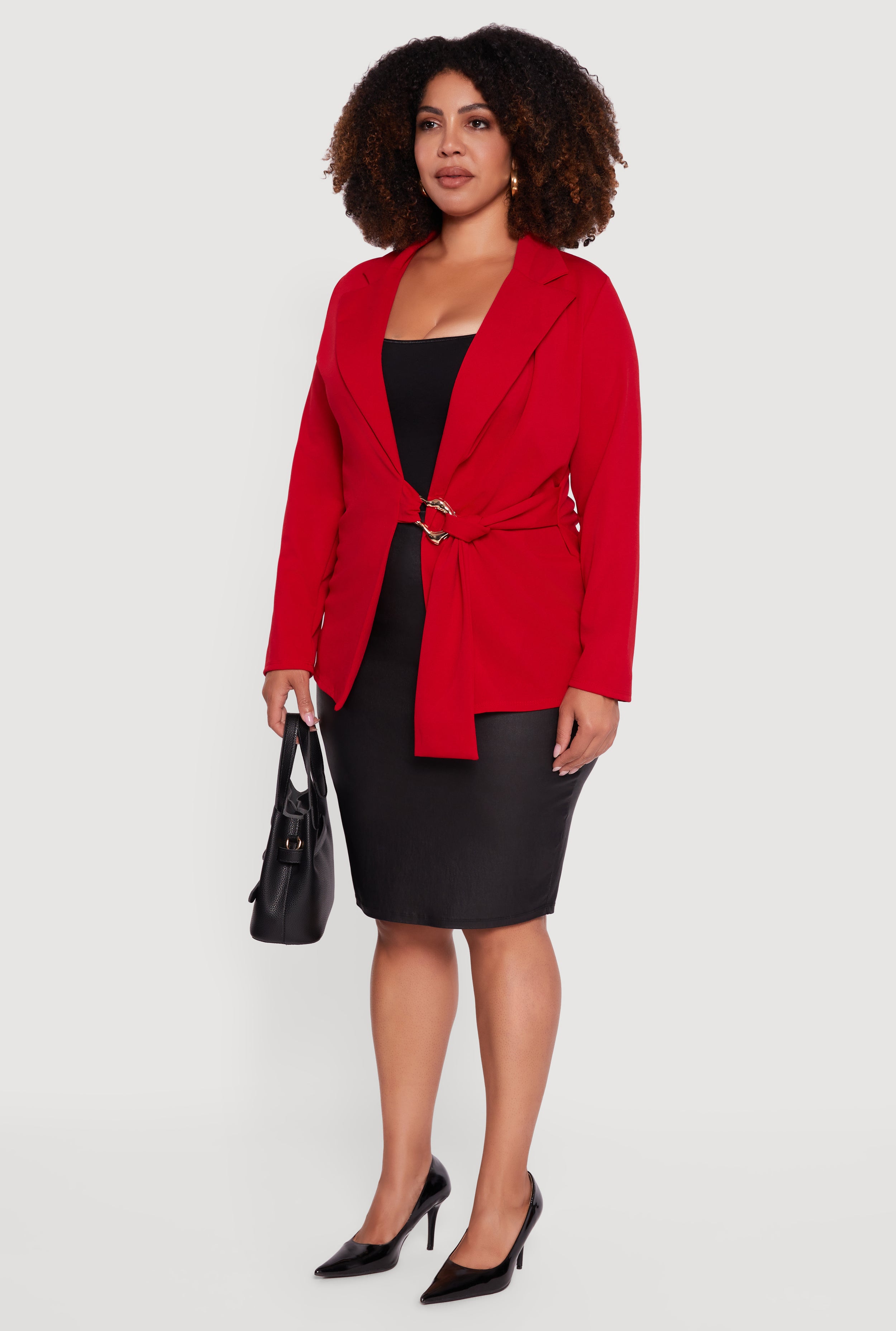 Elevate your everyday look with this Plus Size Crepe Knit Belted Blazer designed to blend comfort and style effortlessly. Crafted from soft crepe knit fabric, it features a flattering tie waist belt that cinches your silhouette just right. The long sleeves and classic collared neckline add a polished touch, making it perfect for officewear or casual outerwear. With its solid color and subtle metallic buckle details, this blazer is a versatile must-have that transitions seamlessly from work to weekend.