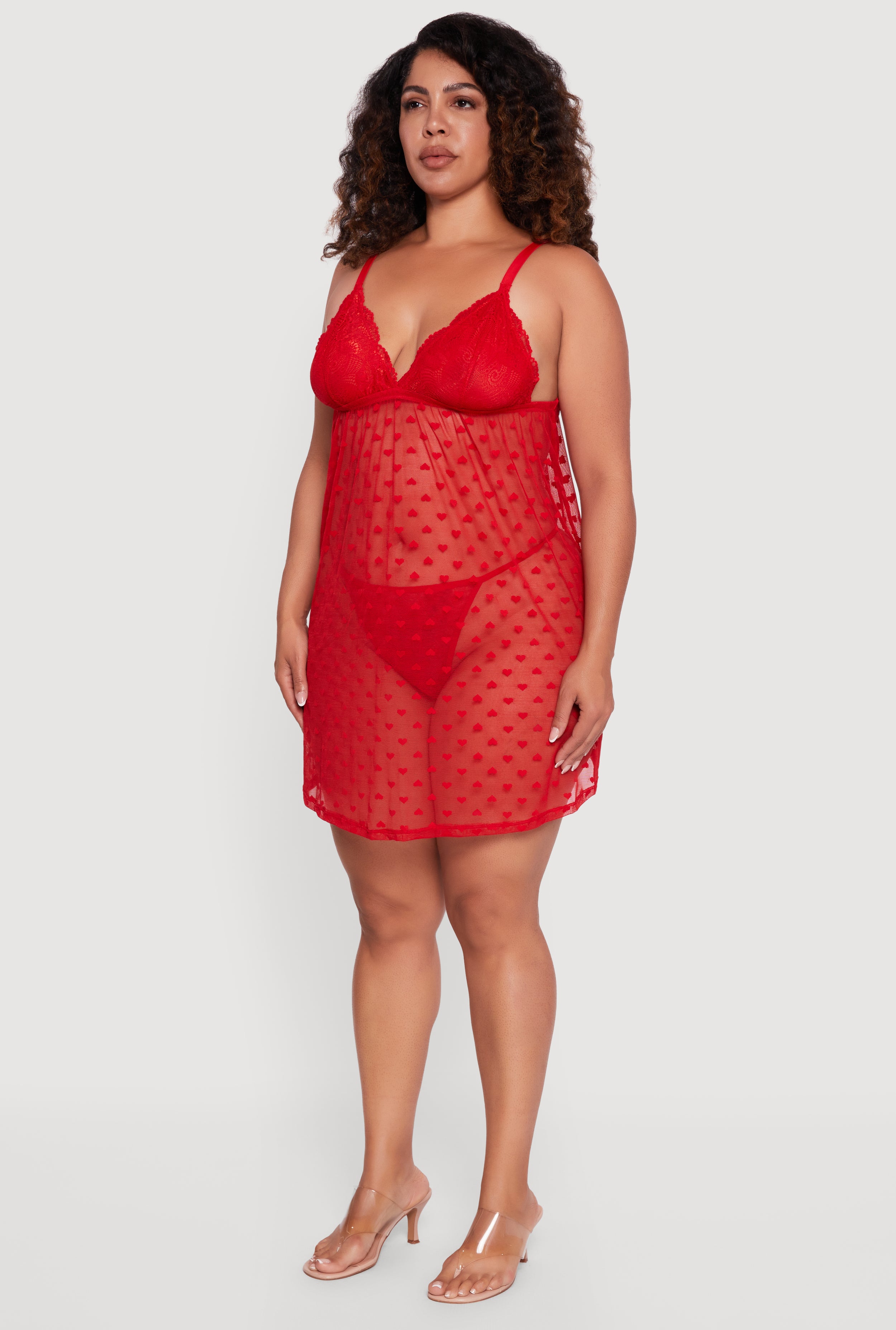 Feel flirty and fabulous in this Plus Size Heart Patterned Scalloped Lace Detail Babydoll and G String set designed to celebrate your curves. Crafted from sheer mesh with a playful heart polka dot pattern, this sleeveless babydoll features delicate scalloped lace details that adds a touch of romance. The soft cup plunge bra offers gentle support while the adjustable straps ensure the perfect fit. Complete with a matching G-string, this 2-piece set is ideal for anniversaries, birthdays, or whenever you want to feel special and comfortable in stylish loungewear.
