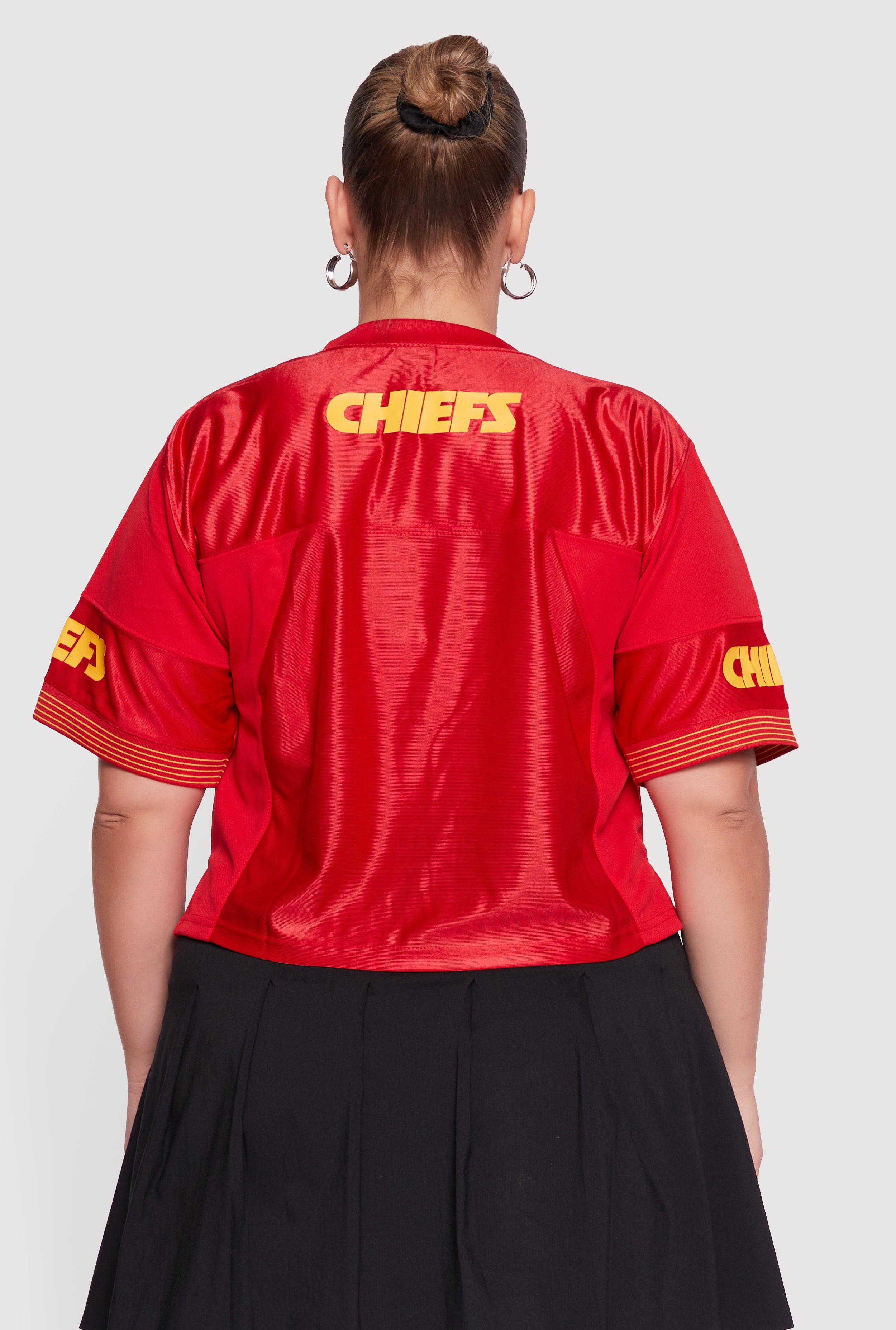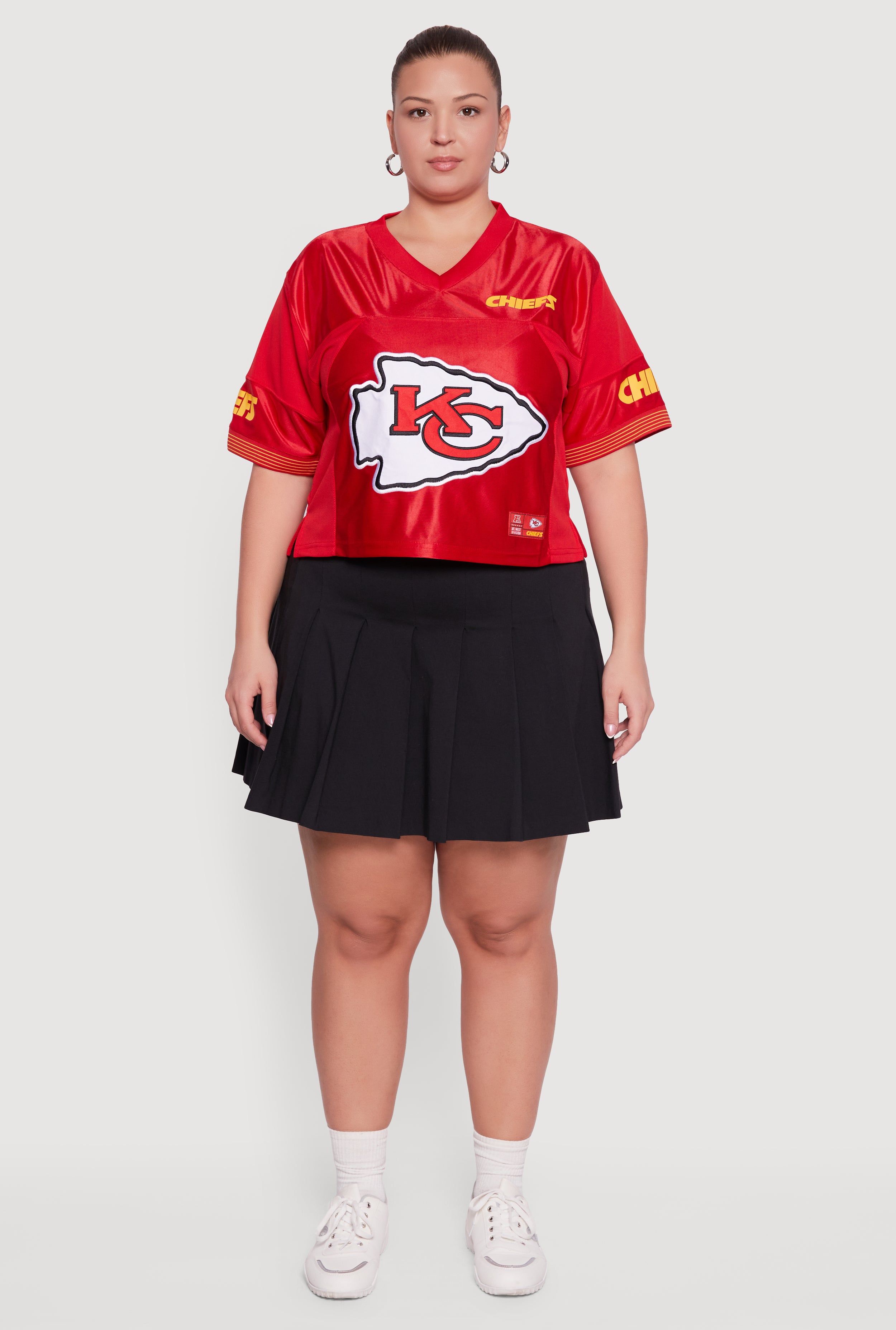 Score major style points with this Plus Size NFL Chiefs Cropped Jersey. Perfect for game day vibes or casual streetwear, this classic fit tee brings the heat with bold embroidered graphics and breathable jersey mesh fabric. The flattering V-neck and cropped cut make it a fresh, fun way to show off your team pride without sacrificing comfort. Ready to cheer loud and look even louder?