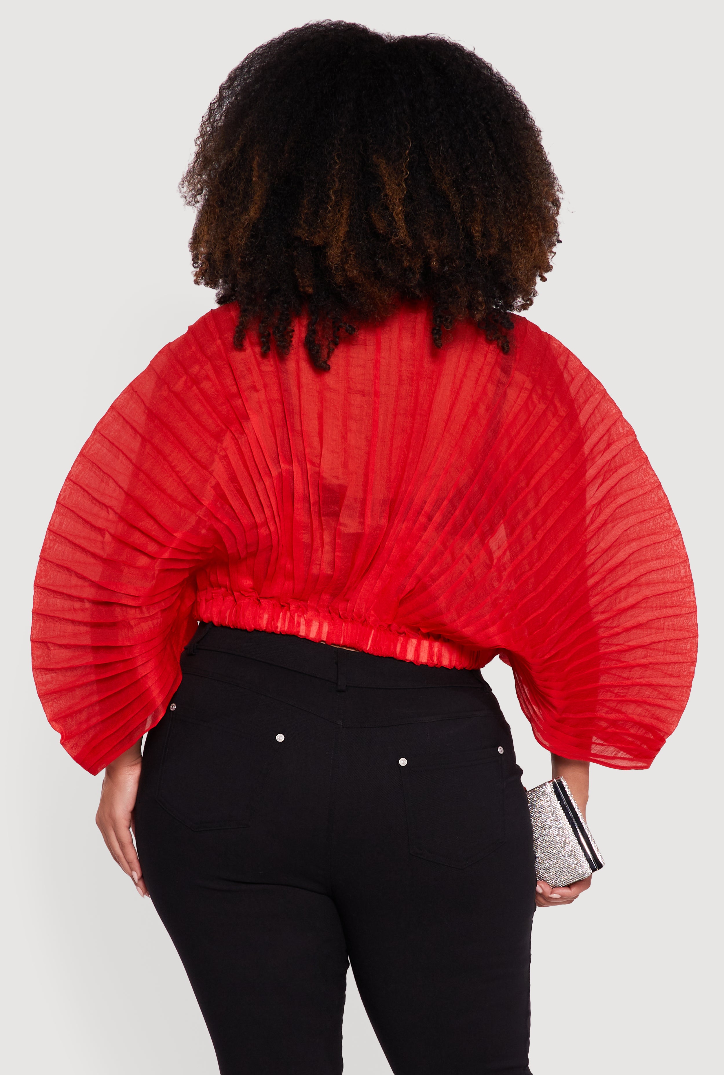 This crop top features a classic boat neckline and long dolman sleeves for an elegant silhouette. Accordion pleats add texture and movement to the chiffon fabric, creating a stylish layered effect. Its timeless fit pairs well with both casual and dressy looks.