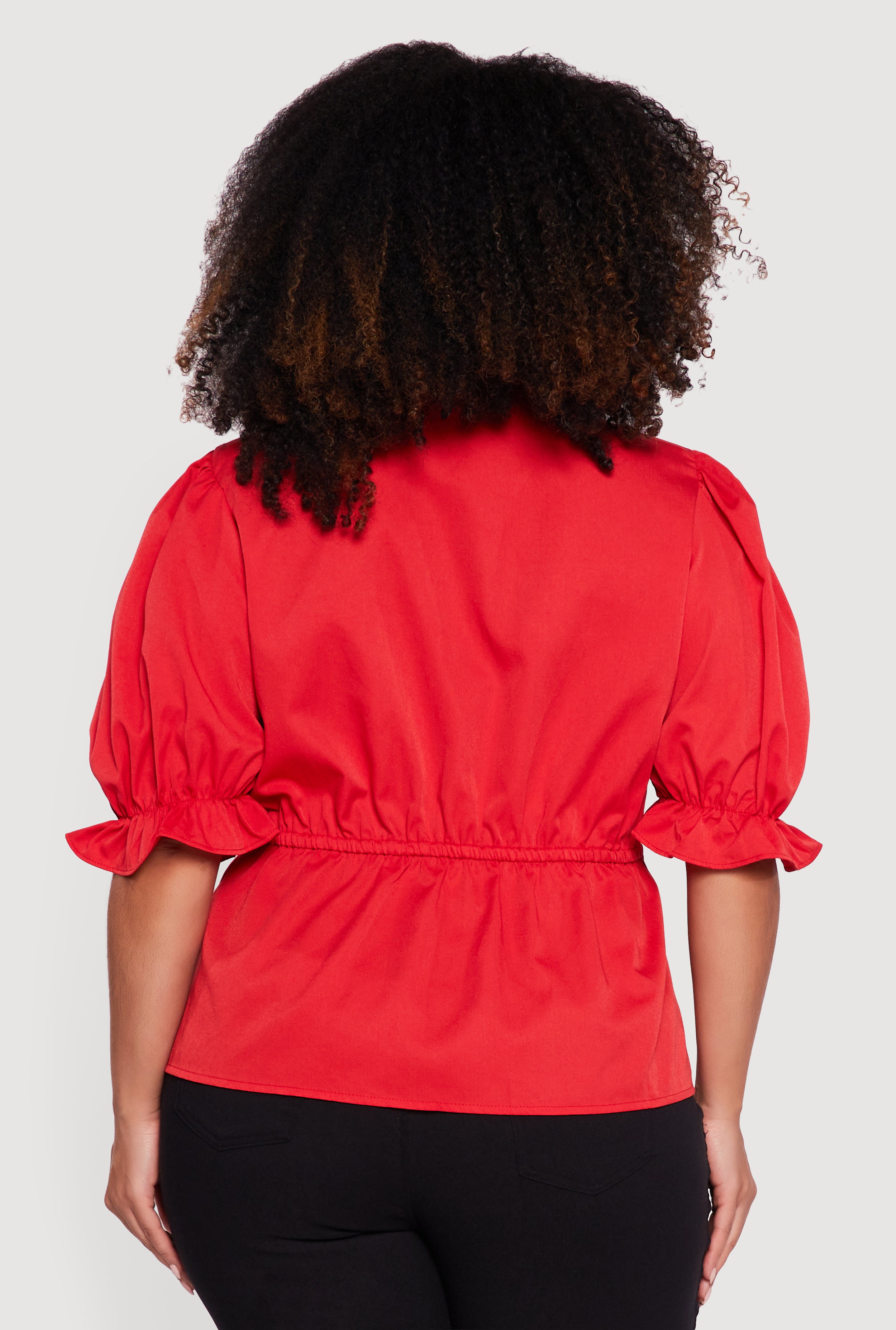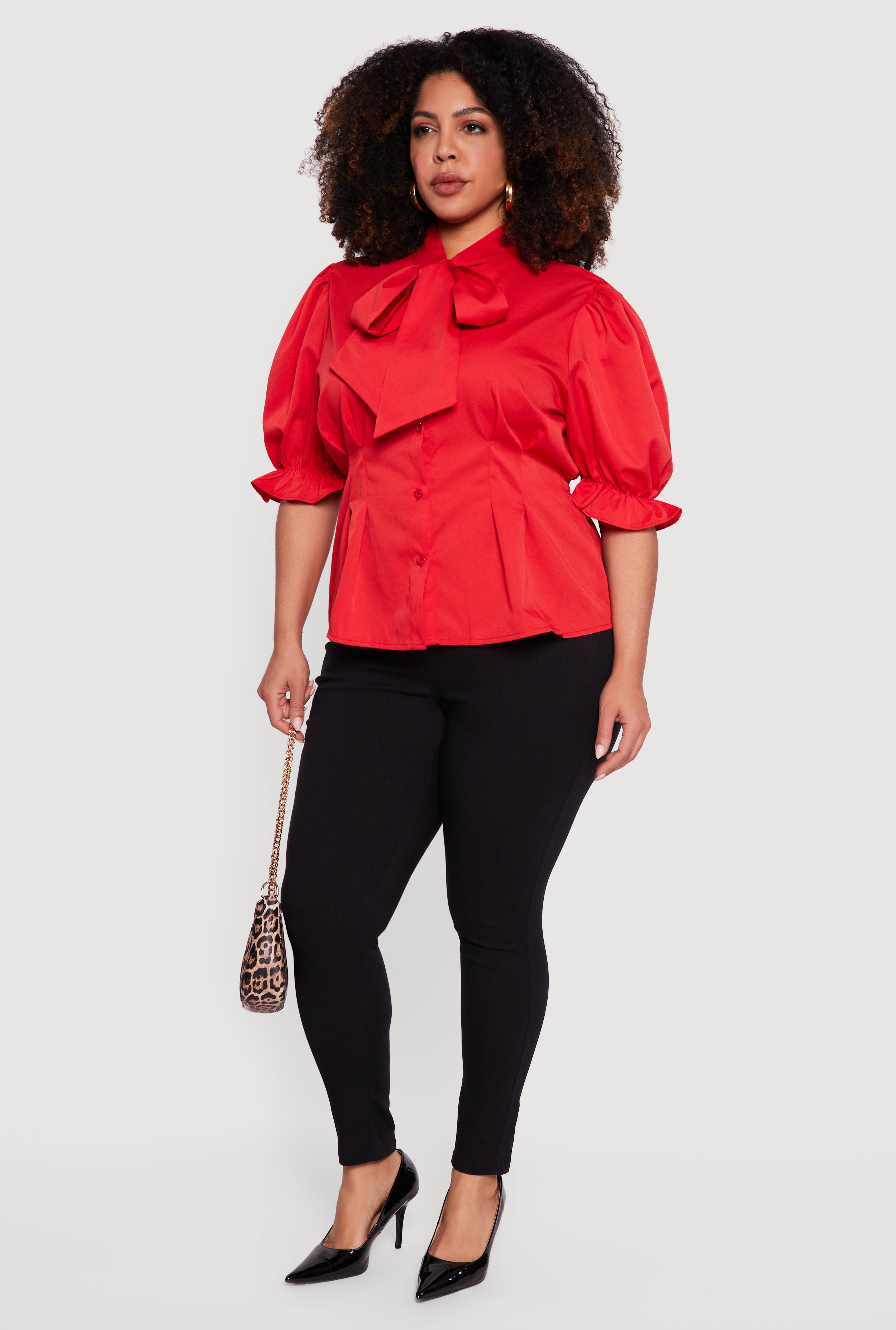 Plus Size Puff Sleeve Bow Tie Neck Blouse