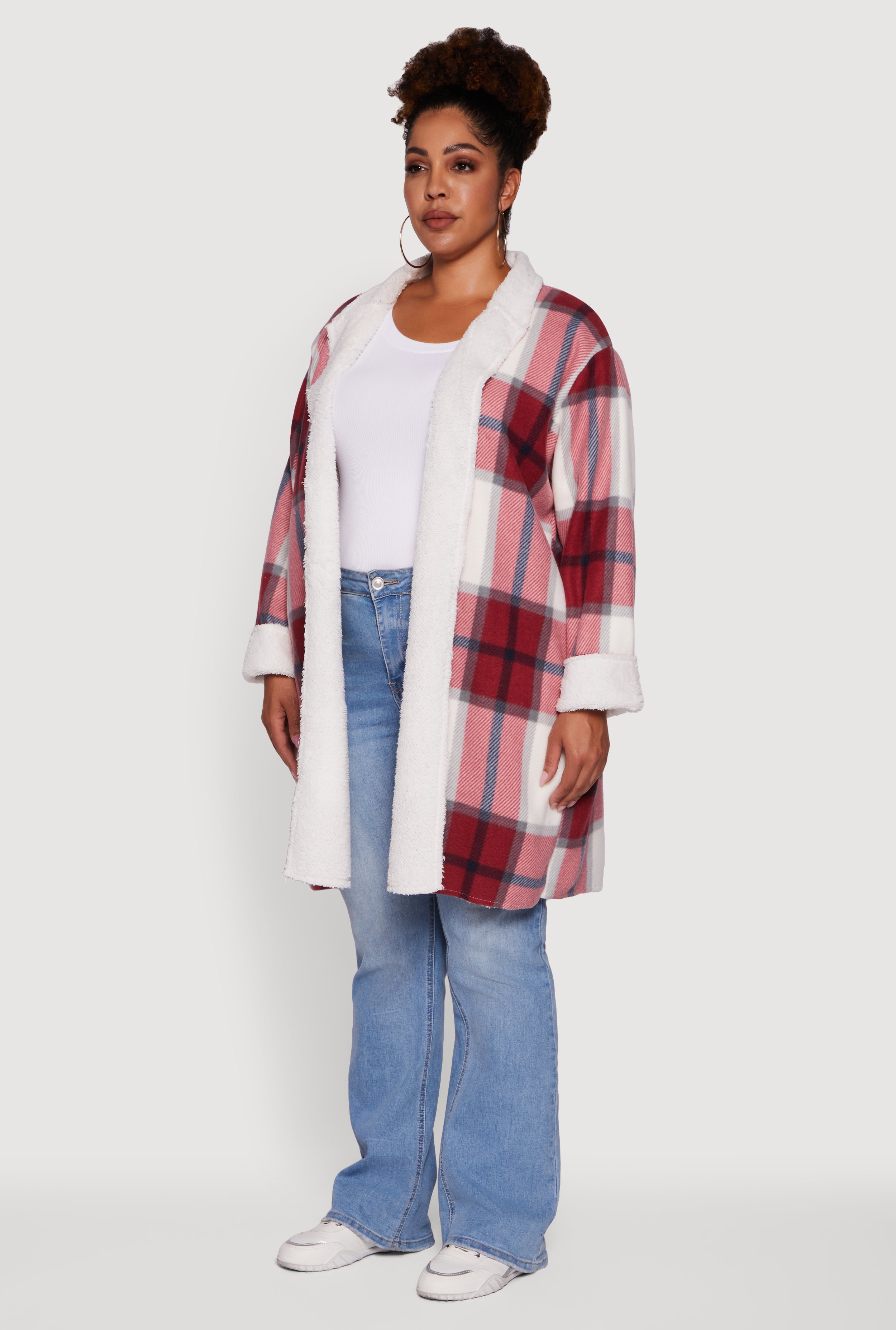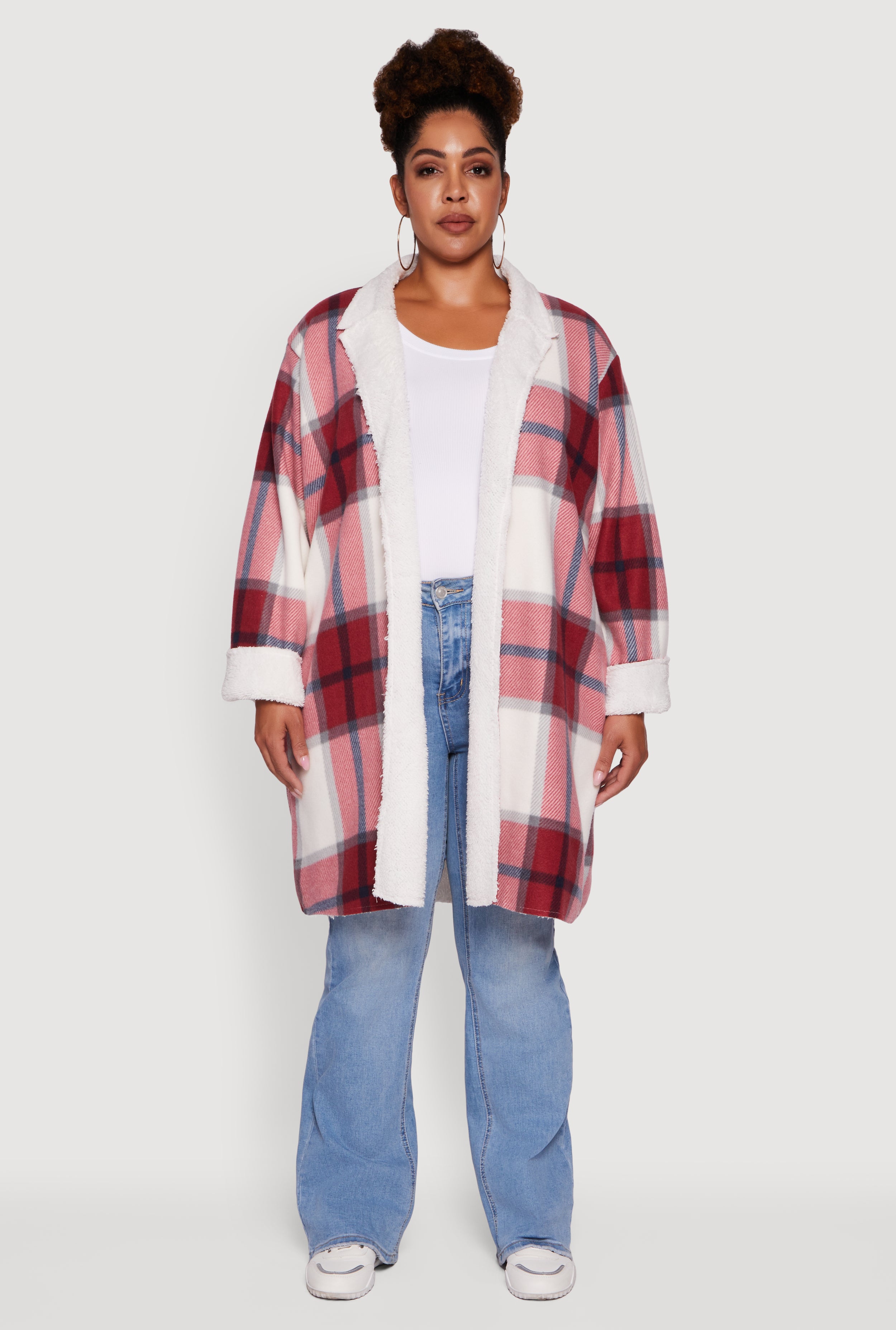 Step up your cozy game with this Plus Size Sherpa Lined Long Open Front Shacket. Perfect for layering on chilly days, it blends the warmth of sherpa and fleece with a laid-back plaid vibe. The open front and collared neckline keep it effortlessly stylish, while the maxi hem adds drama and coverage. Whether you are running errands or chilling with friends, this shacket is your new go-to for casual cool that feels as good as it looks.