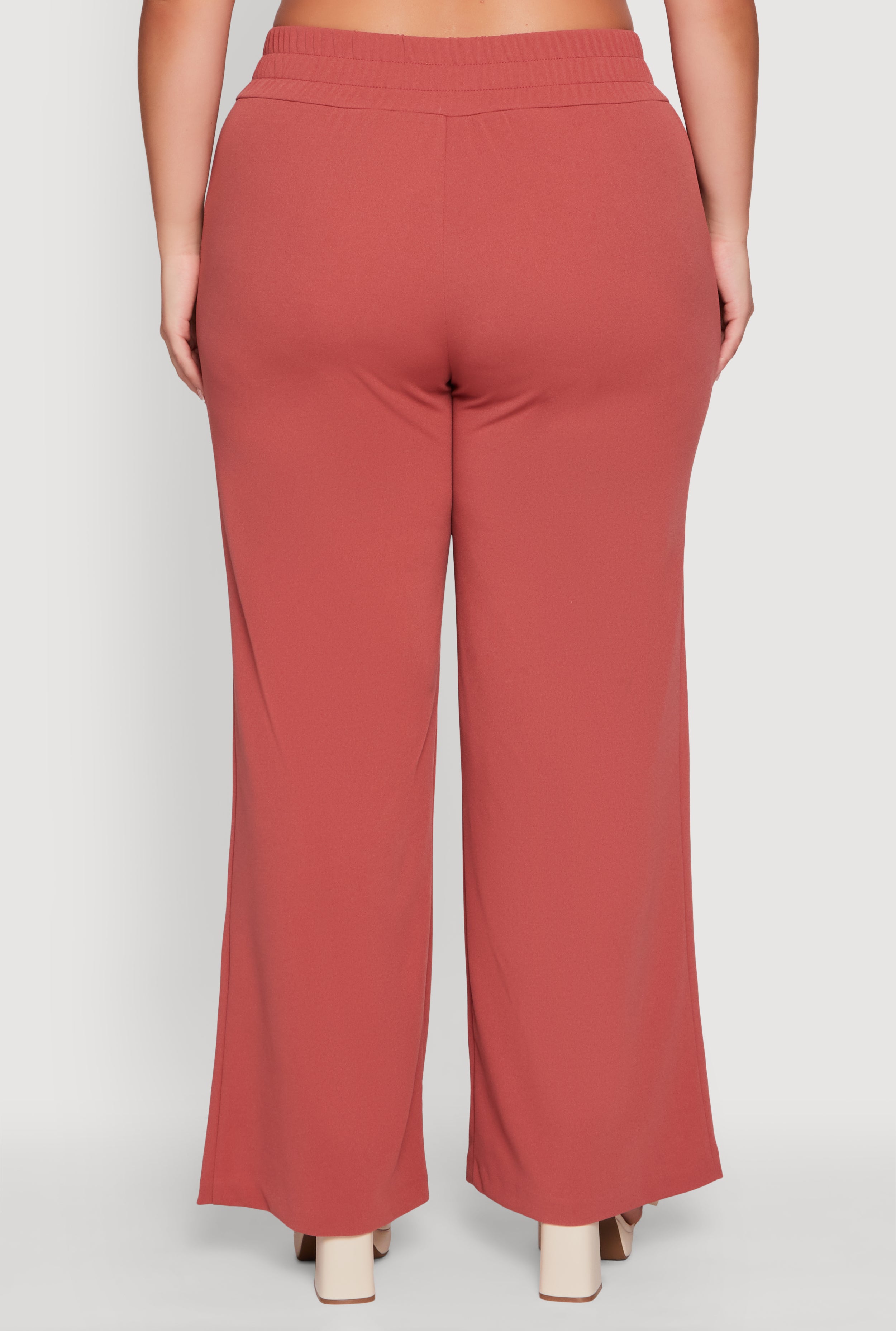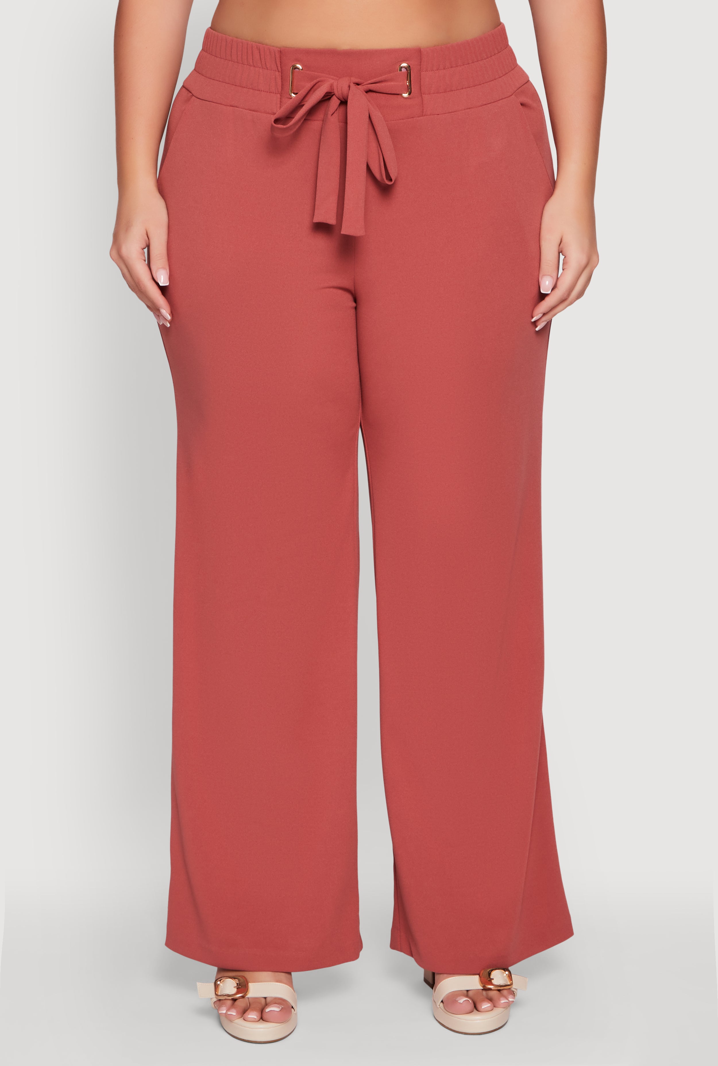 Step into effortless style with these Plus Size Crepe Knit Drawstring Detail Wide Leg Pants. Designed for comfort and confidence, they feature a high waist and loose wide leg fit that flatters every curve. The elastic waistband and pull-on design make getting dressed a breeze, while the subtle metallic grommet accents on the faux drawstring add a touch of cool edge. Perfect for dressing up or keeping it casual, these pants are your new go-to for easy, chic vibes.