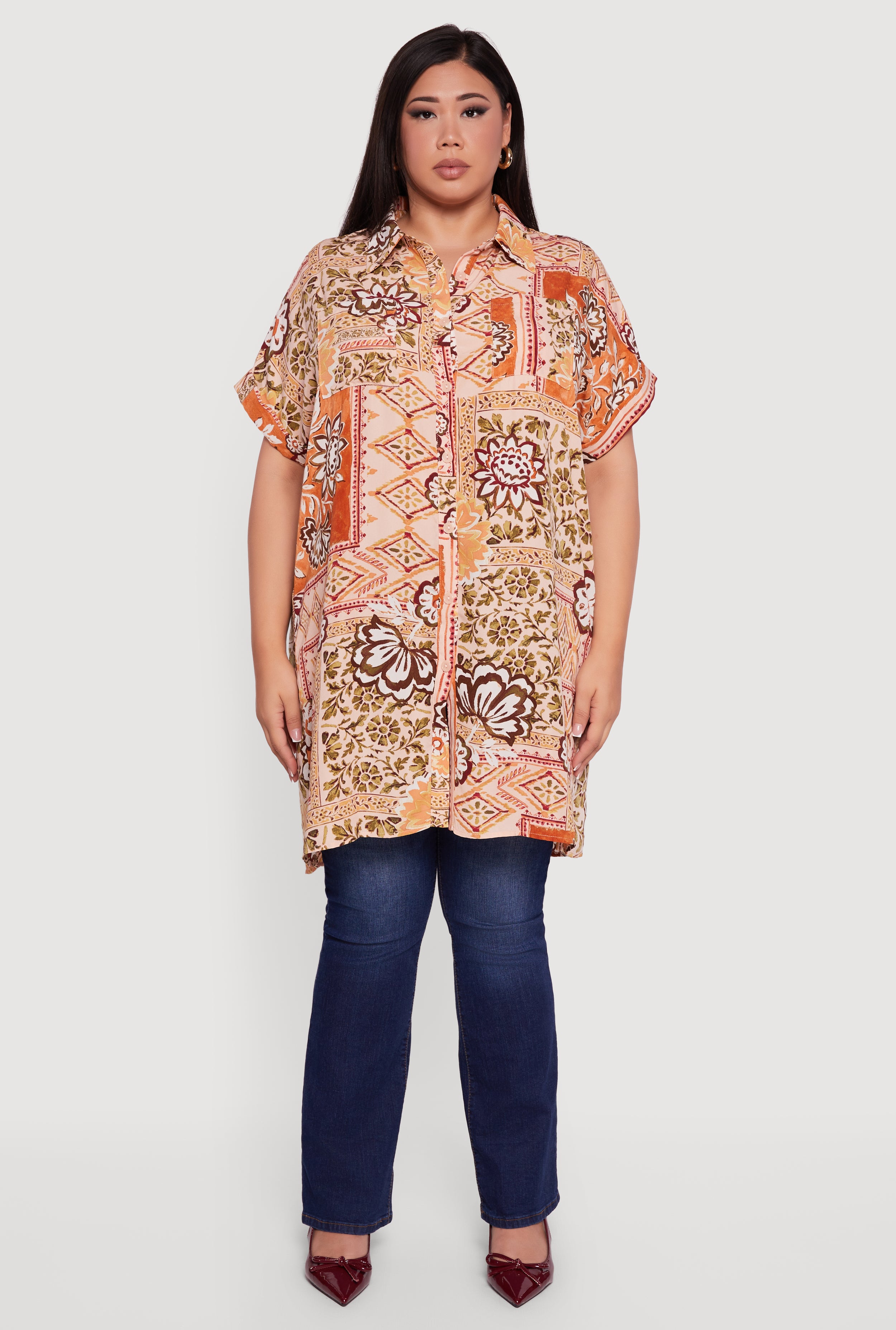 Step up your casual wardrobe with this Plus Size Patterned Button Front Tunic Shirt. Designed for effortless style and comfort, this classic fit tunic features a timeless silhouette that flatters your curves while keeping things breezy. The button front and shirt collar add a polished touch, making it perfect for laid-back days or casual outings. Its short sleeves and printed pattern bring a fresh vibe that pairs easily with your favorite jeans or leggings.