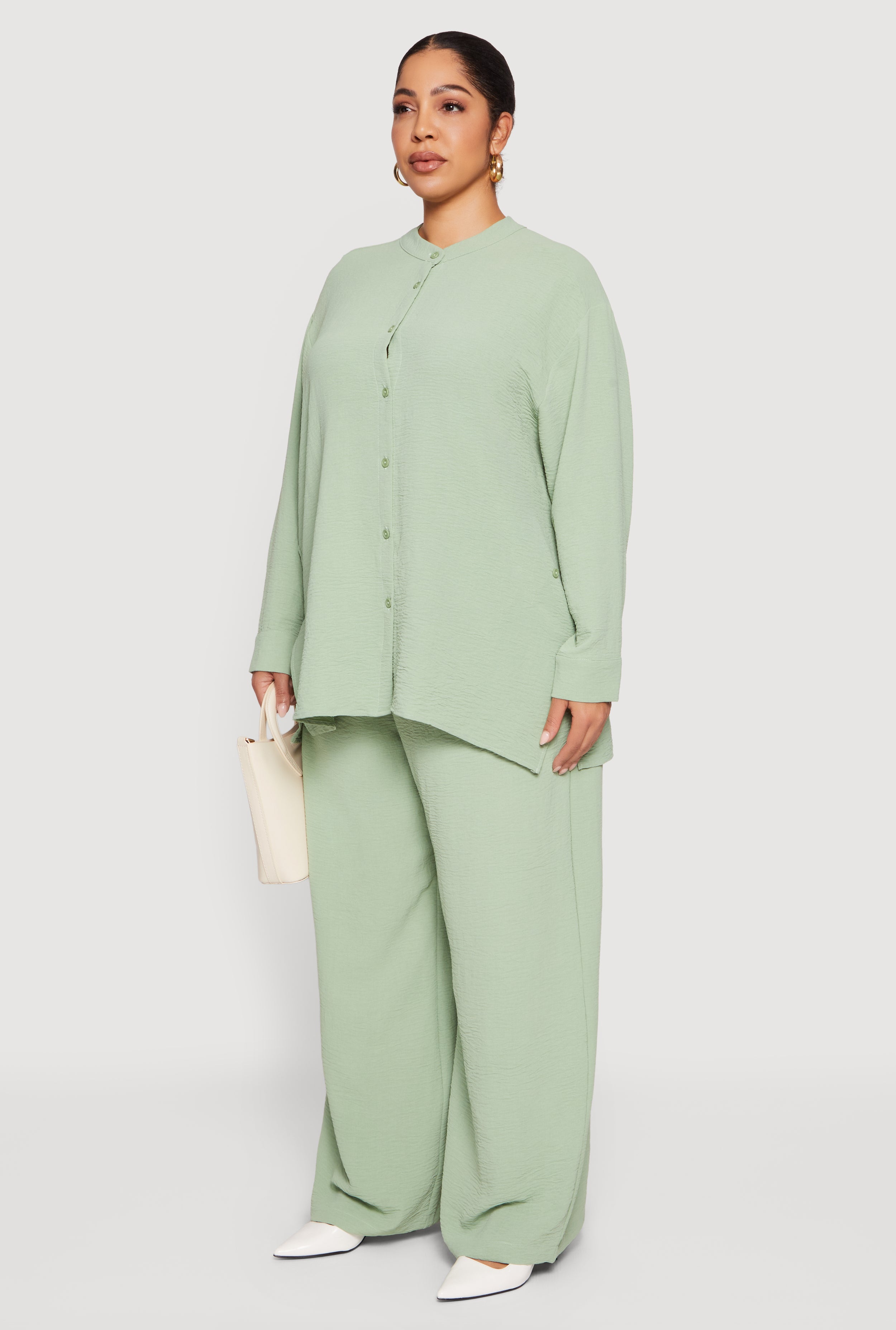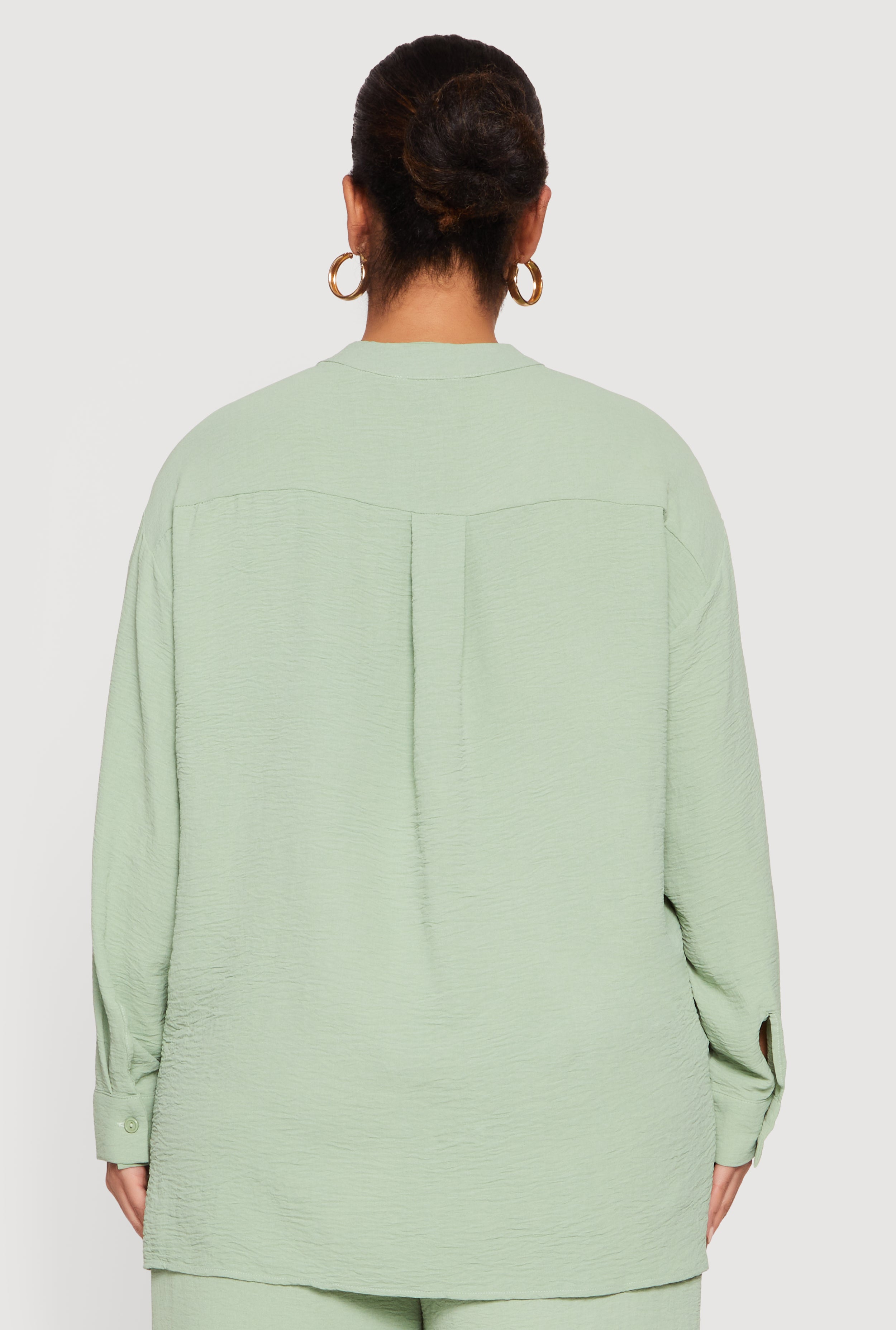 Step into effortless style with this Plus Size Airy Long Sleeve Button Front Blouse. Designed for comfort and a timeless look, this blouse features a classic fit that flatters your curves without sacrificing ease. The breathable crepe knit fabric keeps you cool whether you're at the office or out for a casual day. With a chic mandarin collar and side slits for added movement, it’s the perfect go-to piece to elevate your everyday wardrobe.
