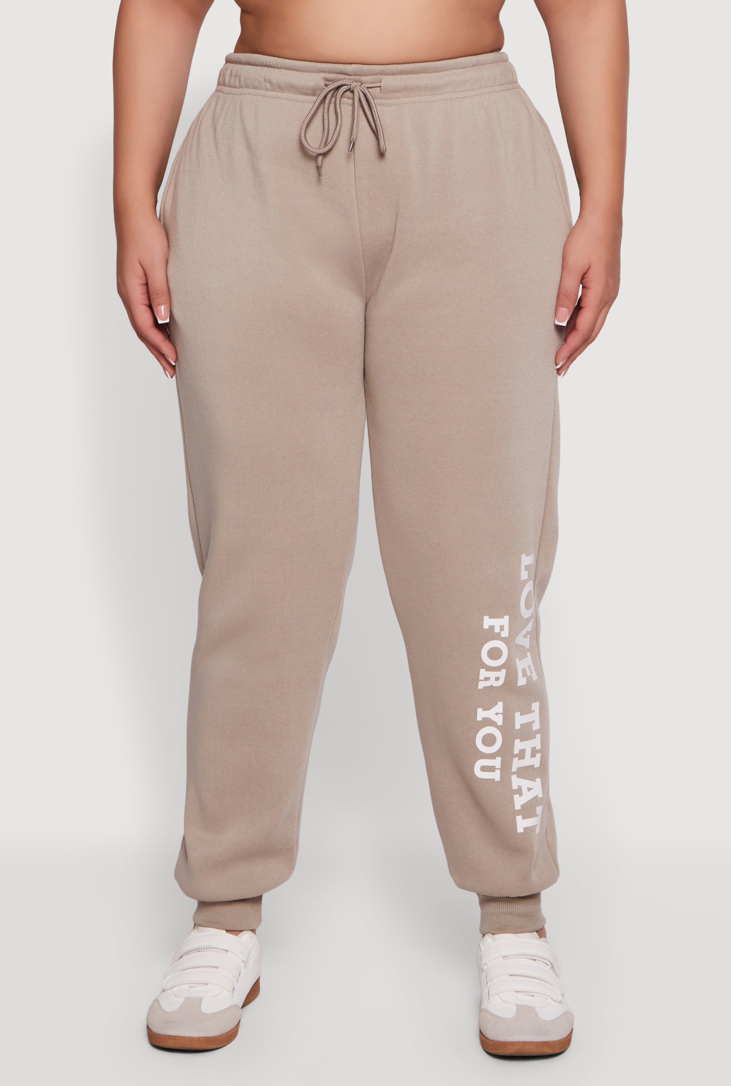 Slip into cozy vibes with these Plus Size Love That For You Fleece Joggers. Designed for all-day comfort and effortless style, these high-waisted joggers feature a relaxed fit and tapered ankle legs that flatter your curves while keeping you snug. The soft fleece fabric and adjustable drawstring waist make them perfect for lounging, running errands, or casual hangouts. Plus, the playful "Love That For You" graphic adds a fun, confident touch to your athleisure wardrobe.