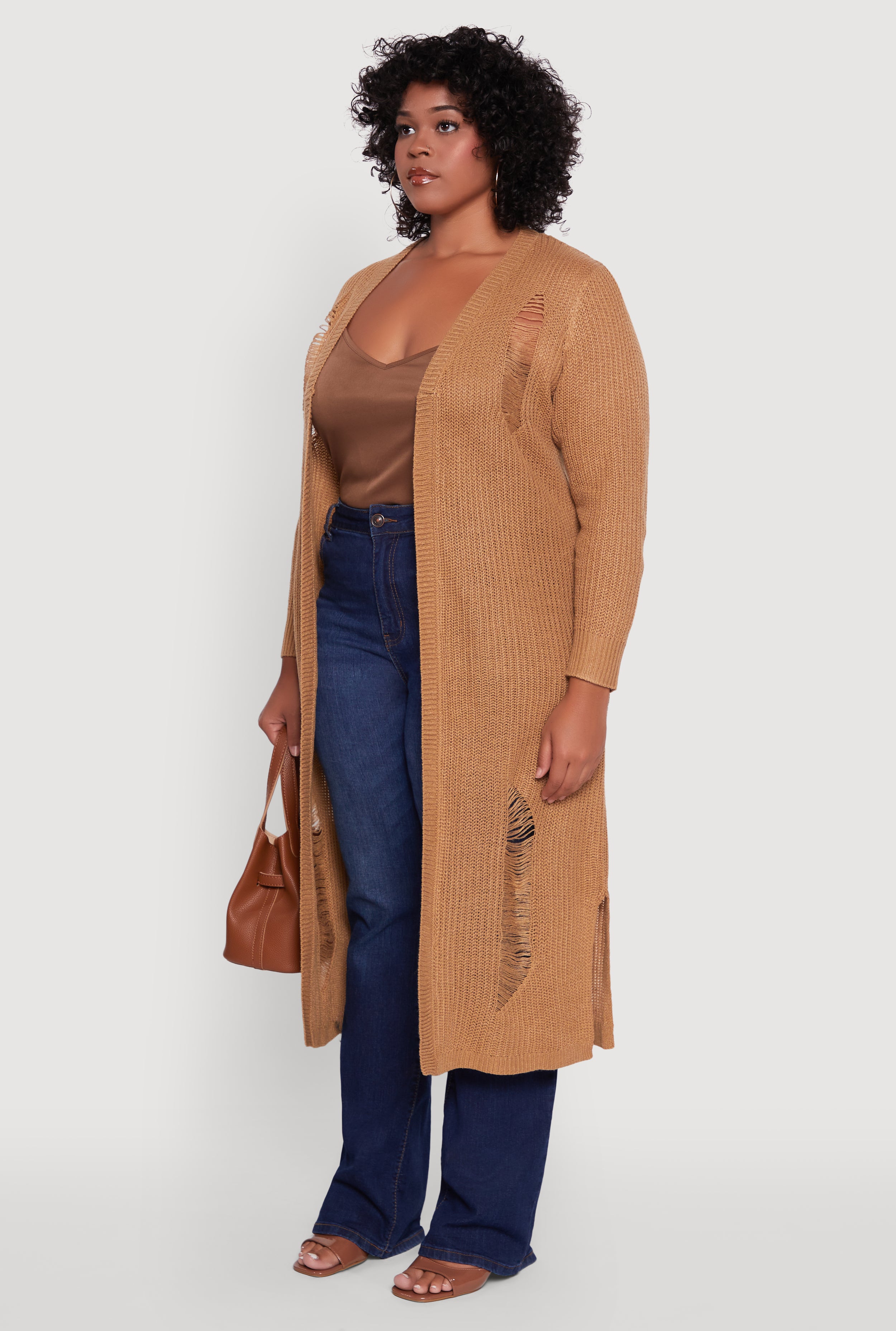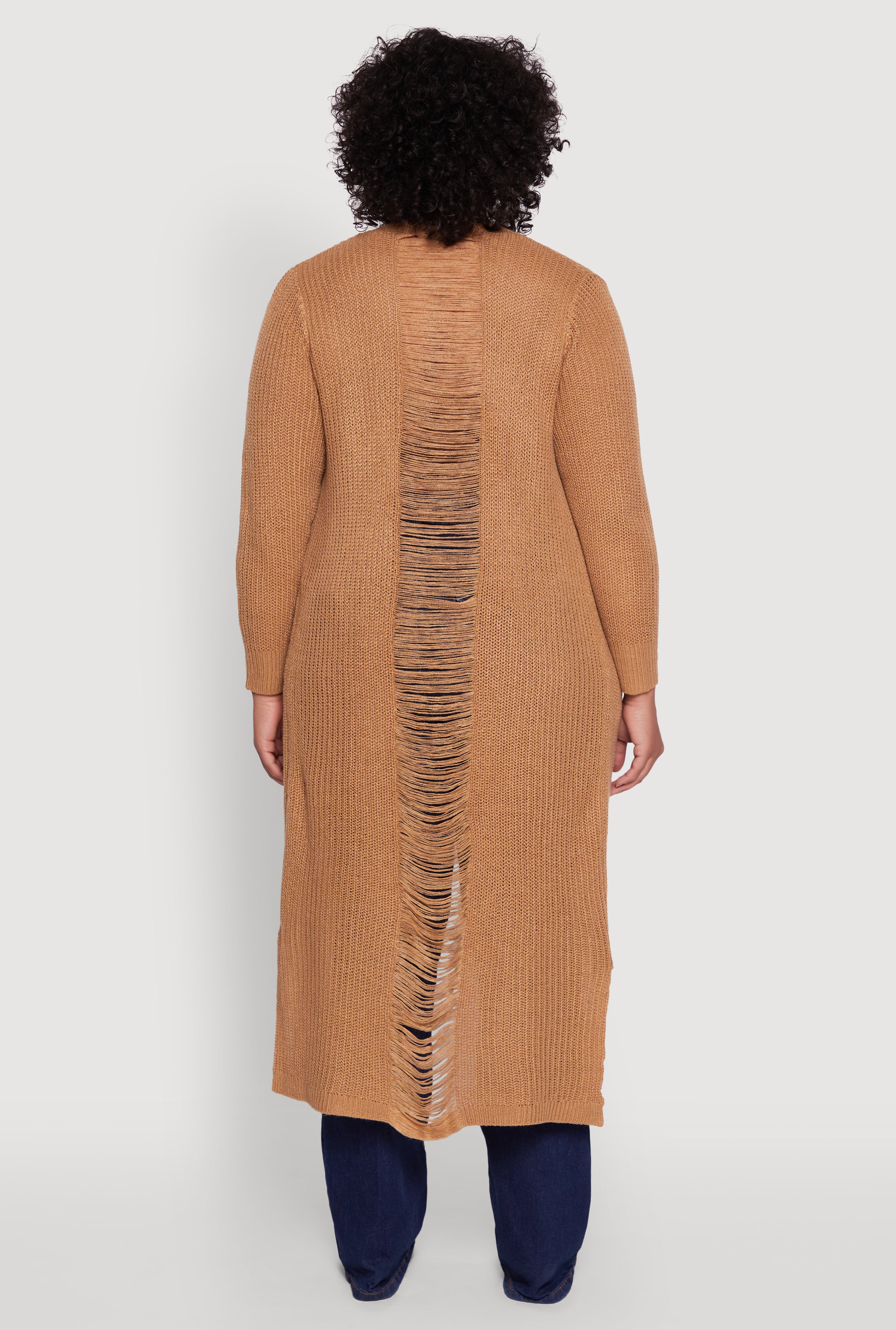 Step up your layering game with this Plus Size Distressed Long Sleeve Open Front Long Cardigan. Designed with a classic fit and a maxi hem, it effortlessly blends comfort with cool. The open front and collarless style make it easy to throw on over your favorite casual outfits, adding just the right amount of edge with its distressed details. Whether you are lounging at home or heading out for a chill day, this cardigan is your new go-to for that laid-back, stylish vibe.