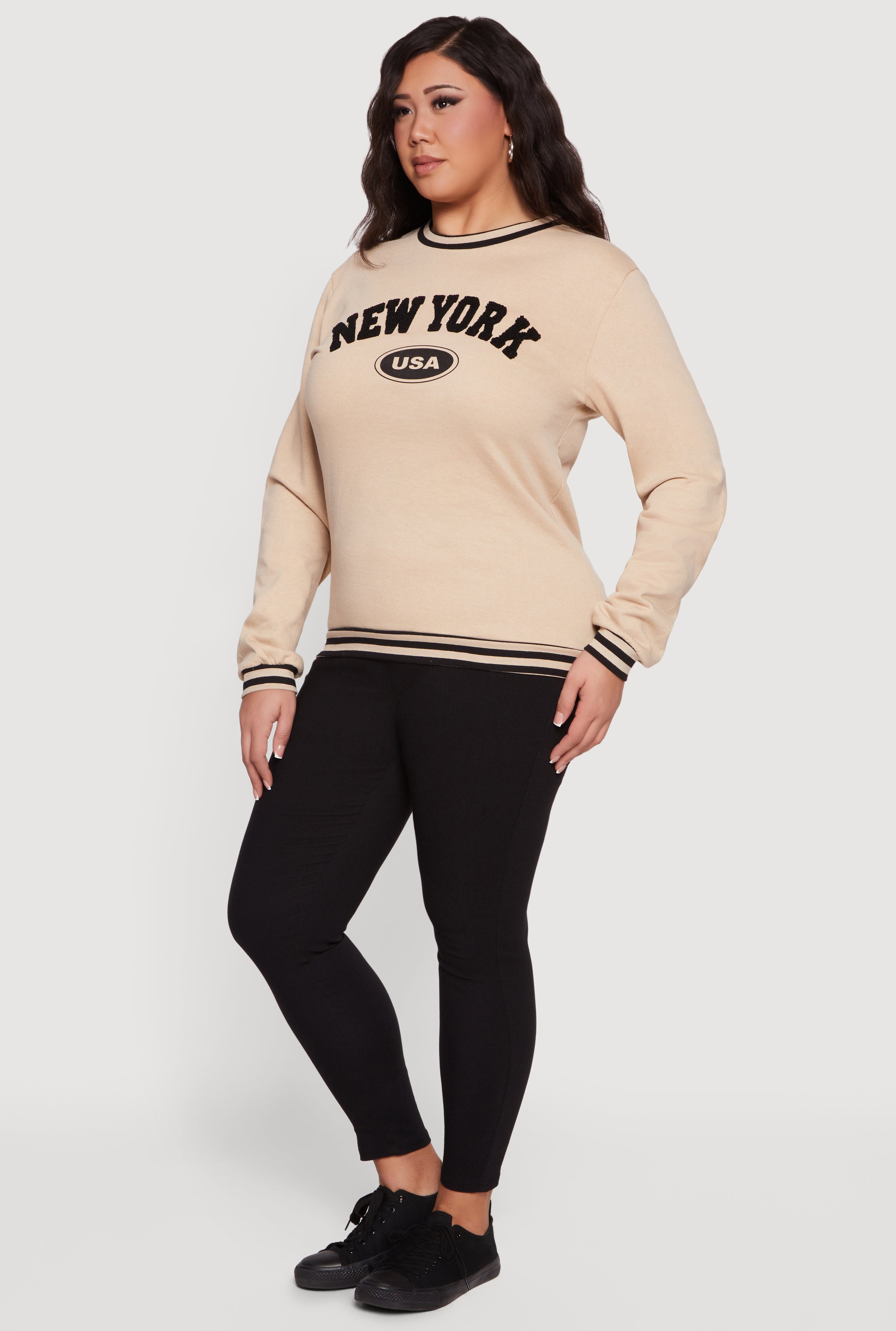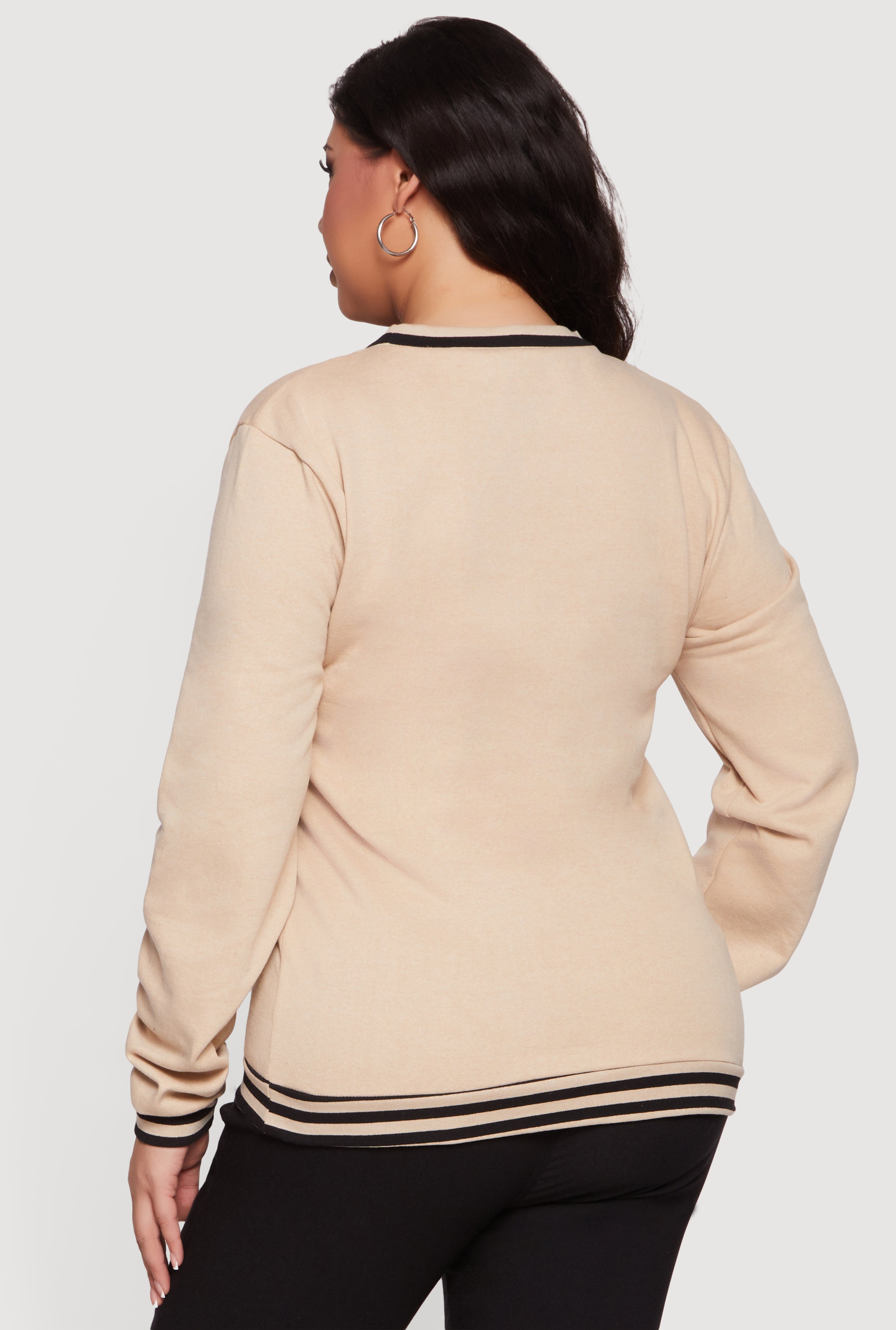 - Long sleeves with matching striped cuffs for a varsity-inspired look