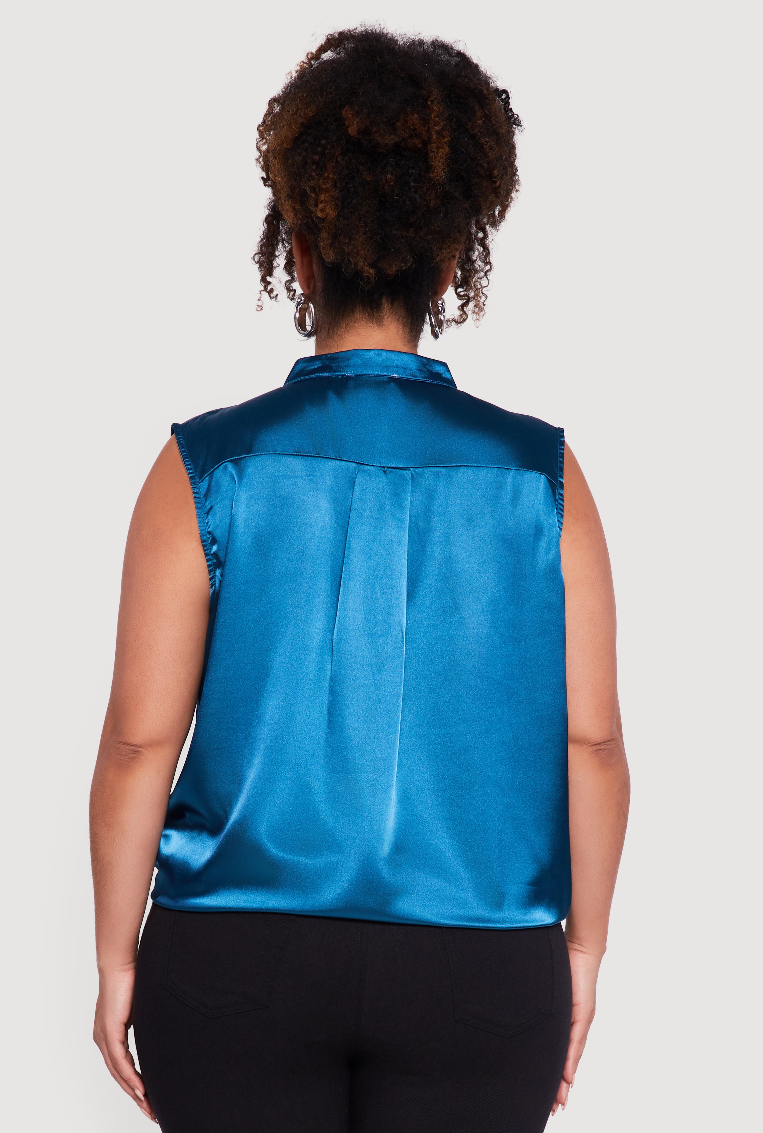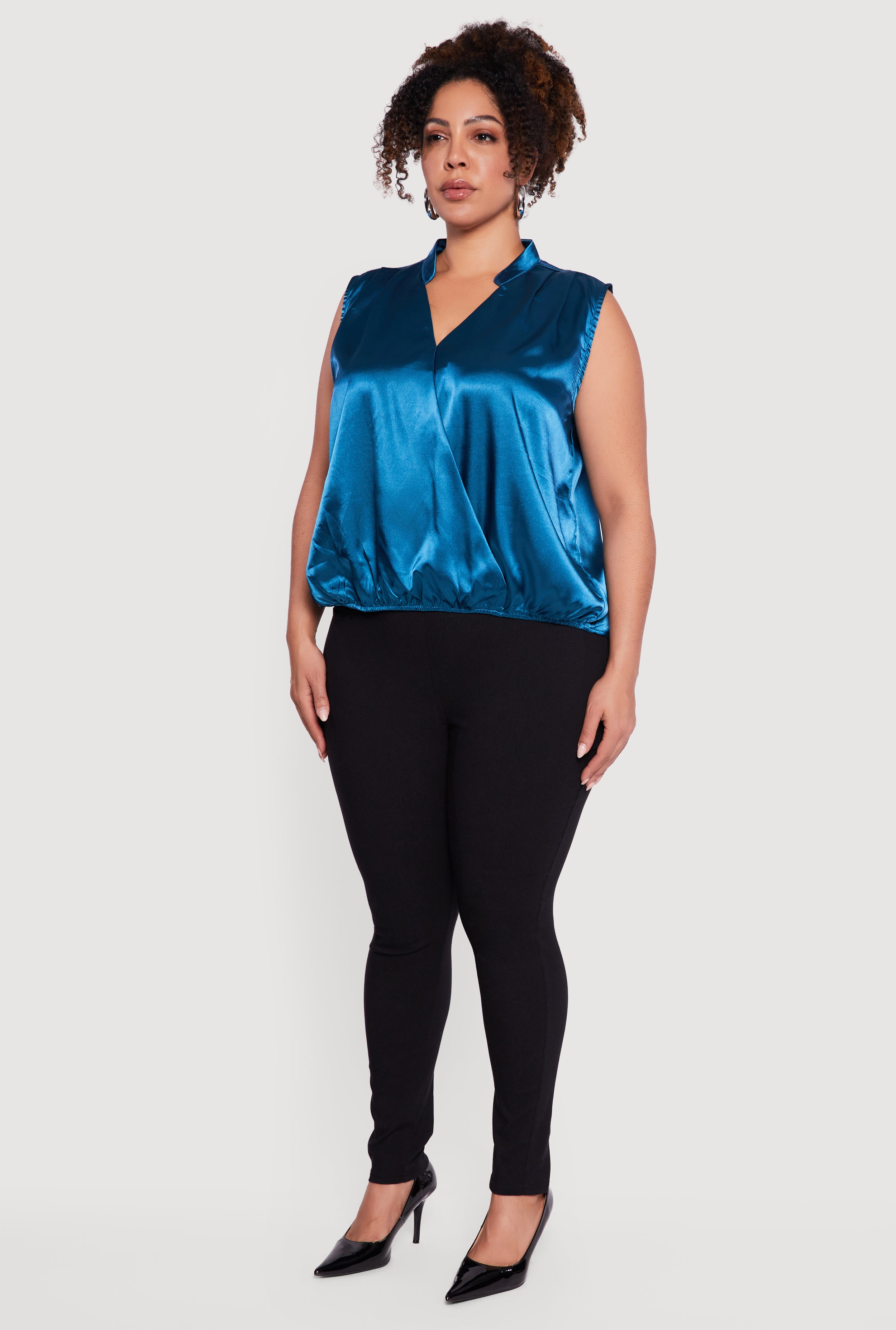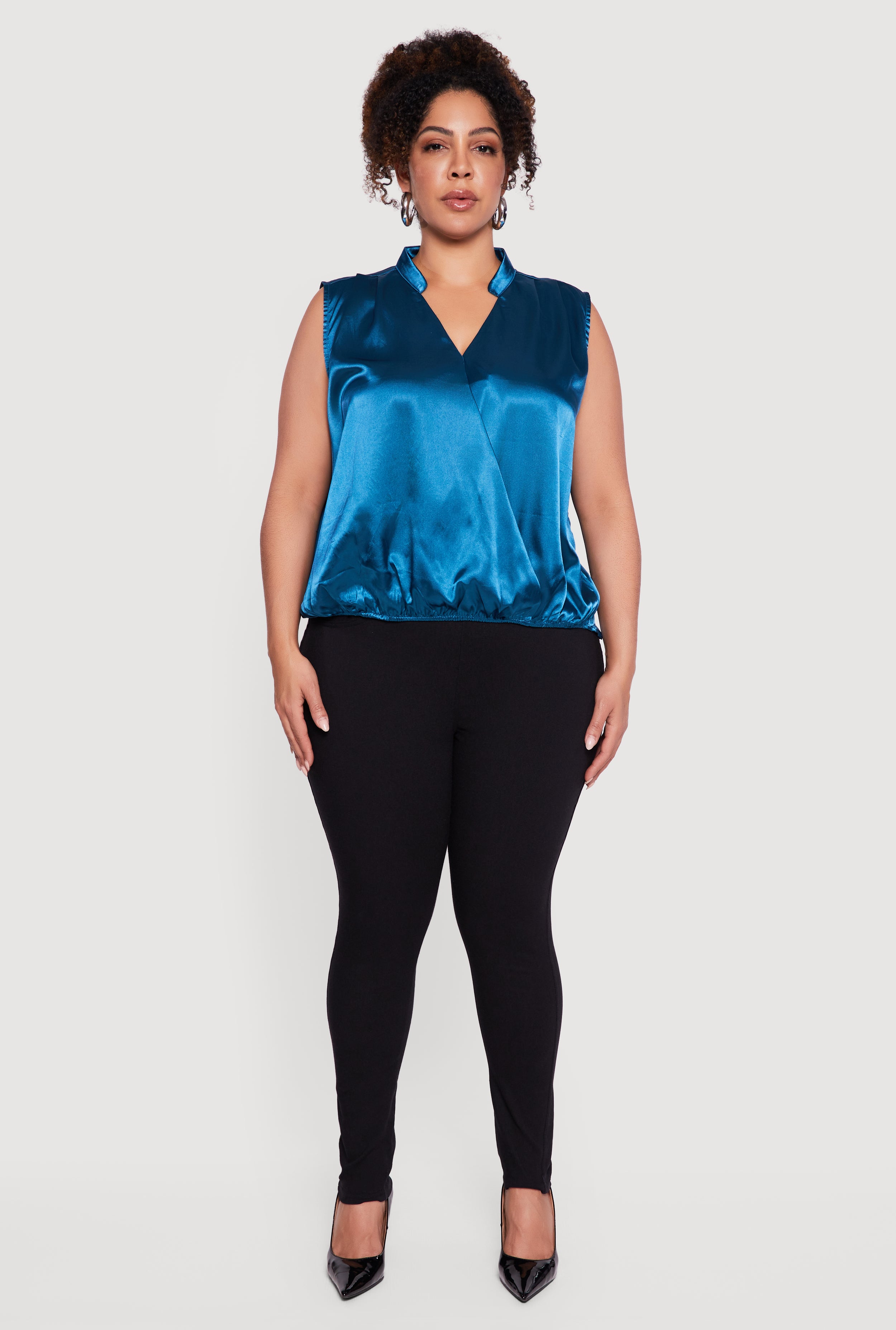 Step into effortless style with this Plus Size Sleeveless Notch Neck Satin Faux Wrap Top. Designed to flatter your curves with a classic fit, this satin blouse brings a touch of elegance to your casual night out looks. The sleeveless design and notch neckline add a modern twist while keeping things comfortable and chic. Whether you're dressing up for a date or meeting friends, this solid-colored wrap top is your new go-to for easy, confident style.