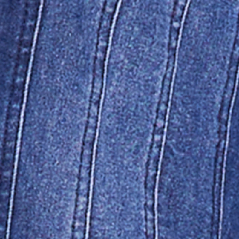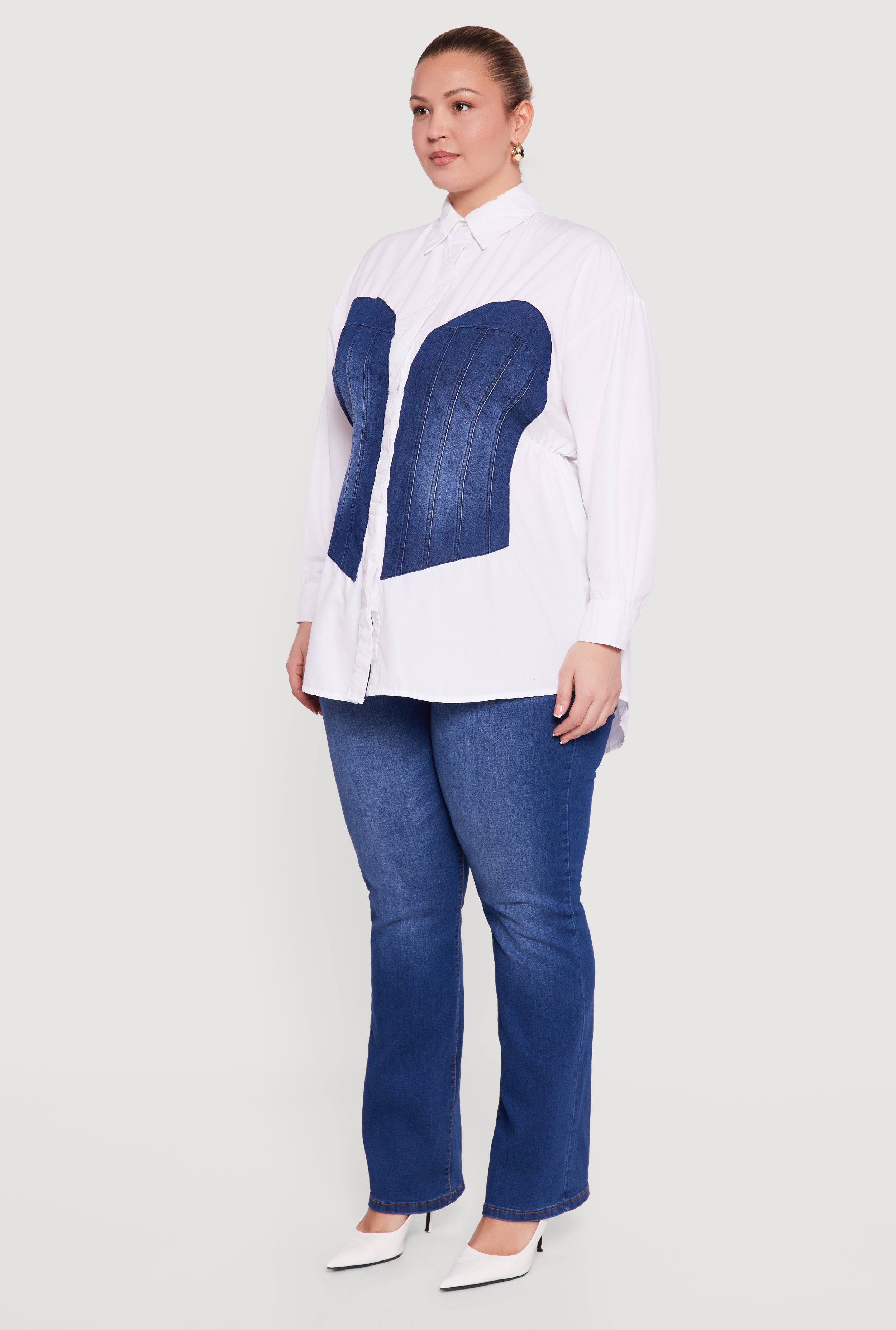 - Denim corset panels cinch the waist for a shapely silhouette