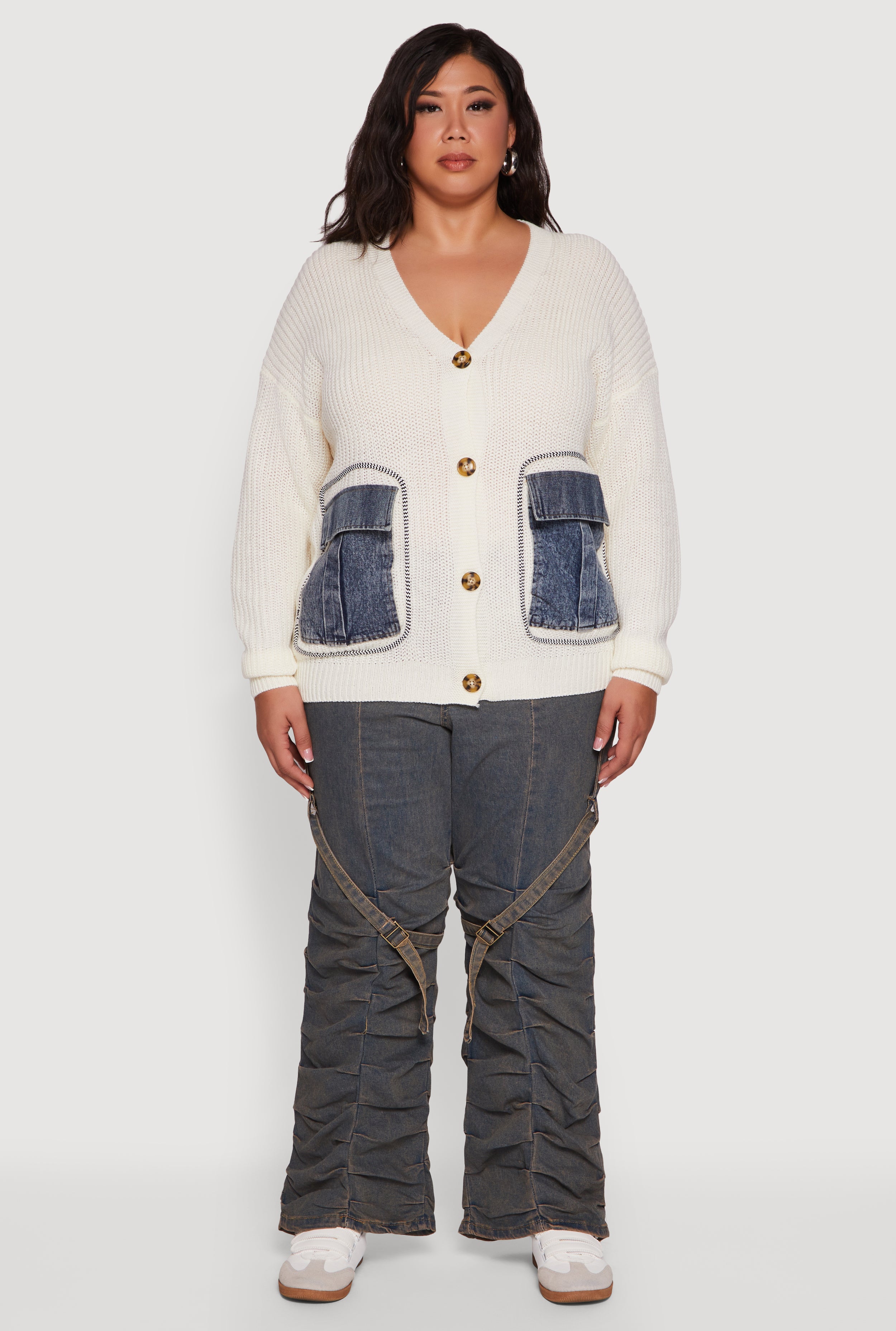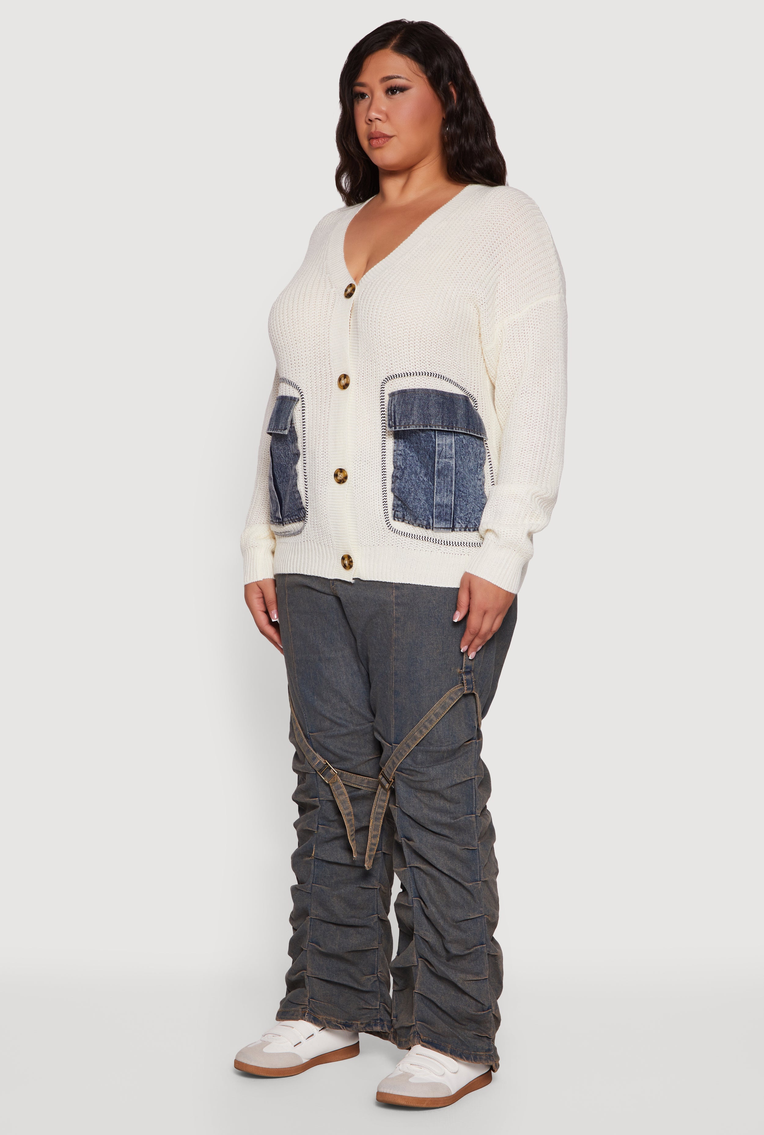 Step up your casual game with this Plus Size Denim Pocket Contrast Trim Button Front Cardigan. Designed with a classic fit that flatters every curve, this cardigan features a trendy color-blocked design and contrast trim that adds just the right pop. The V-neckline and long sleeves with drop shoulder styling make it effortlessly cool and comfortable for everyday wear. Perfect for layering, it’s got handy denim cargo pockets that blend style with function. Whether you’re out with friends or running errands, this cardigan brings streetwear vibes with a cozy twist.