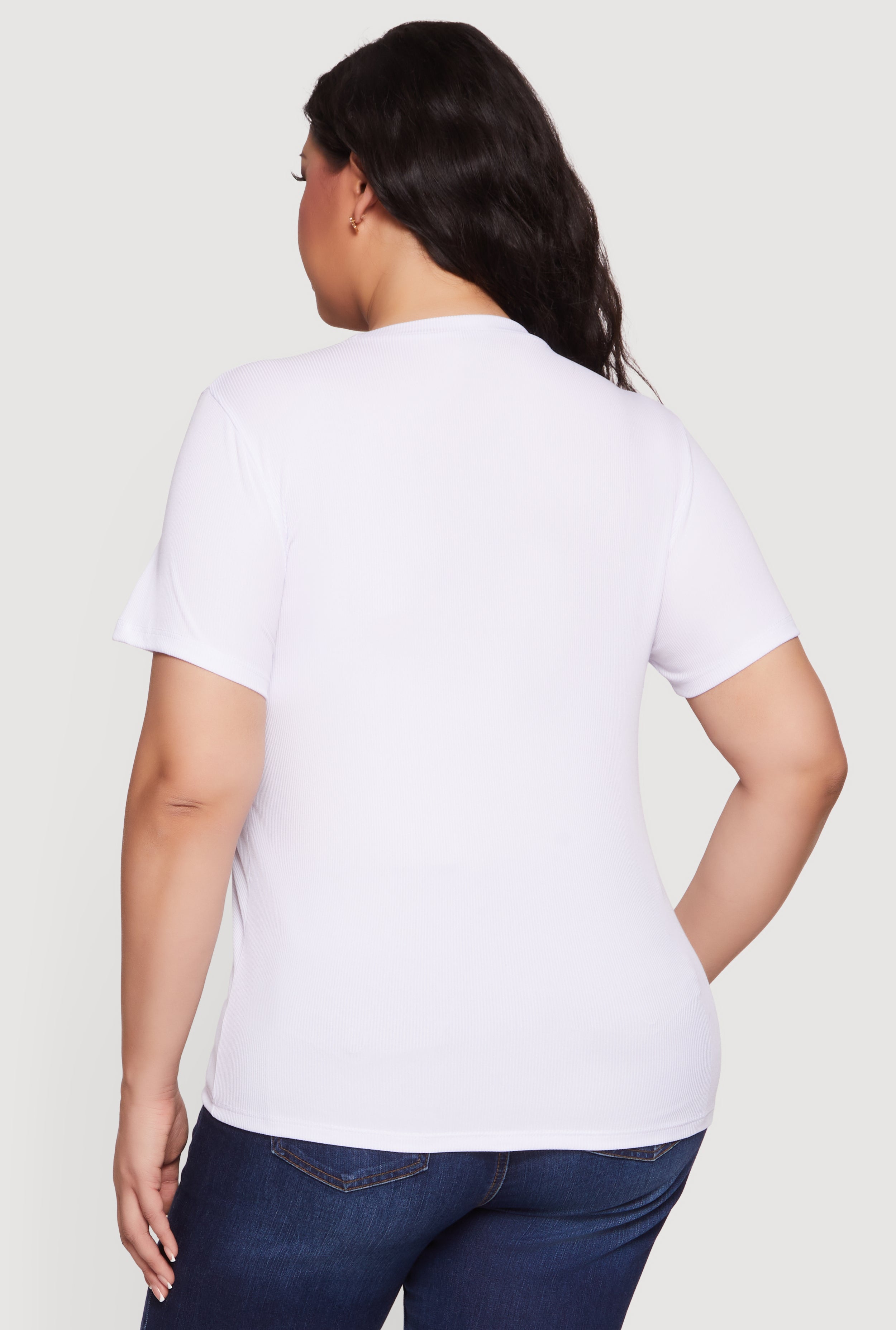 This classic fit tee features a crew neckline and short sleeves for easy layering. Crafted from ribbed knit fabric, it offers a timeless silhouette with a streetwear edge. Decorative rhinestone and denim patches add a playful, casual vibe perfect for everyday wear.