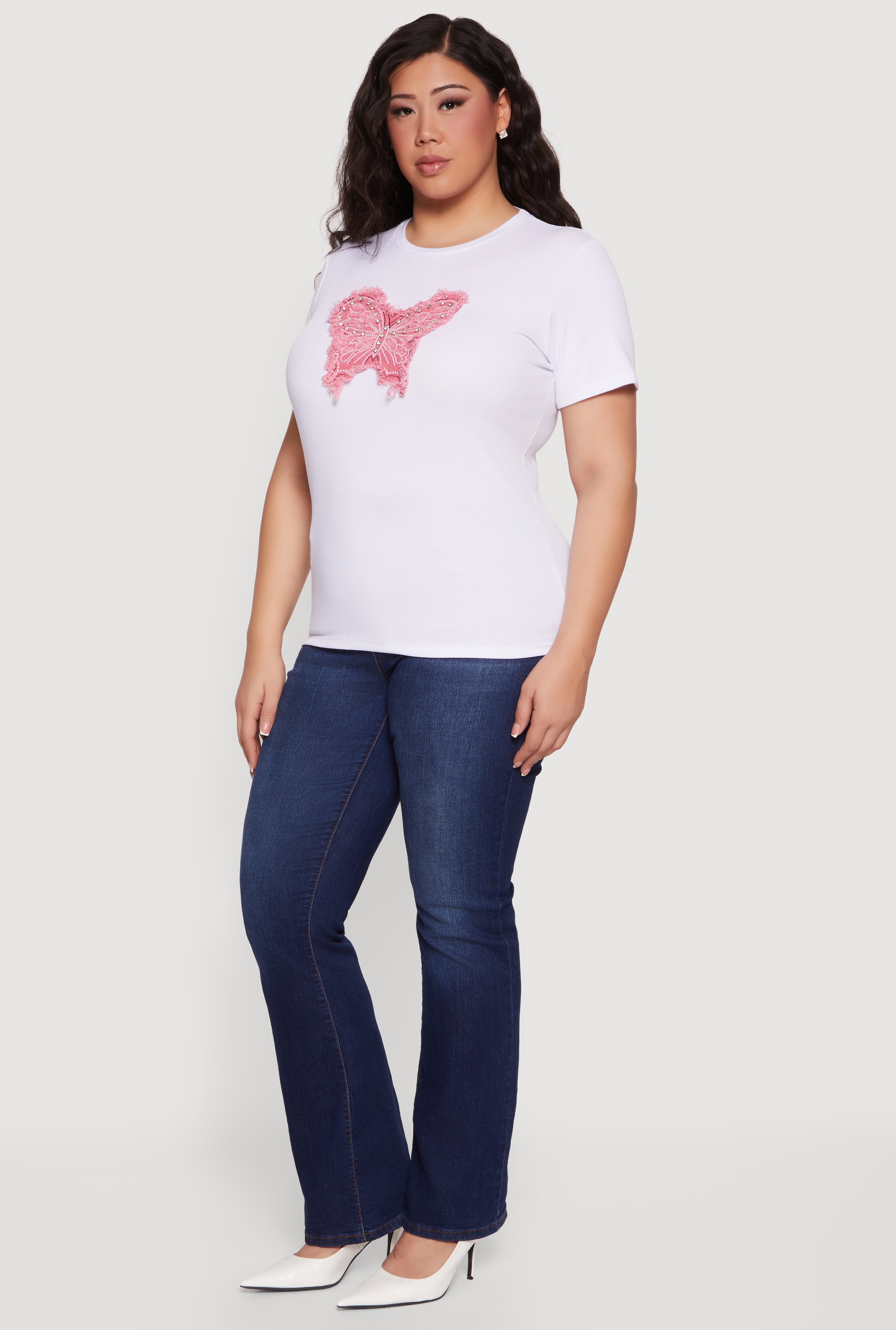 Plus Size Butterfly Rhinestone Denim Patch Tee