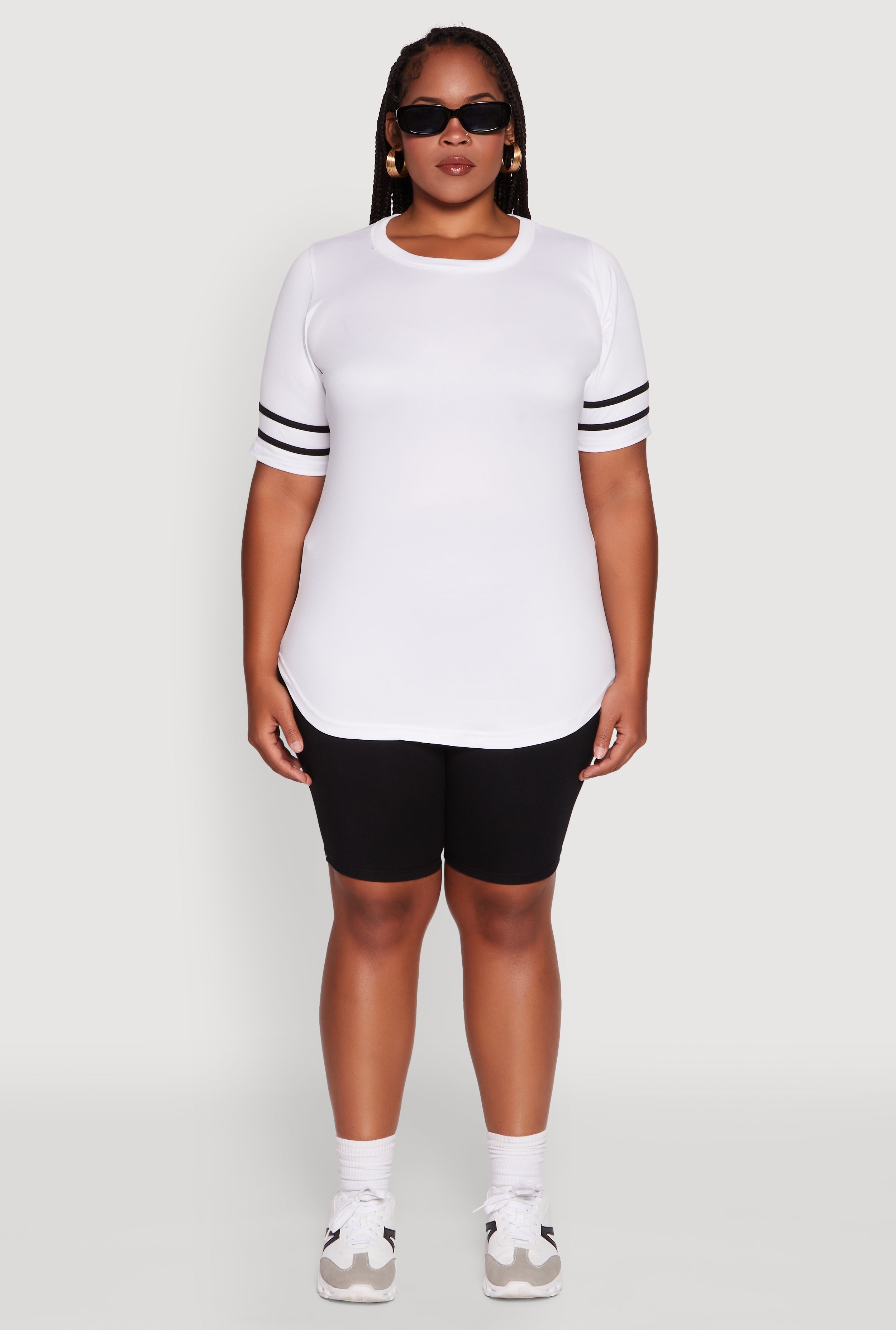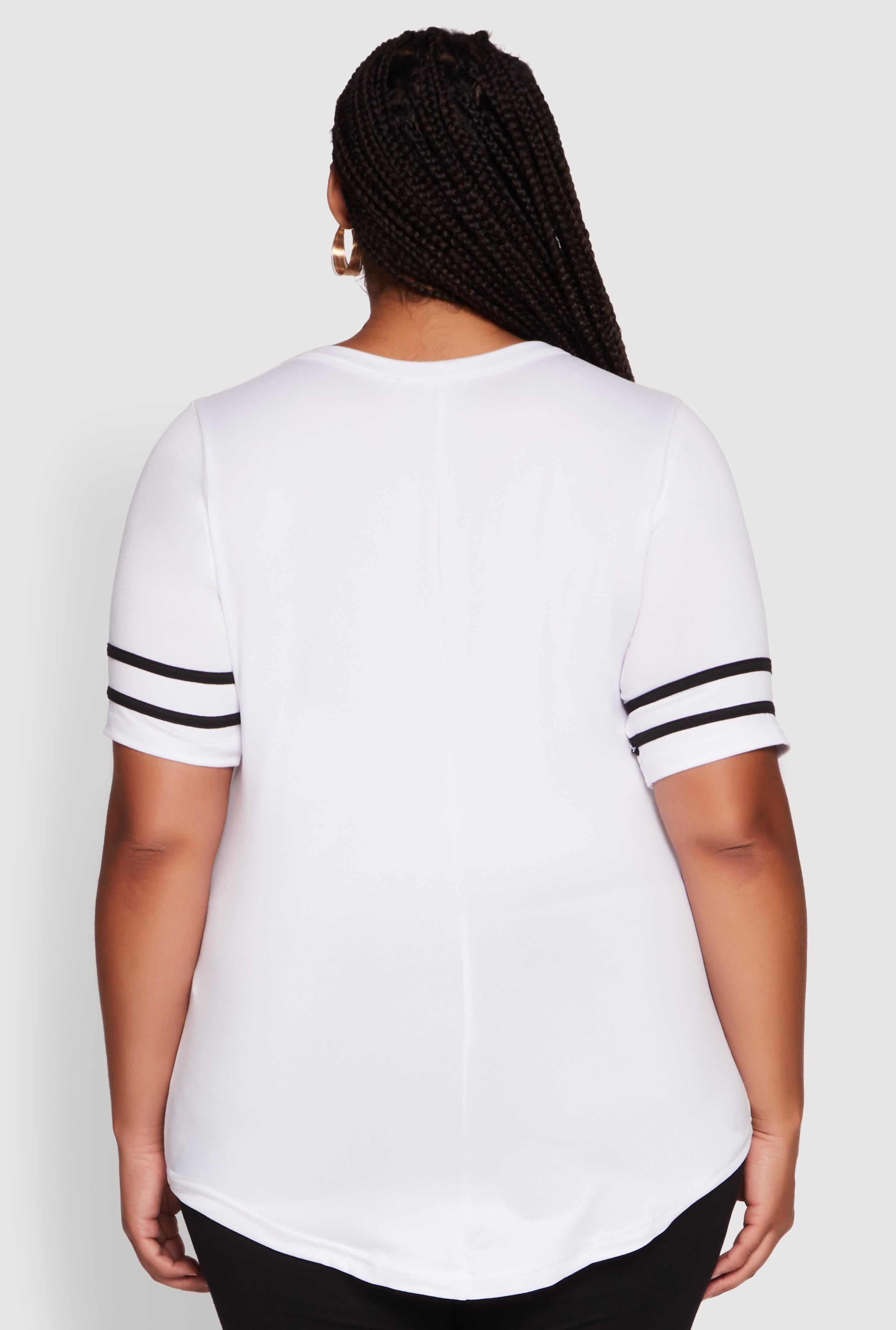 Step up your casual style game with this Plus Size Classic Fit Tunic T-Shirt featuring sporty varsity stripes. Designed for ultimate comfort and a timeless silhouette, this tunic tee pairs perfectly with your favorite jeans or leggings for effortless athleisure vibes. The crew neck and short sleeves keep it cool and easy, making it your go-to for laid-back days that still demand a touch of style.