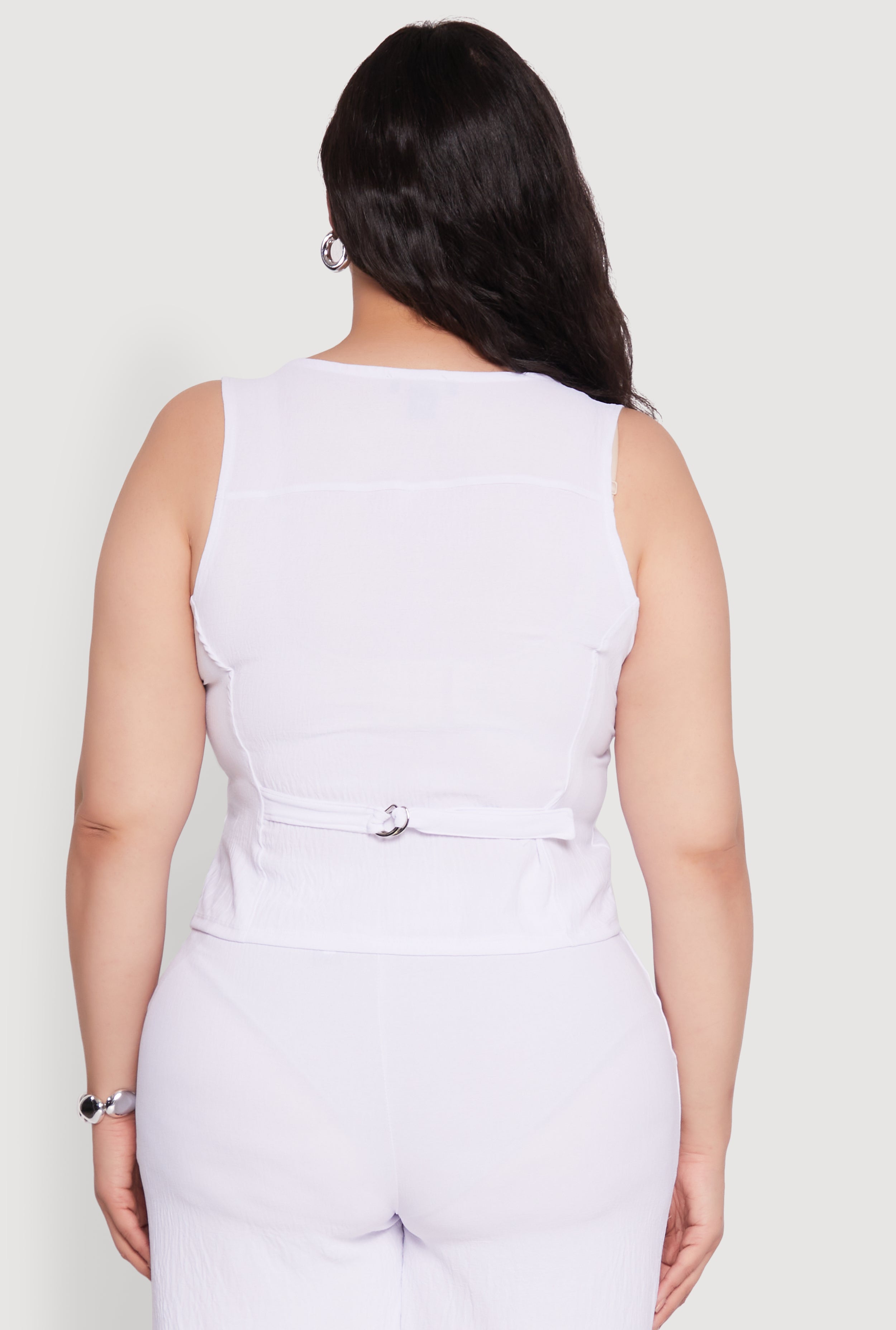 Upgrade your wardrobe with our Plus Size Crepe Knit Button Front Blazer Vest. Perfect for adding a chic touch to any outfit, this sleeveless blazer vest features a stylish V-neck and a flattering button front design. Whether you're dressing up or keeping it casual, its adjustable strap detail make it versatile and comfortable for all-day wear. Embrace your curves and stay on-trend without breaking the bank!
