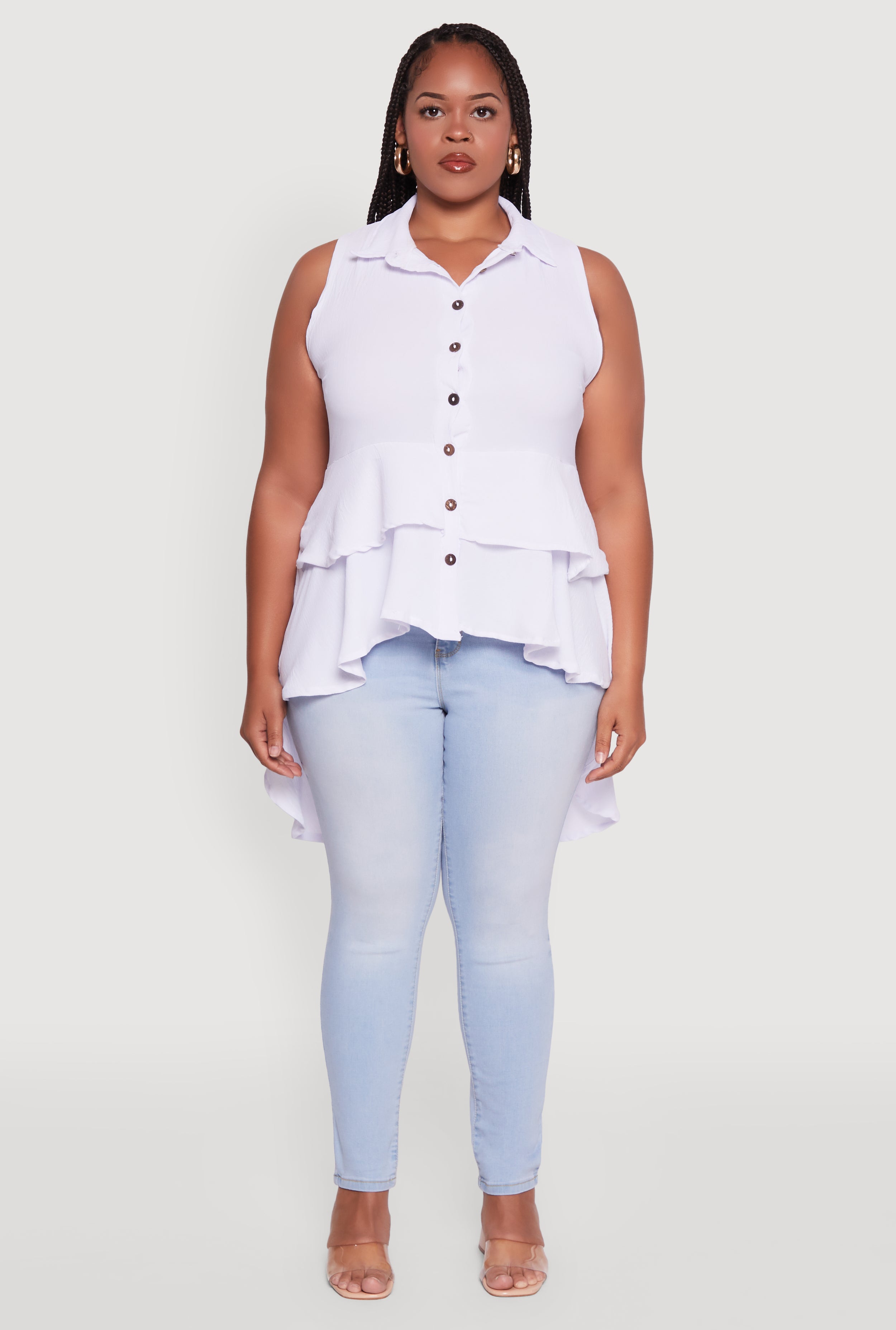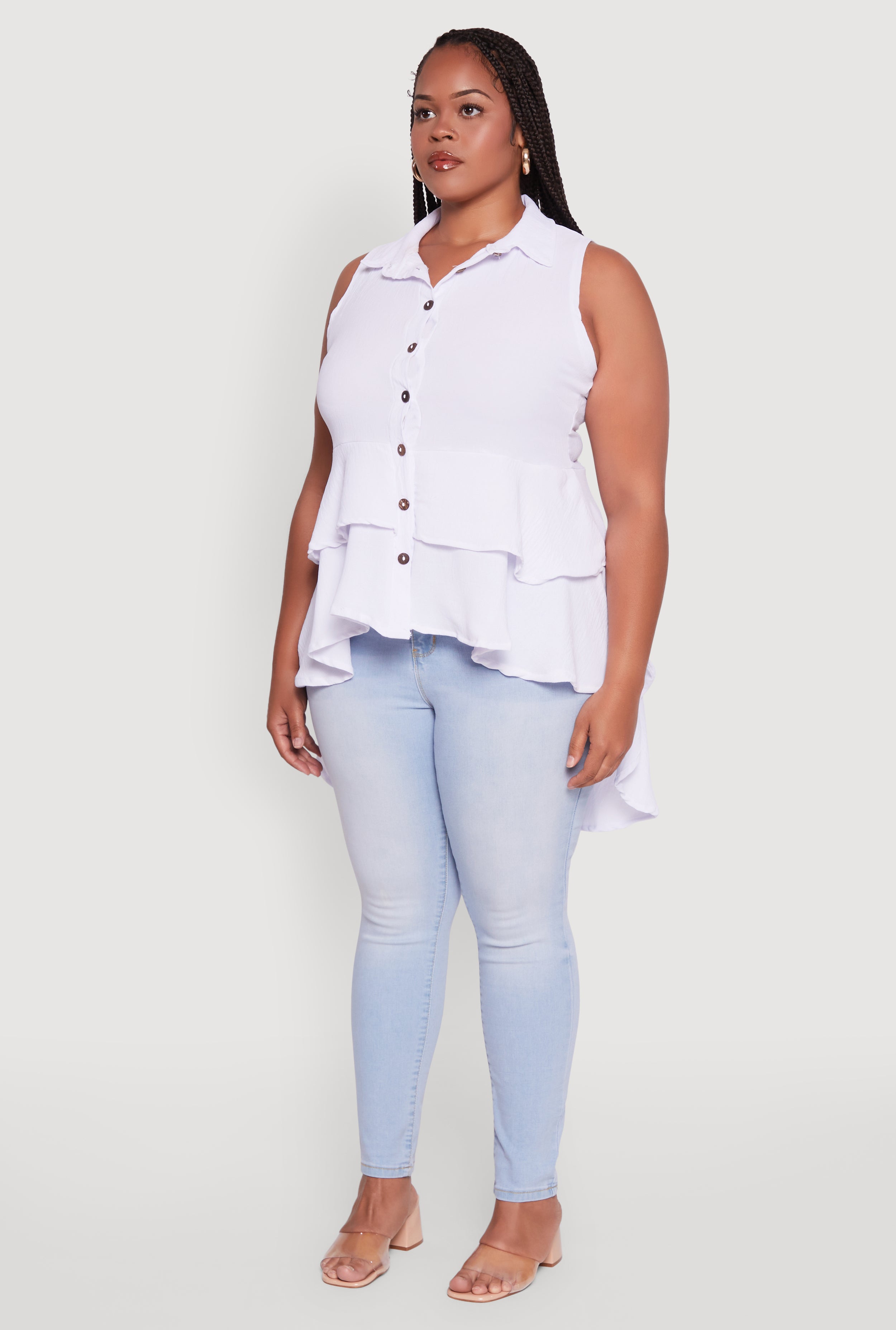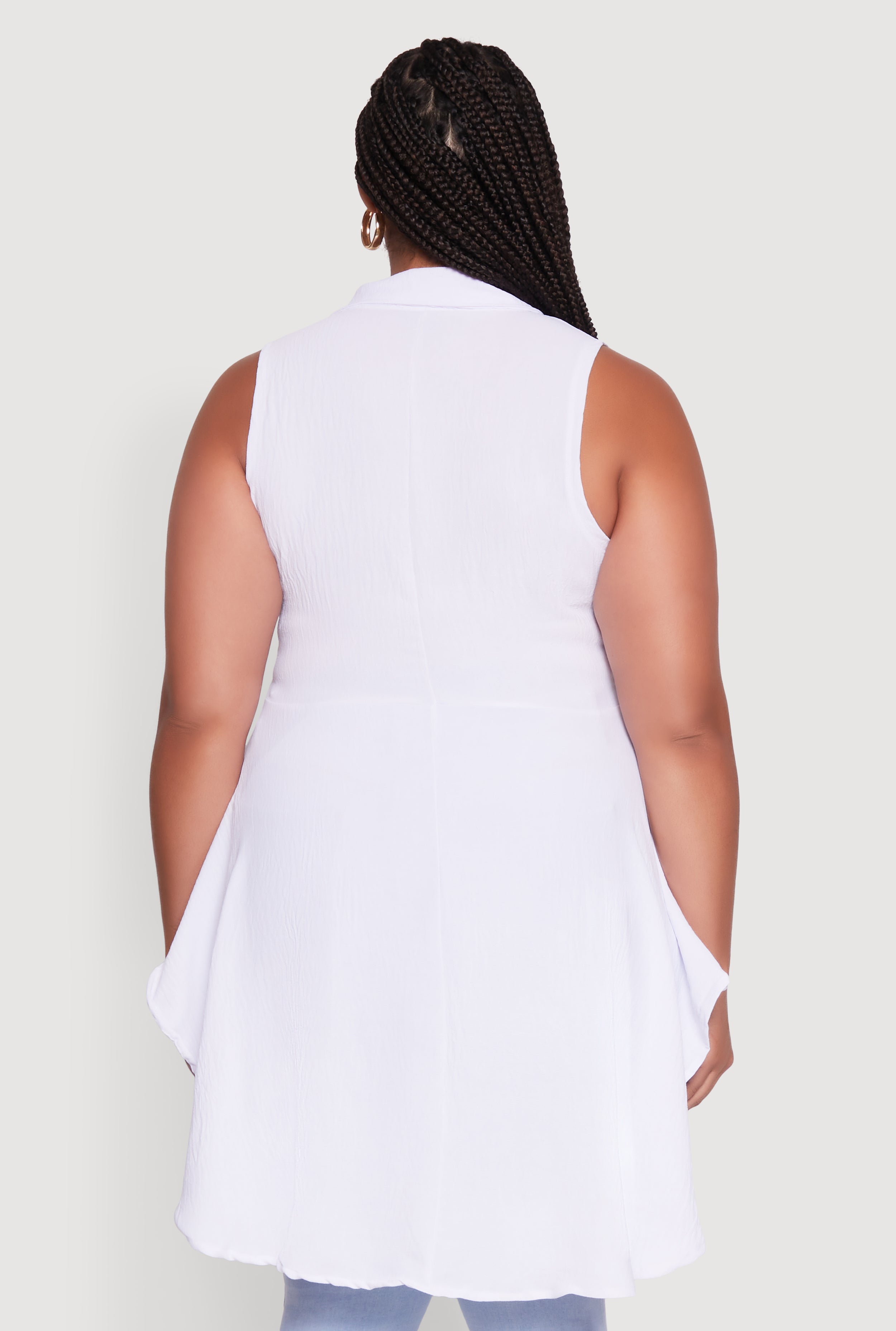 Step up your style game with this Plus Size Crepe Knit Sleeveless Tiered Shirt. Designed with a classic fit and a chic shirt collar, it effortlessly blends office-ready vibes with casual comfort. The tiered layers add a playful touch to your look, making it perfect for those days when you want to feel put-together but still relaxed. Lightweight crepe knit fabric keeps you cool and confident, whether you're conquering meetings or weekend hangouts.